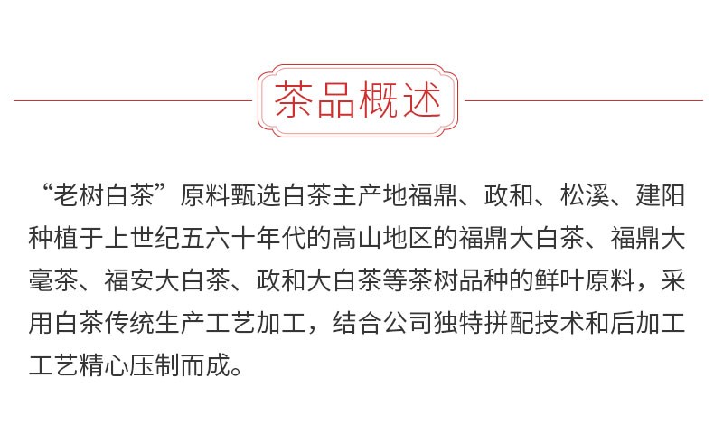 “老树白茶”原料精选白茶主产地福鼎、政和、松溪、建阳种植于上世纪五六十年代的高山地区的福鼎大白茶、福鼎大毫茶、福安大白茶、政和大白茶等茶树品种的鲜叶原料,采用白茶传统生产工艺加工,结合公司独特拼配技术和后加工工艺精心压制而成。