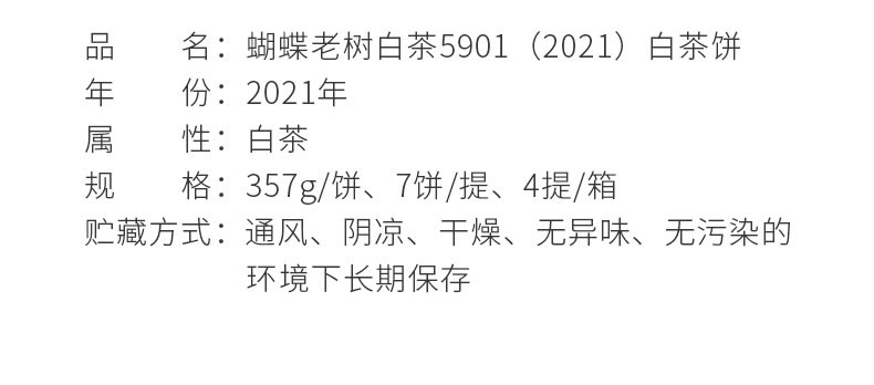 | 品名 | 蝴蝶老树白茶5901(2021)白茶饼 |