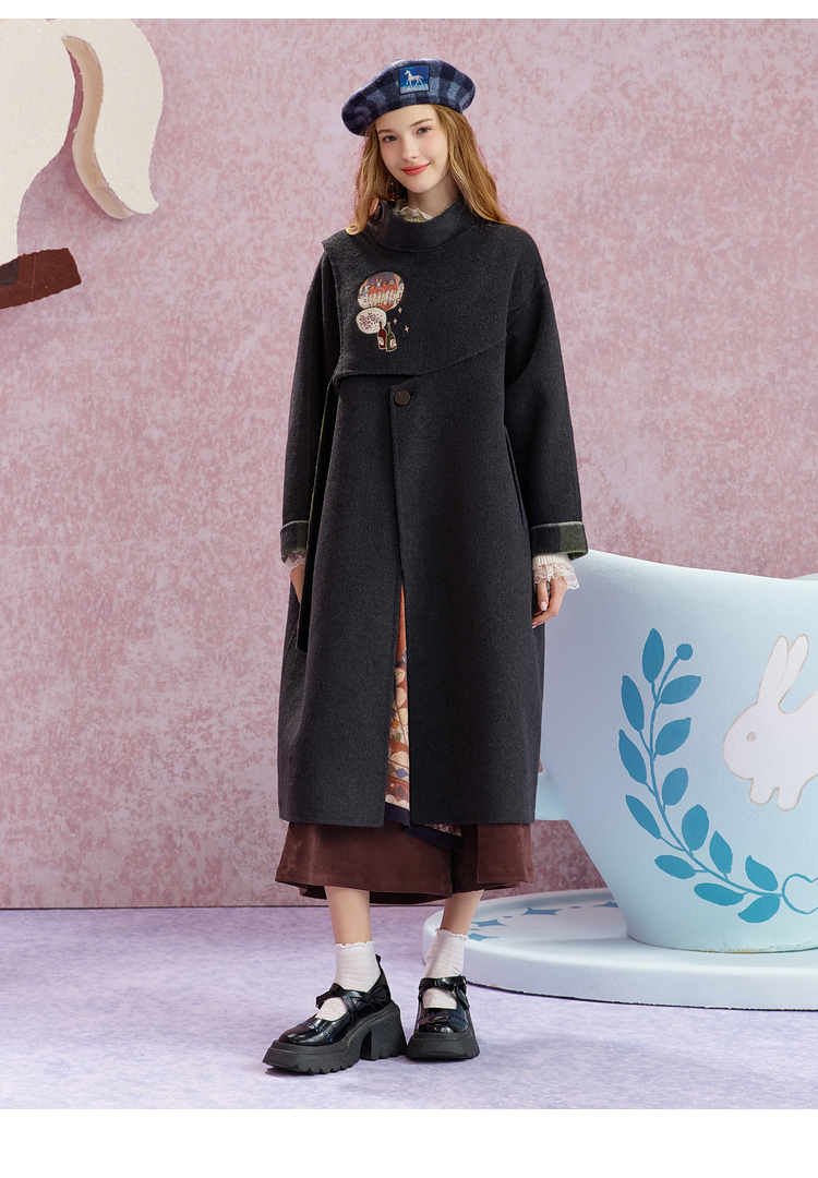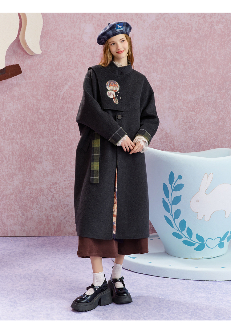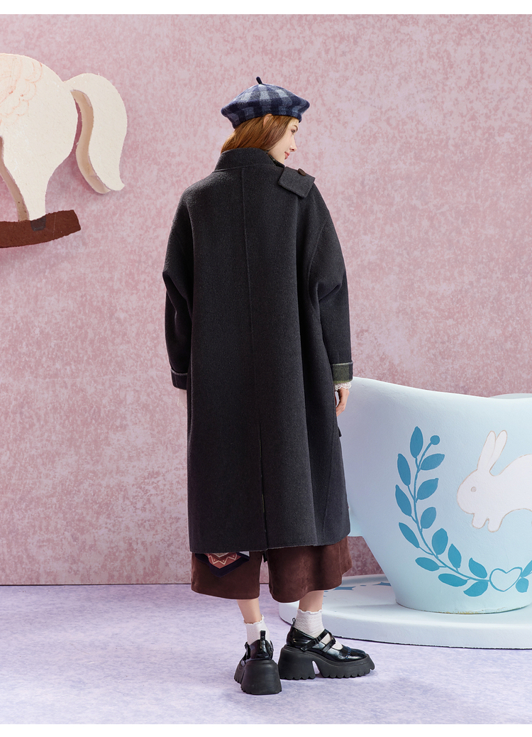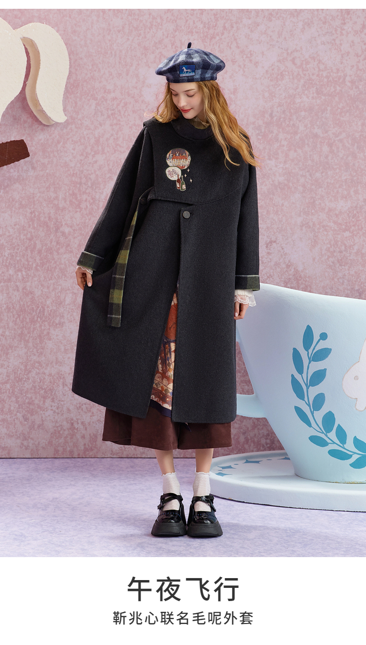 【暖冬内购】两三事午夜飞行2025秋冬新款复古印花贴布绣格子双面羊毛呢外套女
