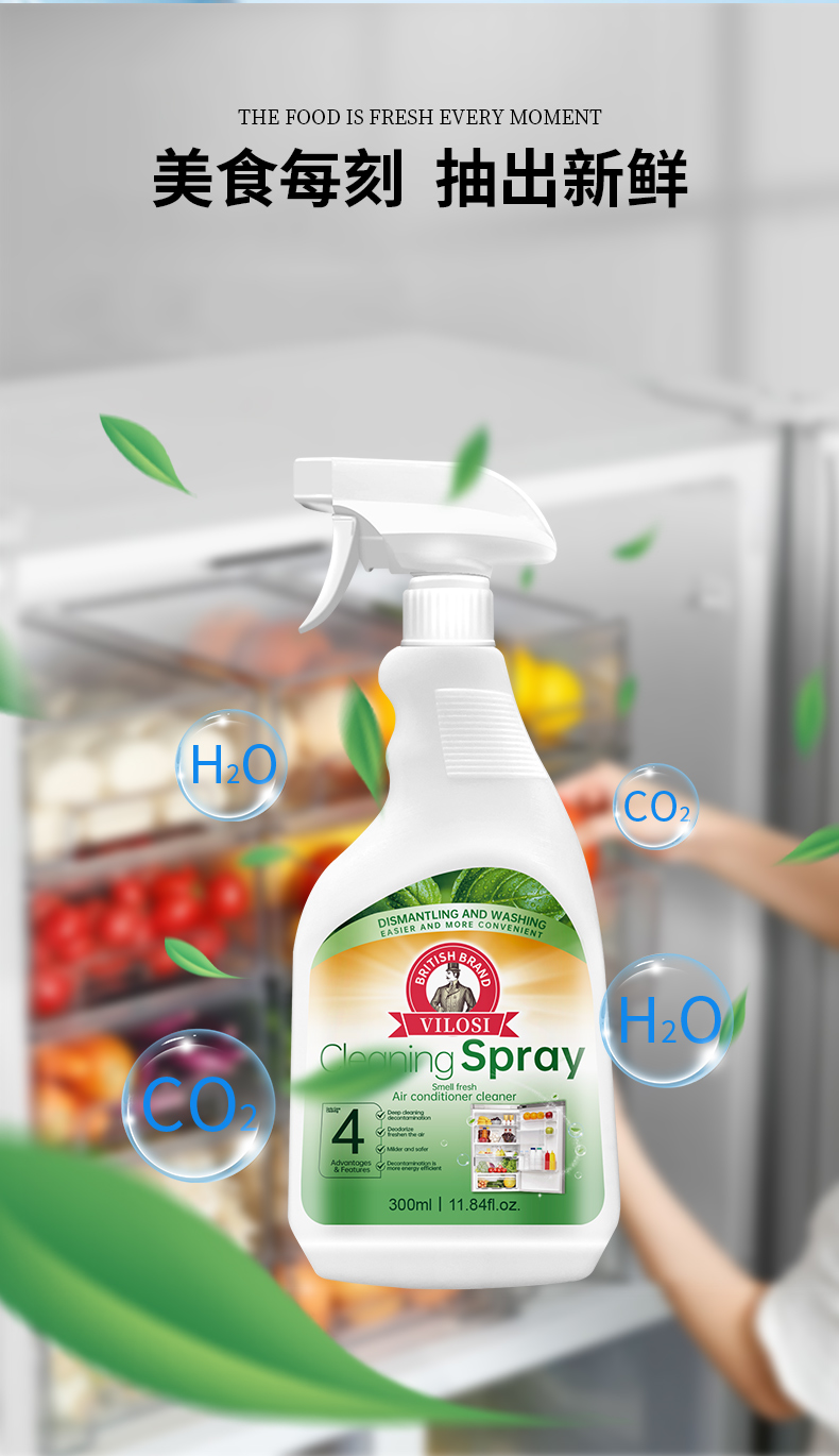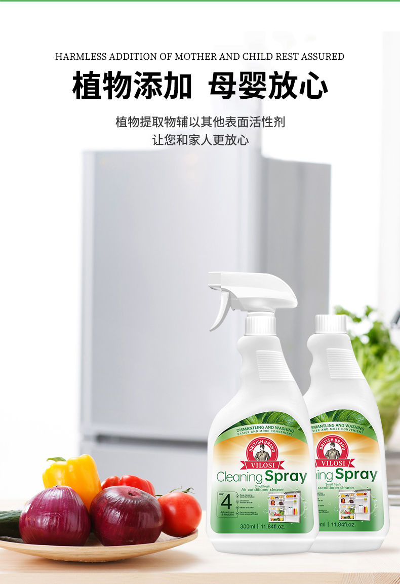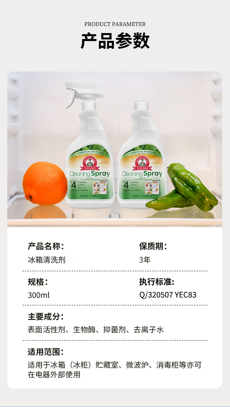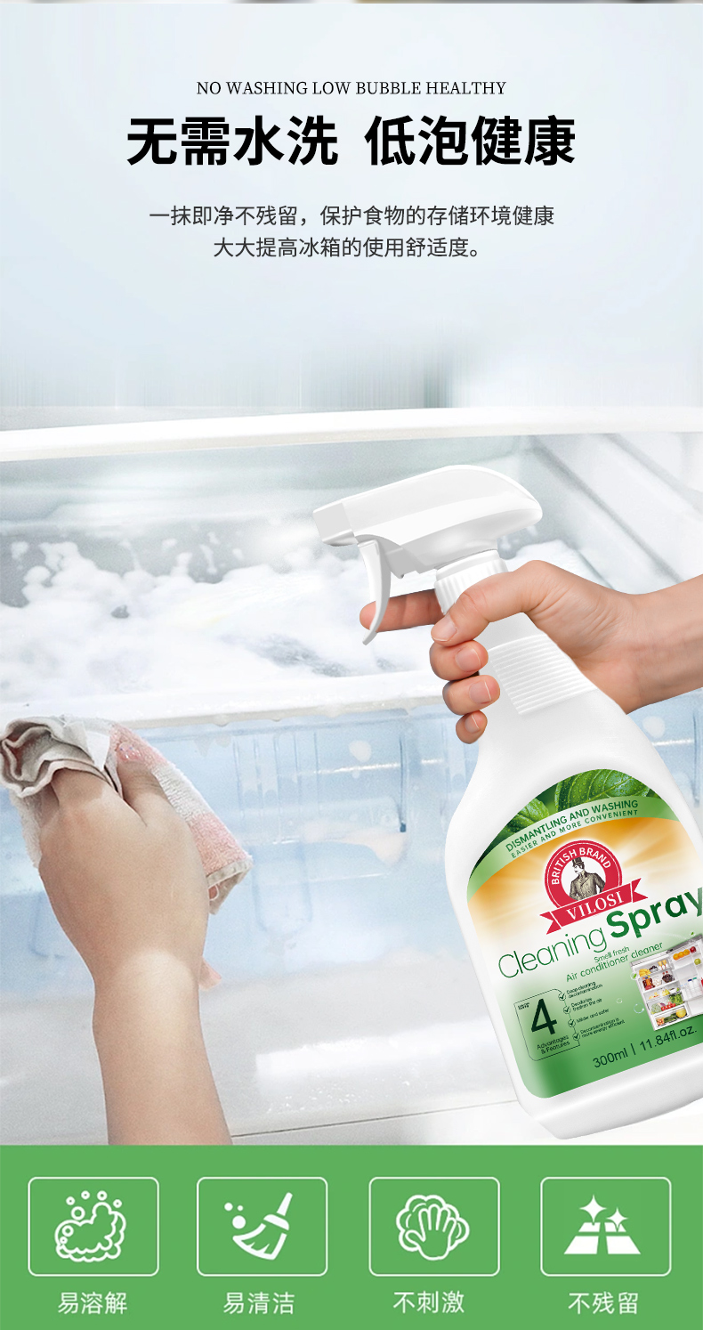 英国vilosi 冰箱清洗剂300ml/瓶 添加生物酶,清洁干净;植物添加,母婴放心用,健康无害;无需用水,长效防护,净化异味,清洁抑jun。