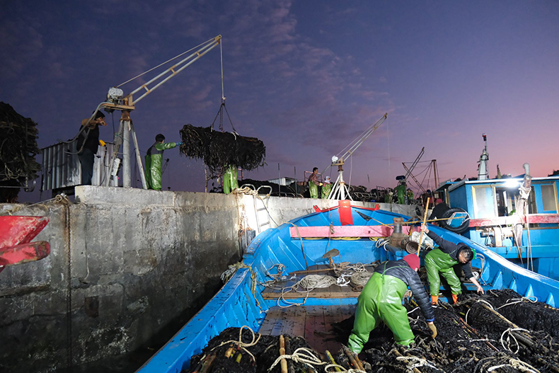 渔民凌晨2点左右出海,6点左右上岸。收割紫菜回来就开始跟时间赛跑。紫菜收割后经过淡水清洗,再摆盘烤干,我们只要整个过程不超过4个小时的紫菜,这样能最大程度锁住紫菜的口感和鲜度。