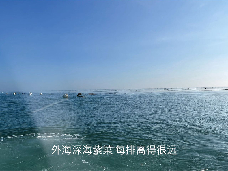 我们的紫菜都养在无污染的外海,种植密度很低,风浪大,海水很清澈很干净。这样的海域长出来的紫菜口感更好,品质更佳,这也是渔民冒着生命危险不在滩涂种植紫菜的原因。
