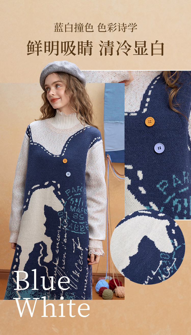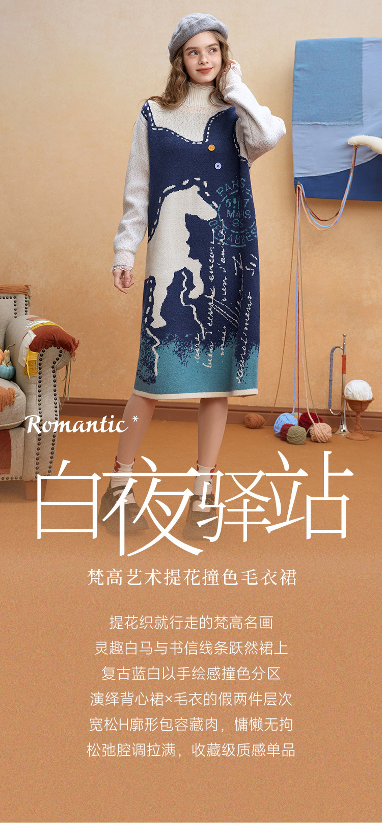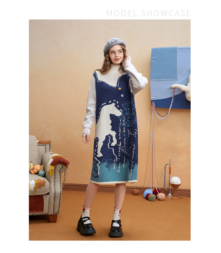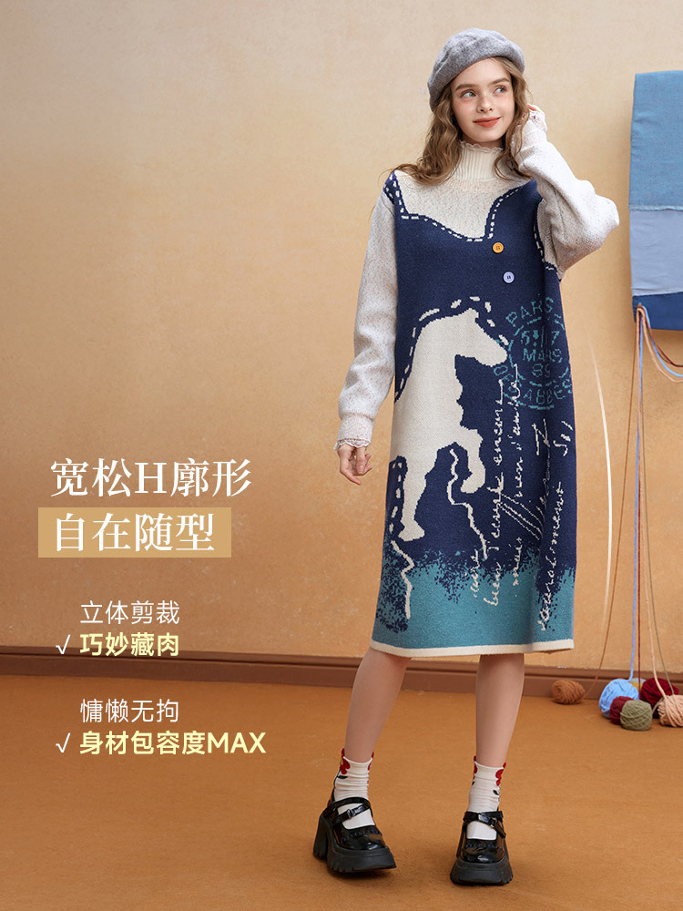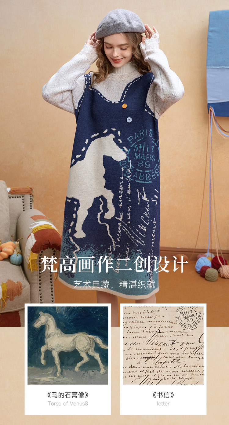 两三事梵高文艺白夜驿站2025冬新款撞色纽扣小马图案假两件连衣裙
