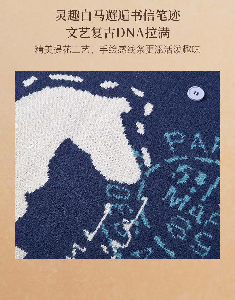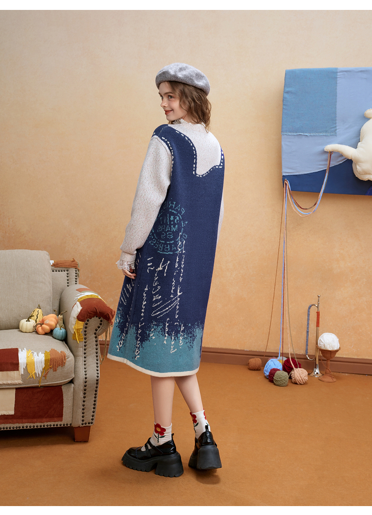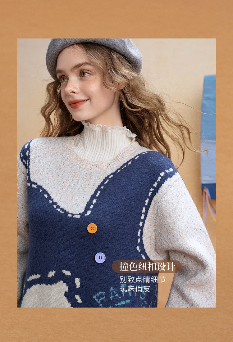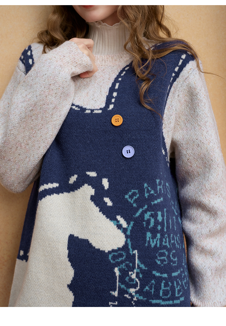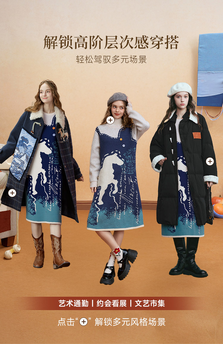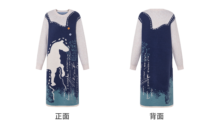 两三事梵高文艺白夜驿站2025冬新款撞色纽扣小马图案假两件连衣裙