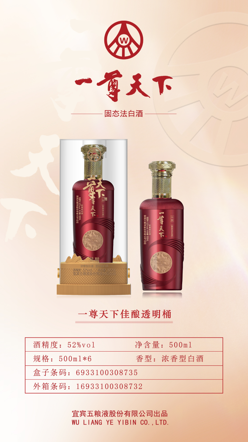 五粮液股份公司出品 一尊天下佳酿透明桶 52度浓香型白酒 整箱500ml*6瓶包邮