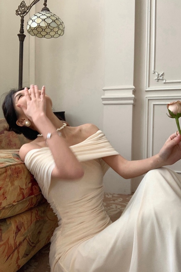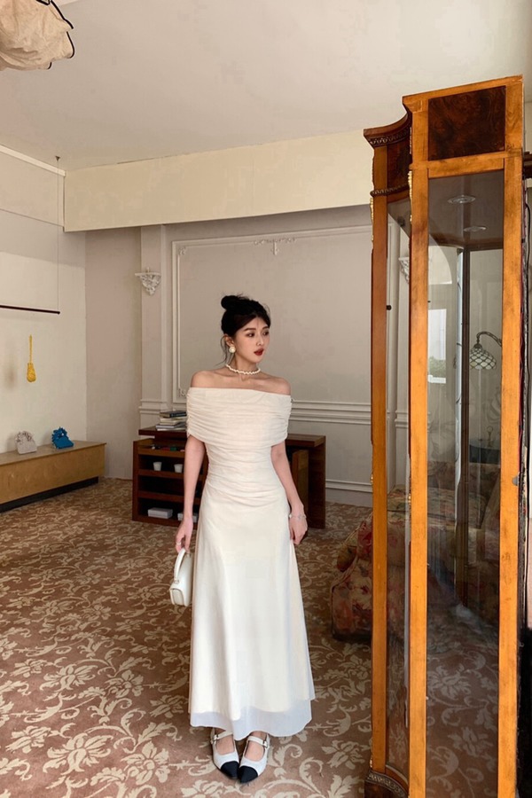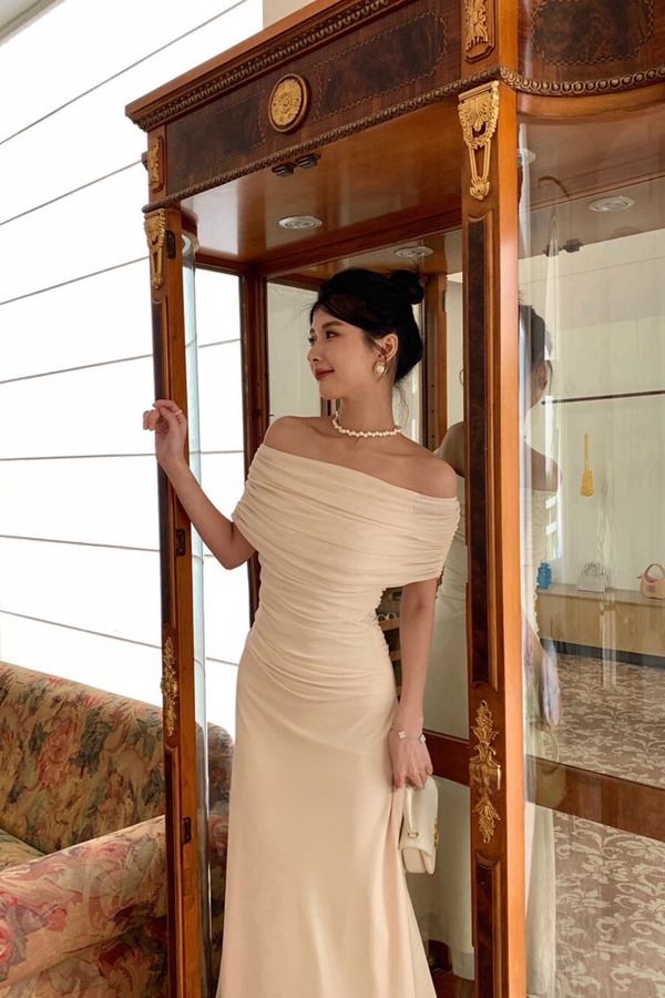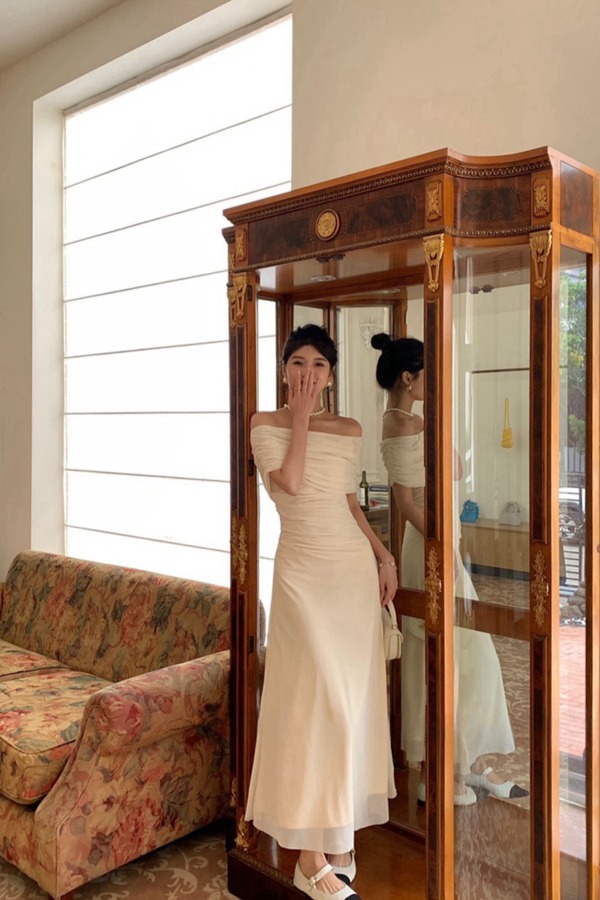 ELLA JADE 米色气质优雅一字肩连衣裙 20219