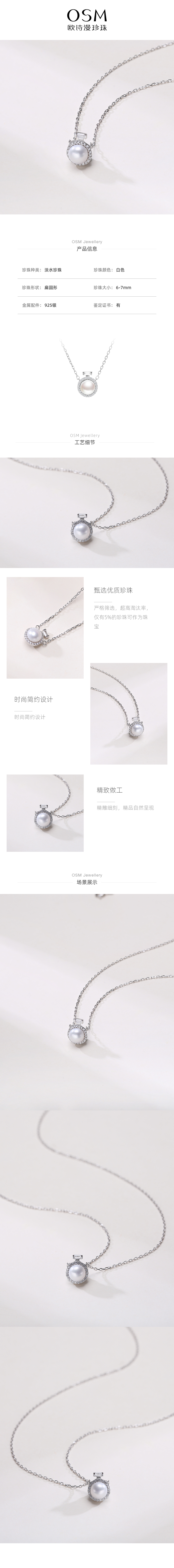 【三枪推荐】欧诗漫珍珠 白色天然珍珠吊坠大颗淡水项链S925银6~7mm 沁心银色