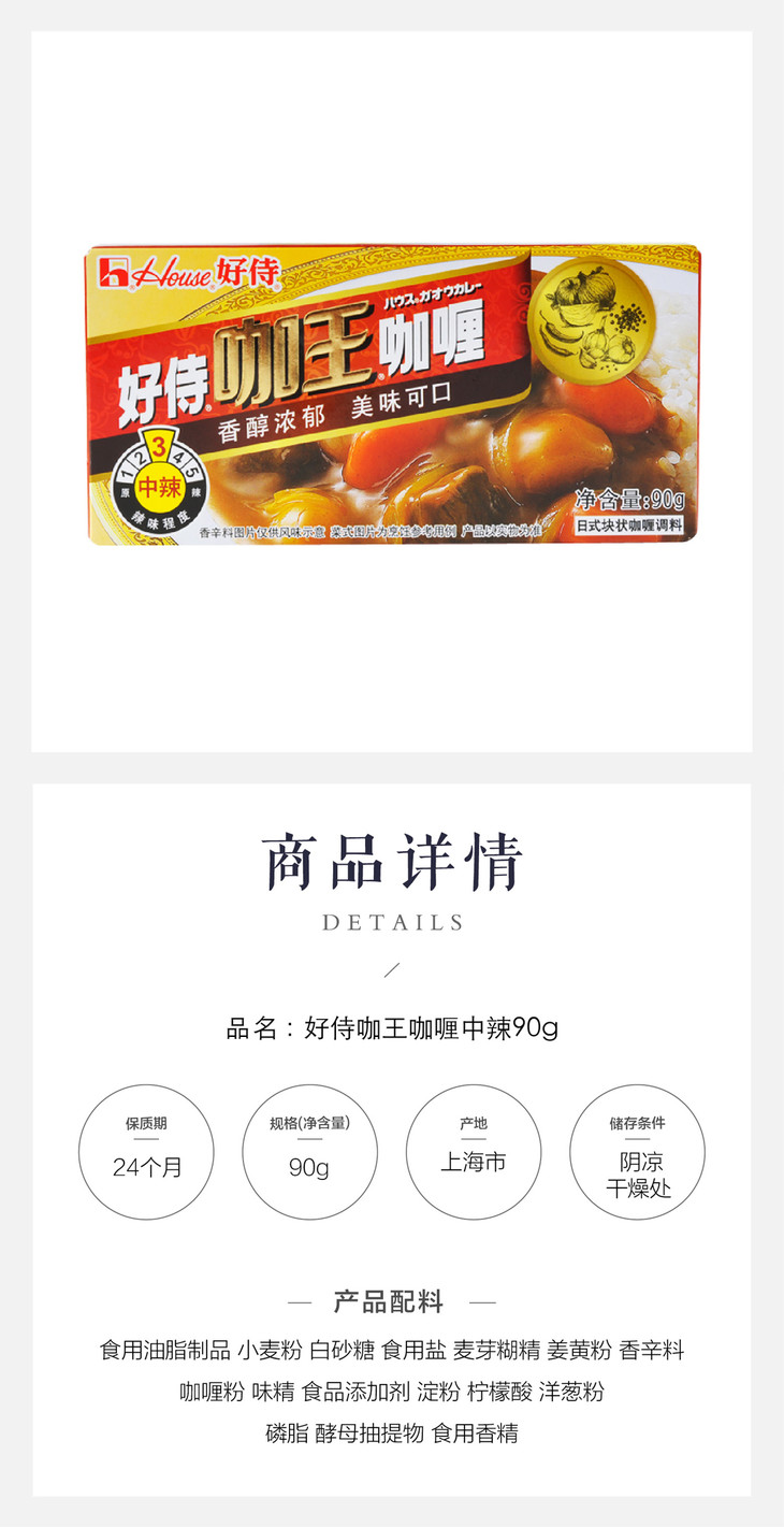 好侍(House) 中辣咖王咖喱(块状咖喱调料、非即食) 90g