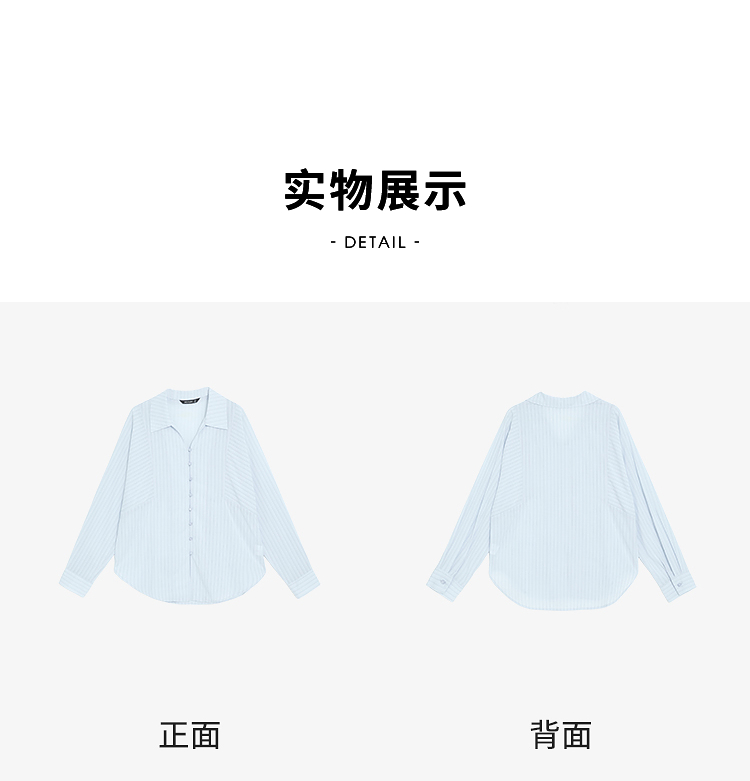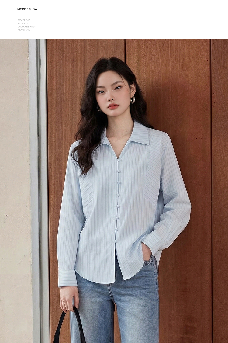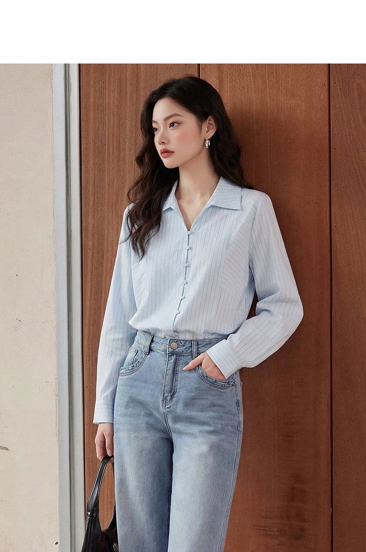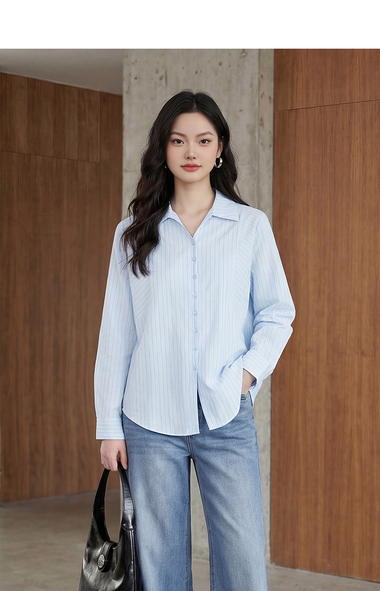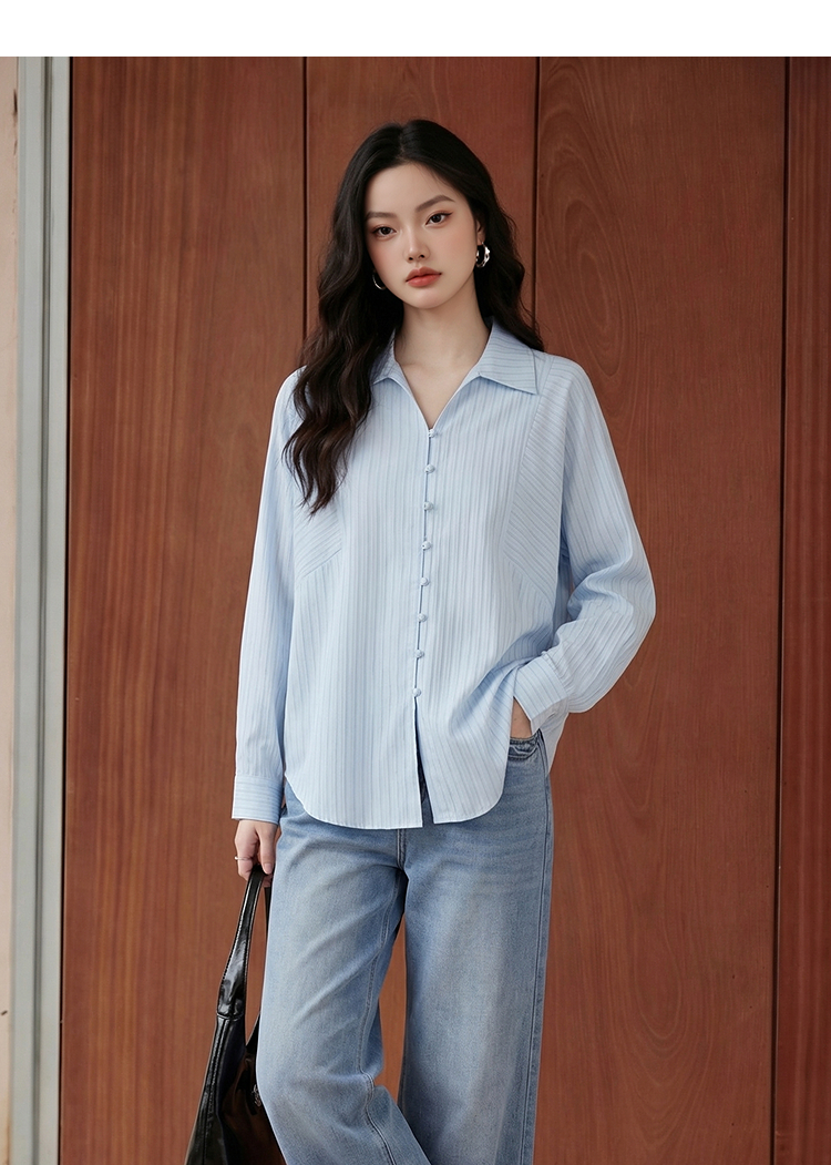 【限时秒杀】西遇浅蓝细条纹翻领衬衫女2026春季新款宽松显瘦V领长袖通勤衬衣10260084