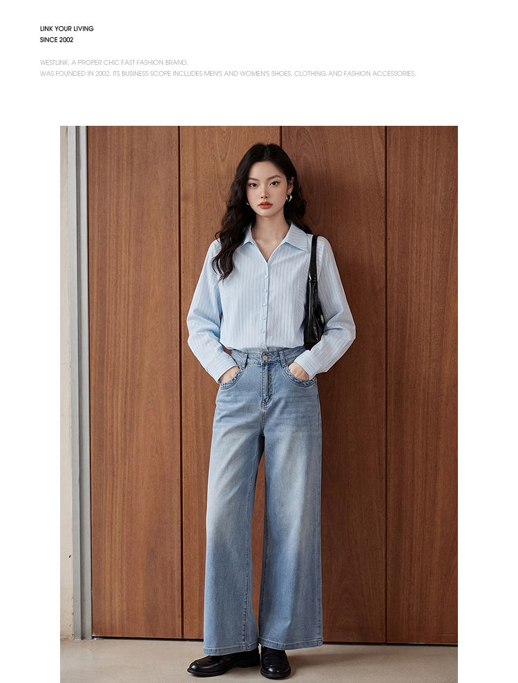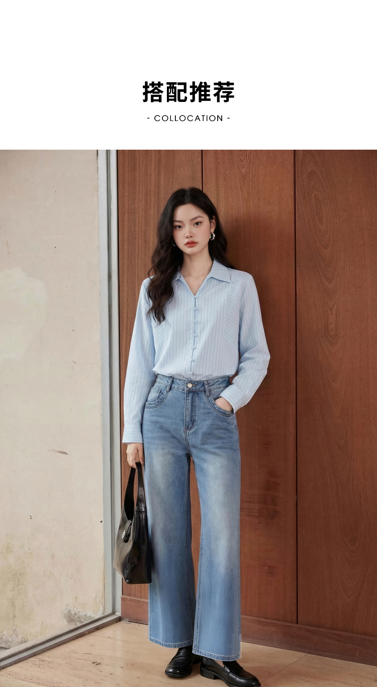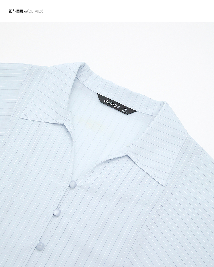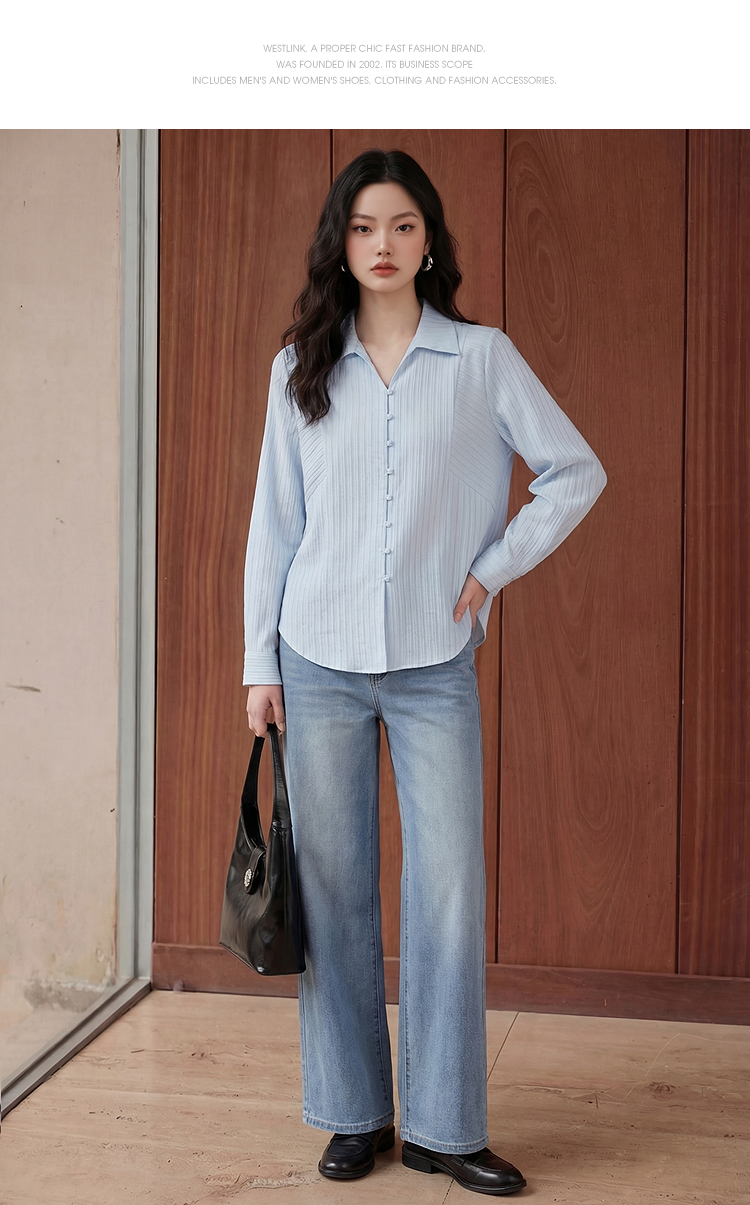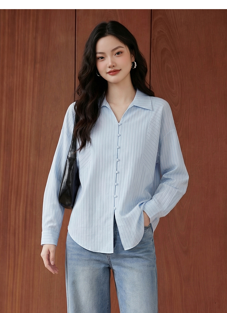 【限时秒杀】西遇浅蓝细条纹翻领衬衫女2026春季新款宽松显瘦V领长袖通勤衬衣10260084