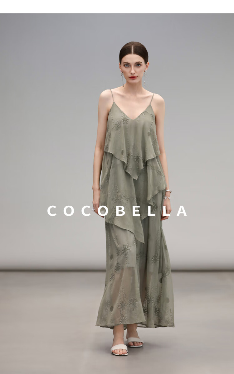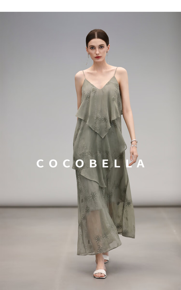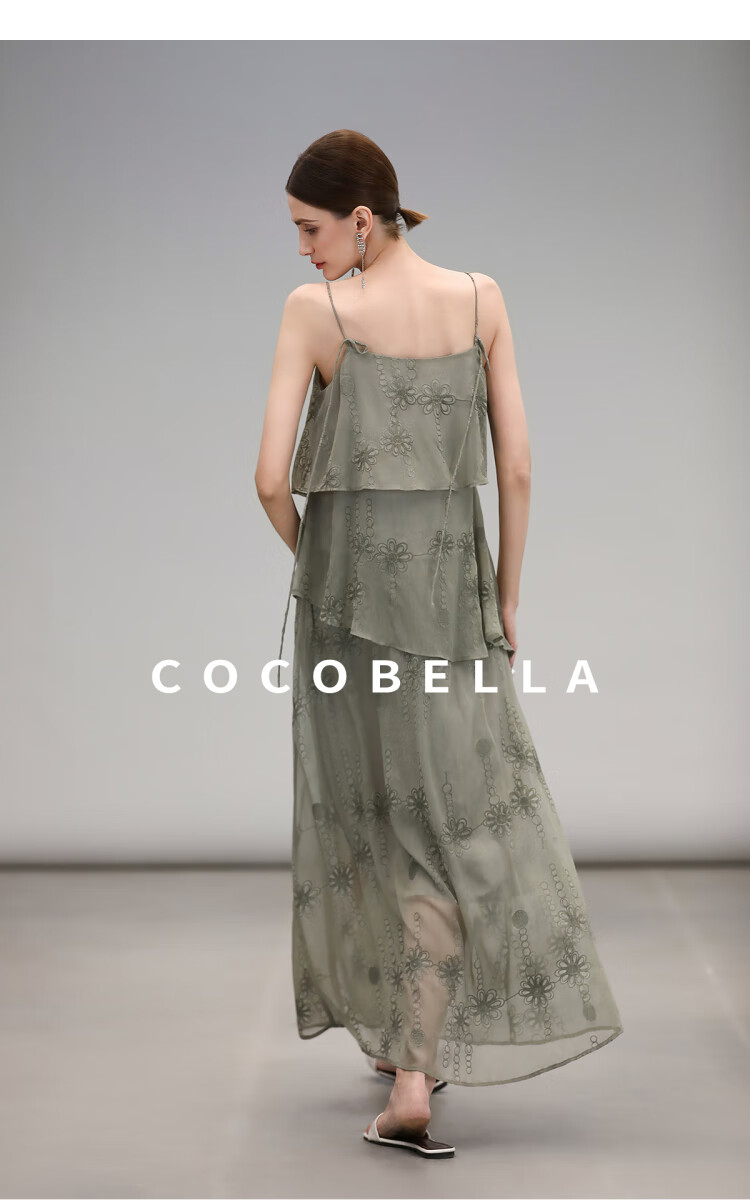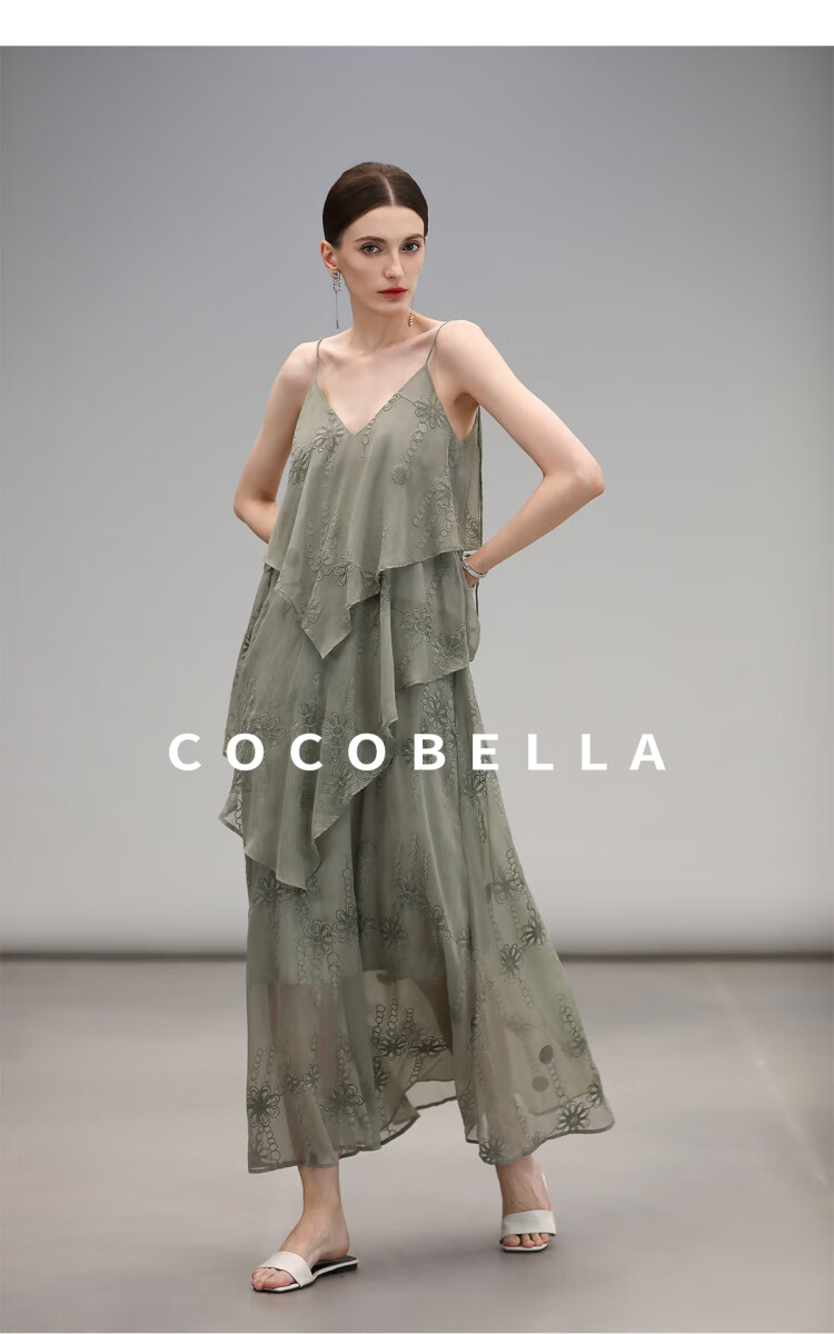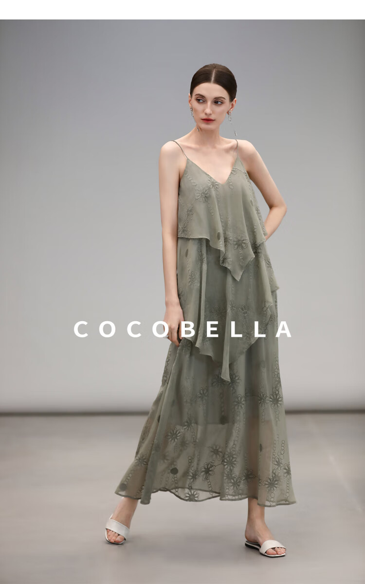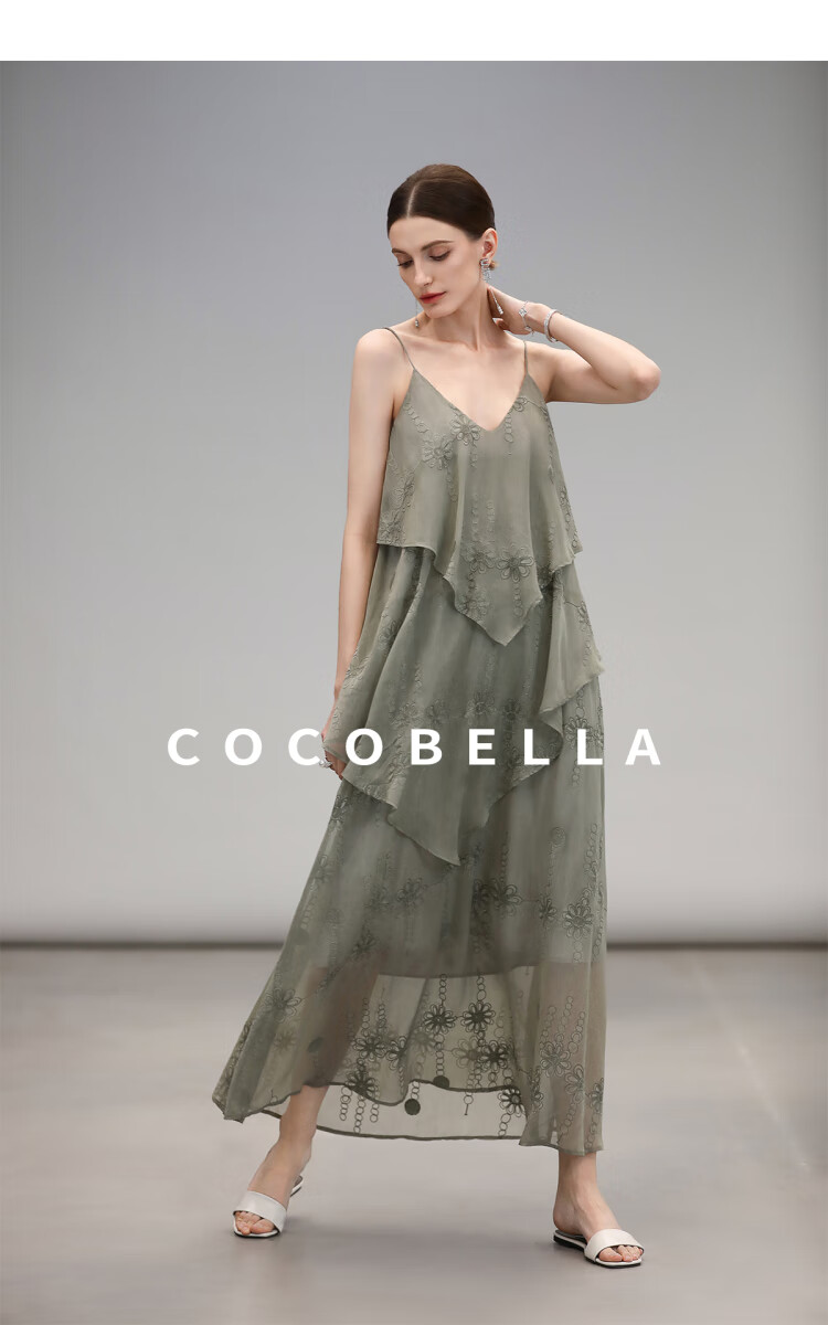 【限时秒杀】COCOBELLA万针刺绣炒色薄荷曼波吊带裙度假风飘逸大摆长裙FR7068