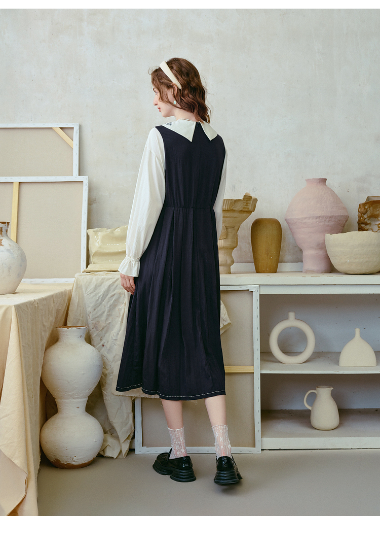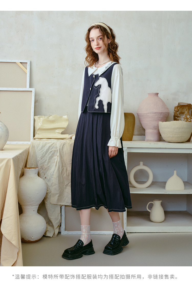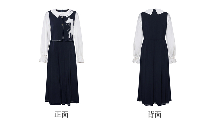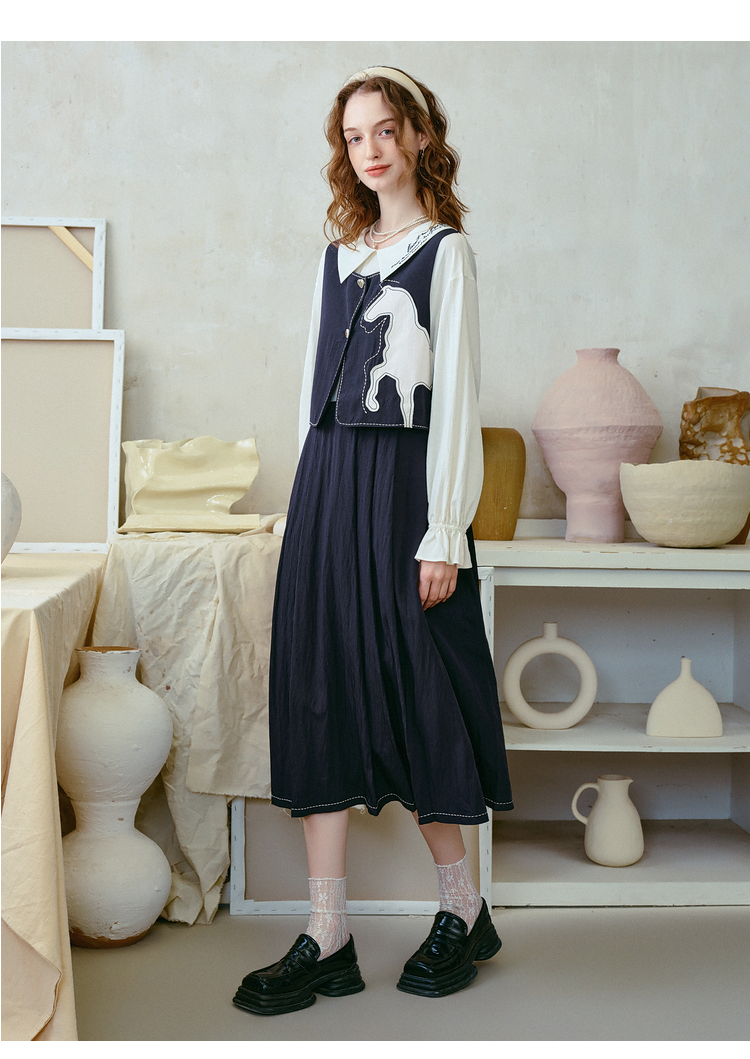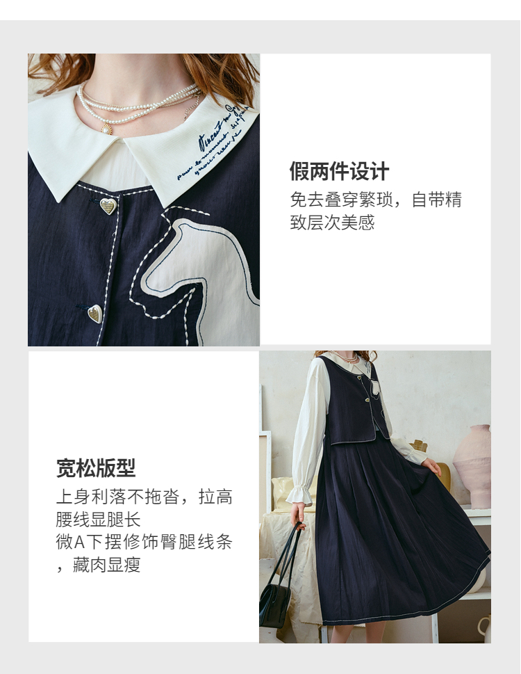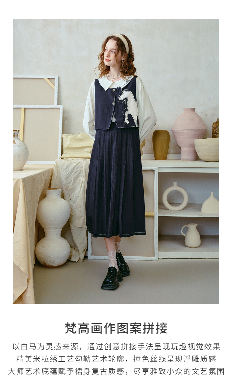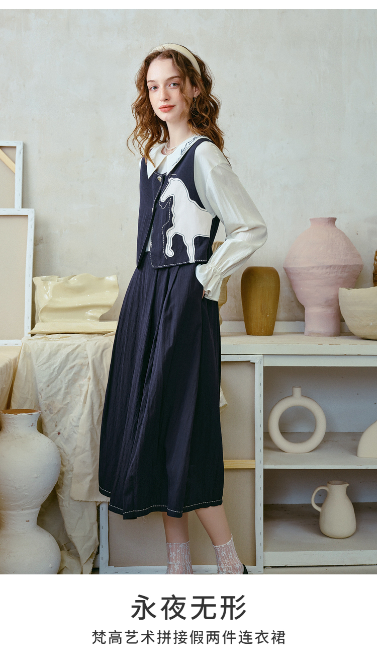 两三事梵高文艺 永夜无形 2026春季新款复古贴布绣假两件连衣裙