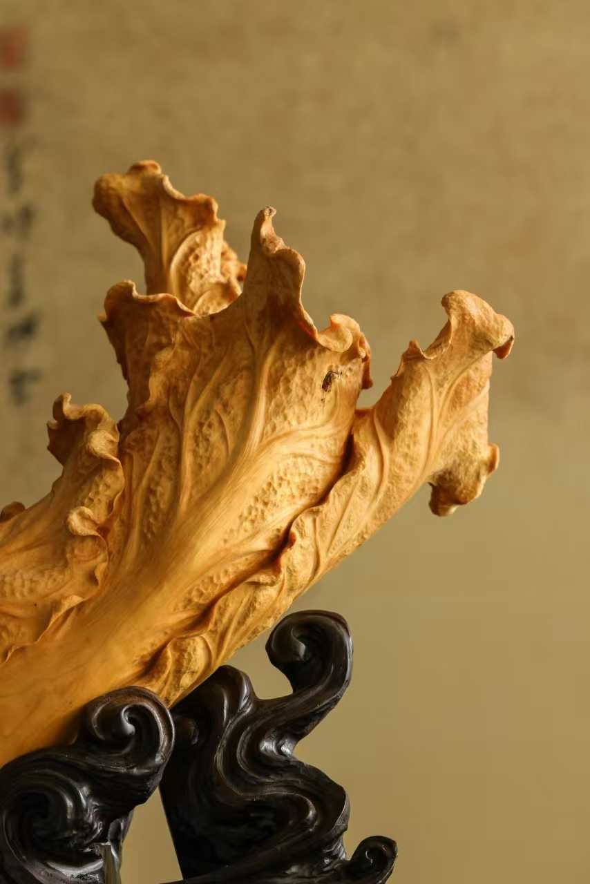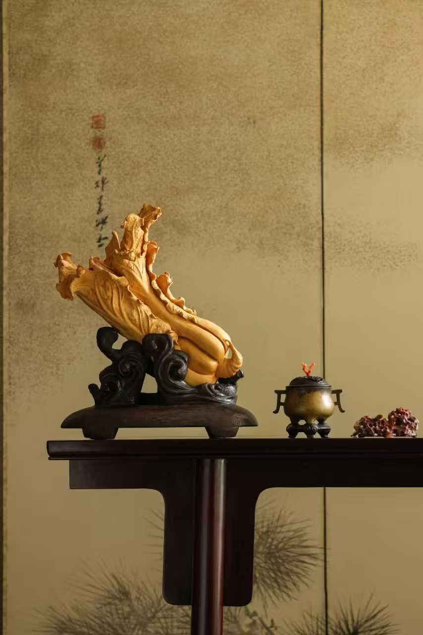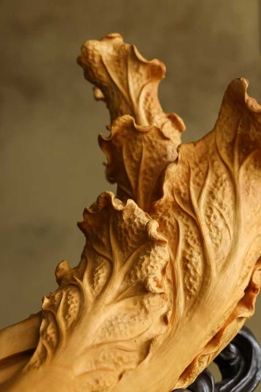 料质干净,色丽如金,琢刻细腻写实,白菜肌理清晰,片片舒卷自然,气状饱满富贵,盎然生机清趣,陈置案头,祝颂百财临门。