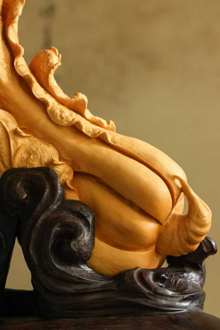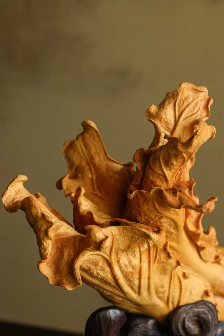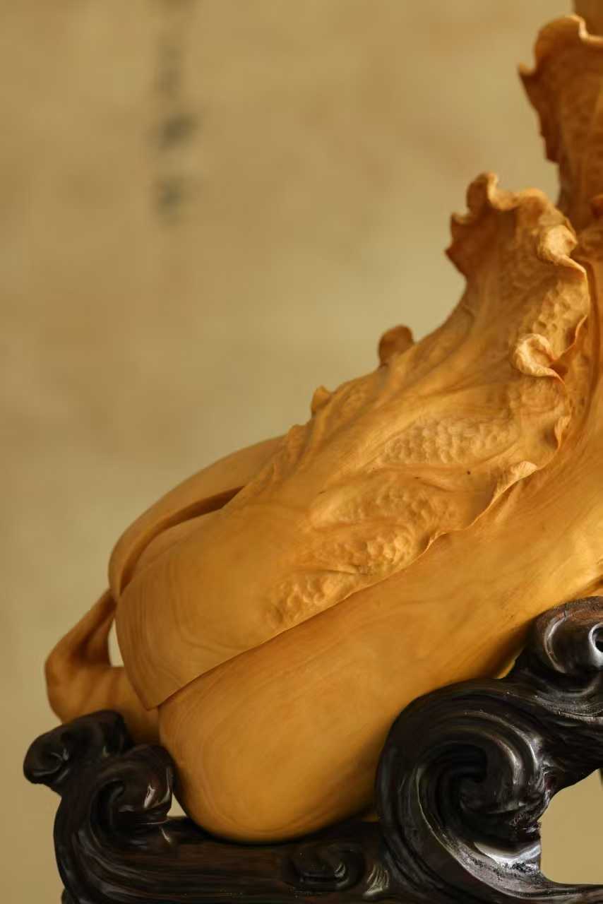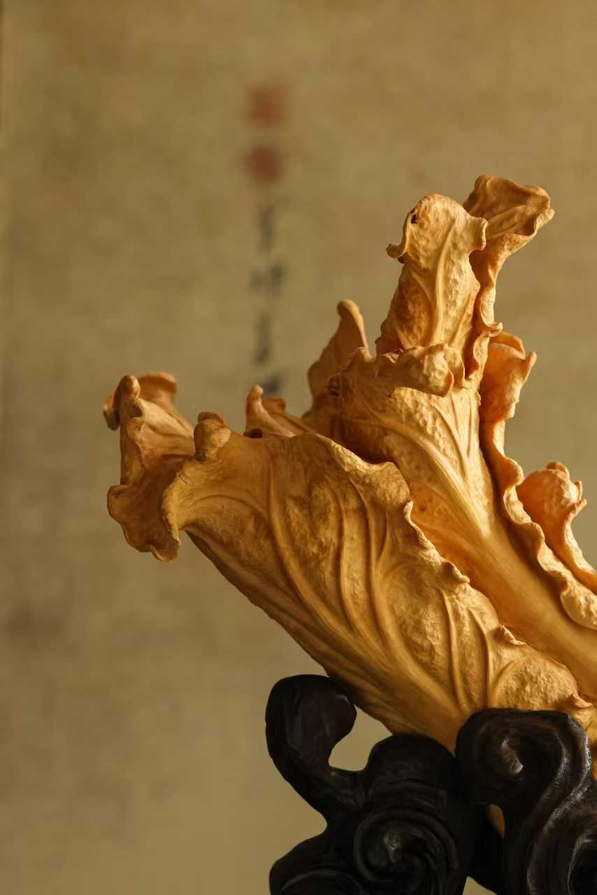 料质干净,色丽如金,琢刻细腻写实,白菜肌理清晰,片片舒卷自然,气状饱满富贵,盎然生机清趣,陈置案头,祝颂百财临门。