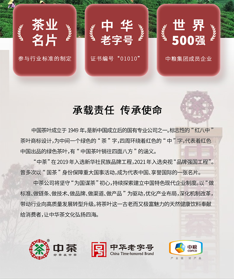 - 中茶是中粮集团十八个专业化公司之一和集团重点打造的十二条粮油食品产业链之一。中国茶叶以继承和发展中华传统茶文化为使命,秉承自然、生态、安全、健康的理念。