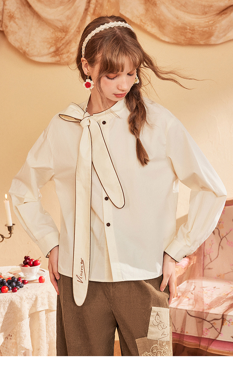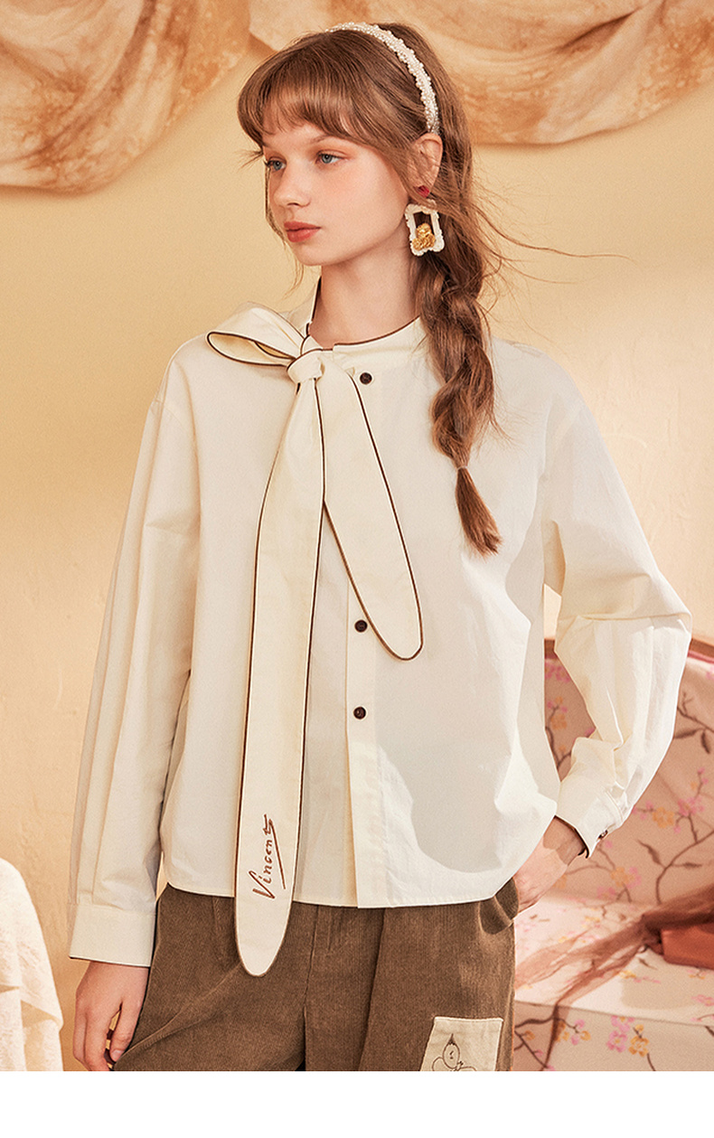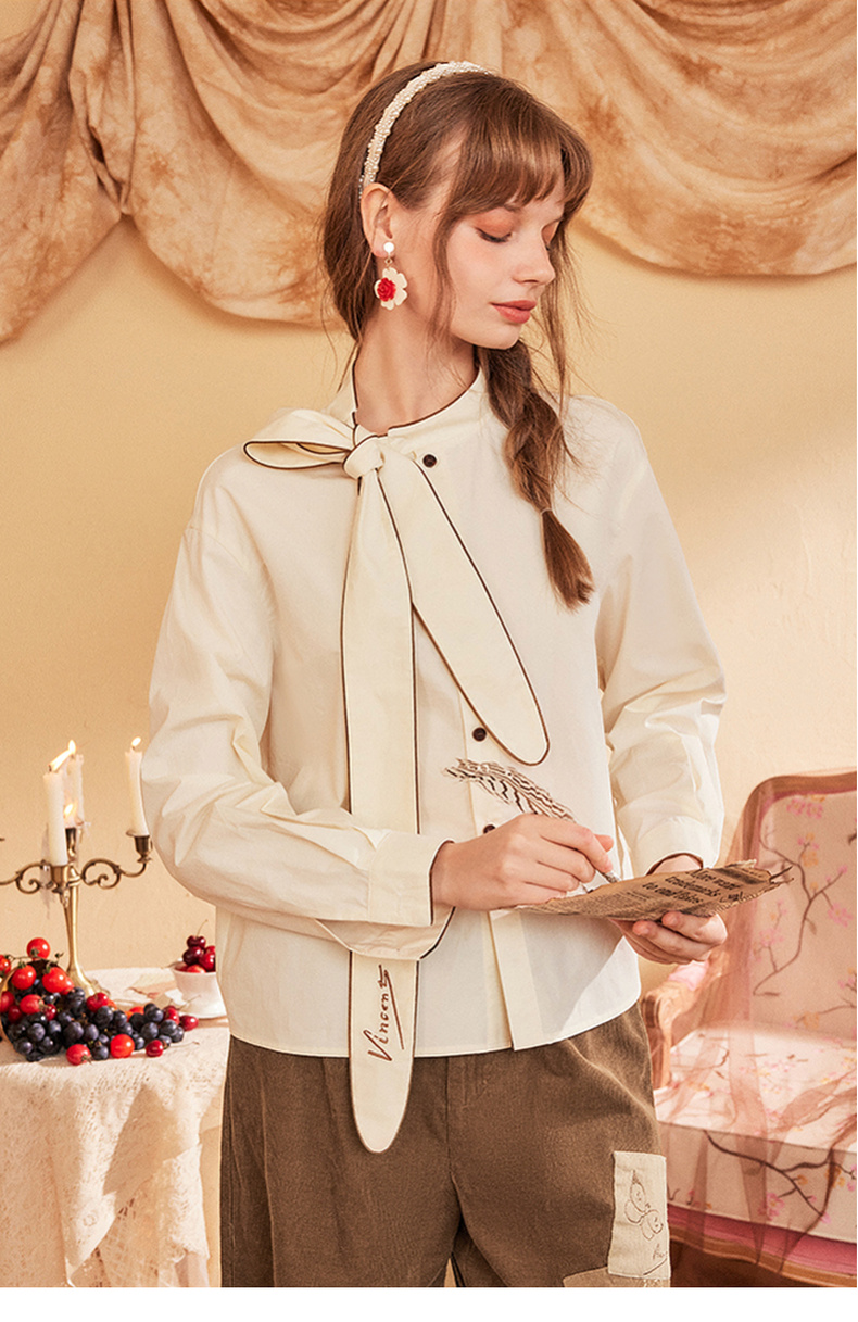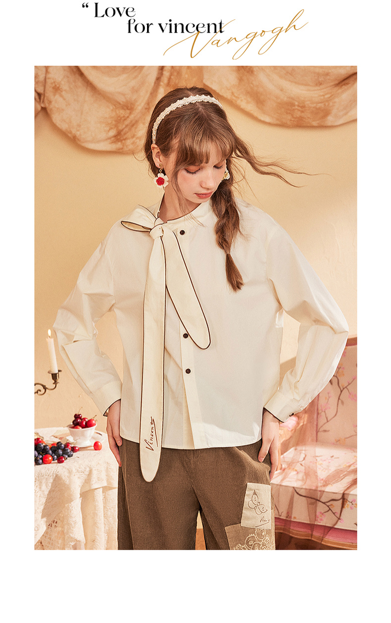两三事梵高文艺光遇旅人2024秋季新款字母刺绣绑带领衬衫女宽松