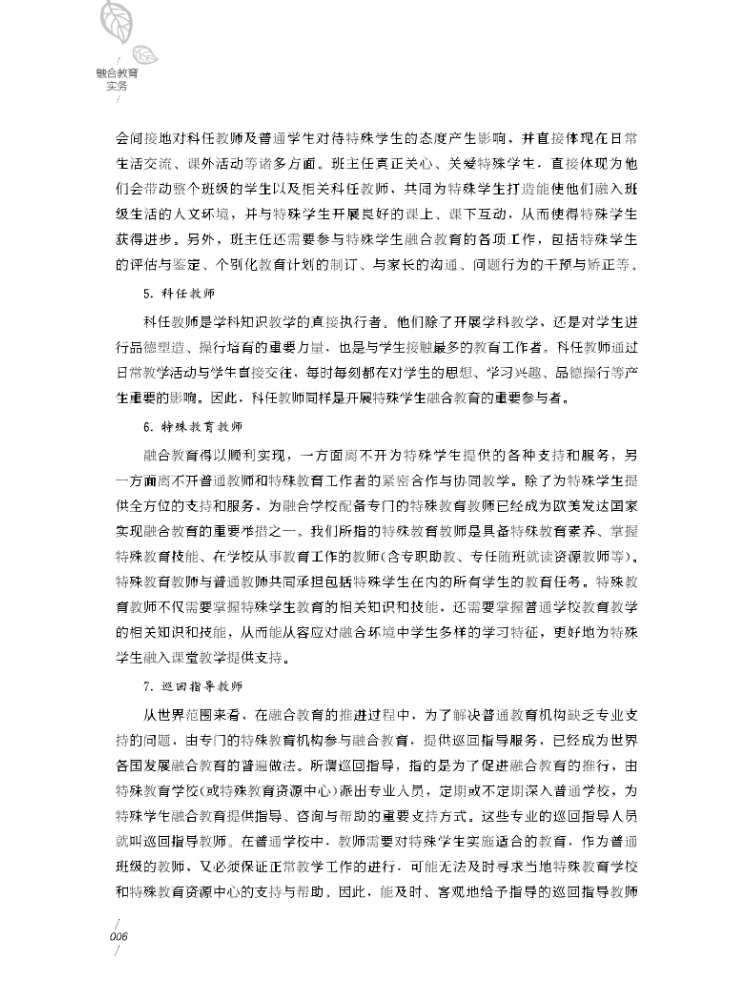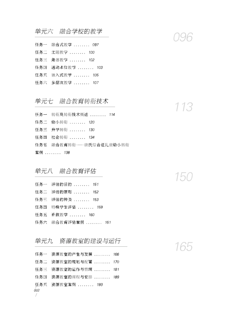 本书主要设计了融合教育支持系统的建立、融合教育学校的管理、融合班师资及其管理、融合班的行为管理、融合班的课程设计与调整、融合学校的教学、融合教育转衔技术、融合教育评估、资源教室的建设与运行、辅具技术等十个单元介绍了融合教育工作的方方面面,通过技术与案例相结合,帮助读者掌握融合教育基本技术,有较强的可读性与操作性。