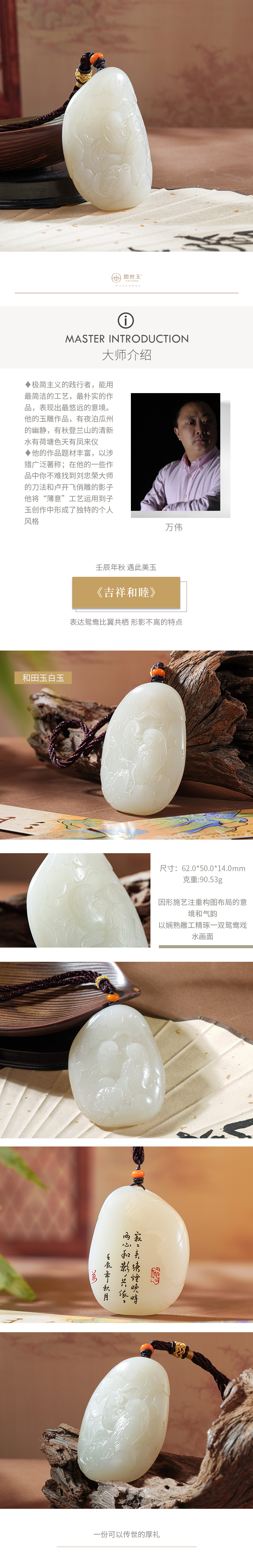 新疆国玉盟世玉和田玉 万伟作品 白玉把件 鸳鸯【带证书·顺丰物流】