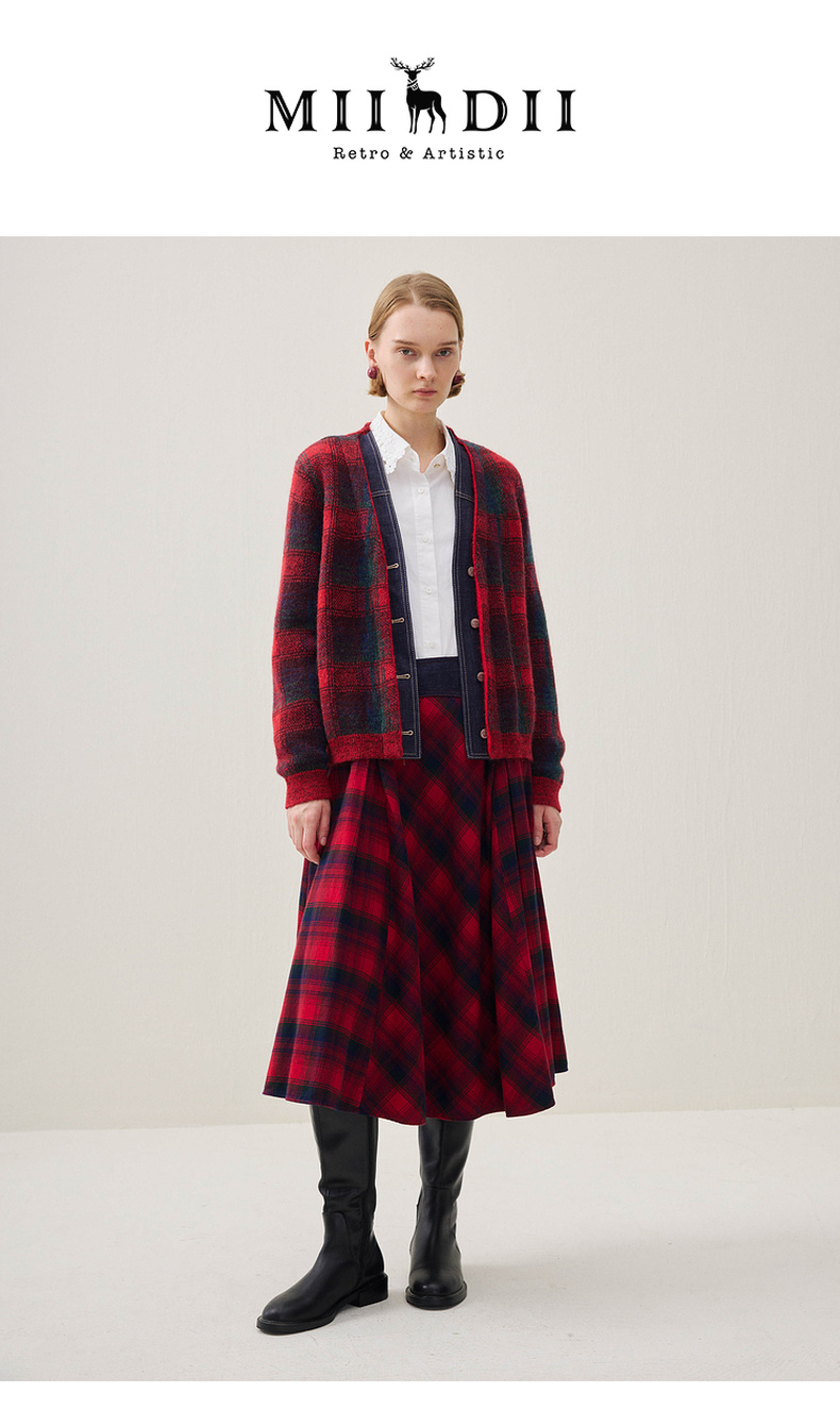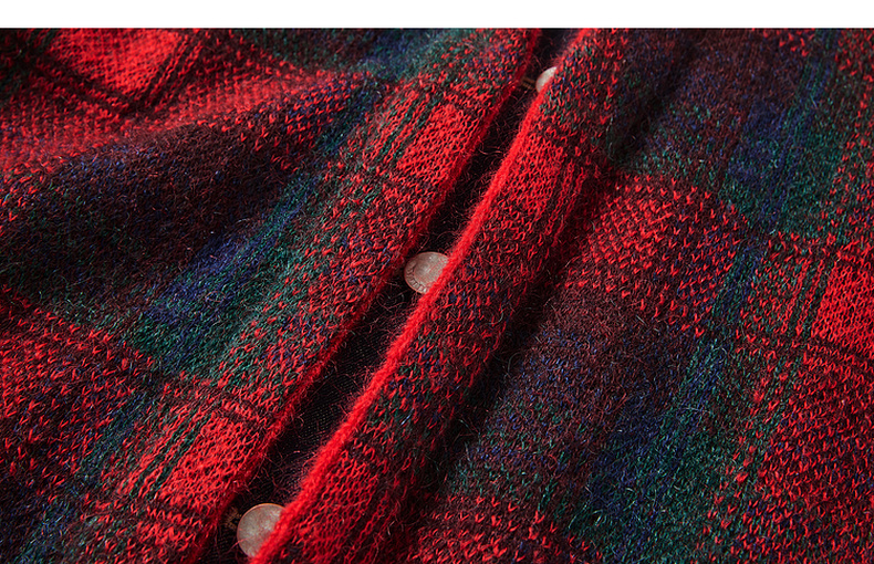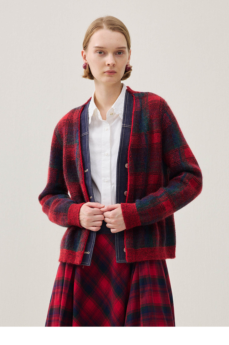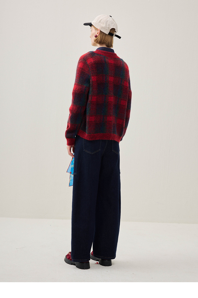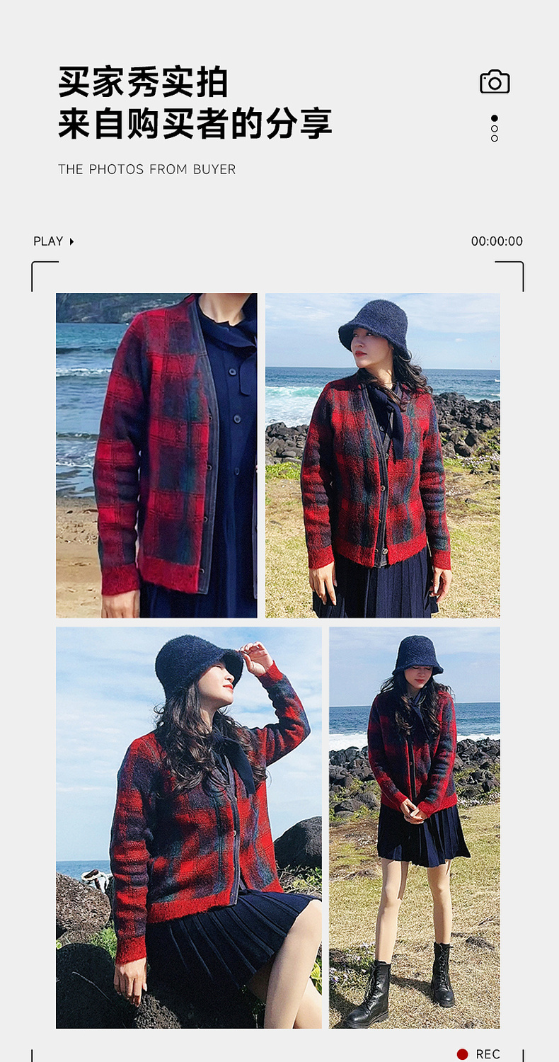 谜底针织开衫长袖2025冬季新品时髦百搭红黑格子毛衫女254MZ1861