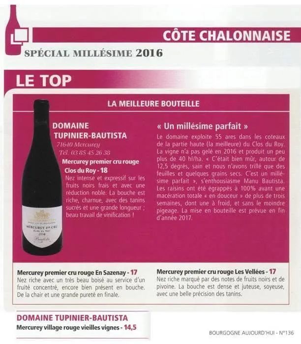 宝缇塔酒庄梅克雷村萨热内 一级葡萄园干红葡萄酒 Domaine Tupinier Bautista Mercurey 1er Cru "En Sazenay" rouge