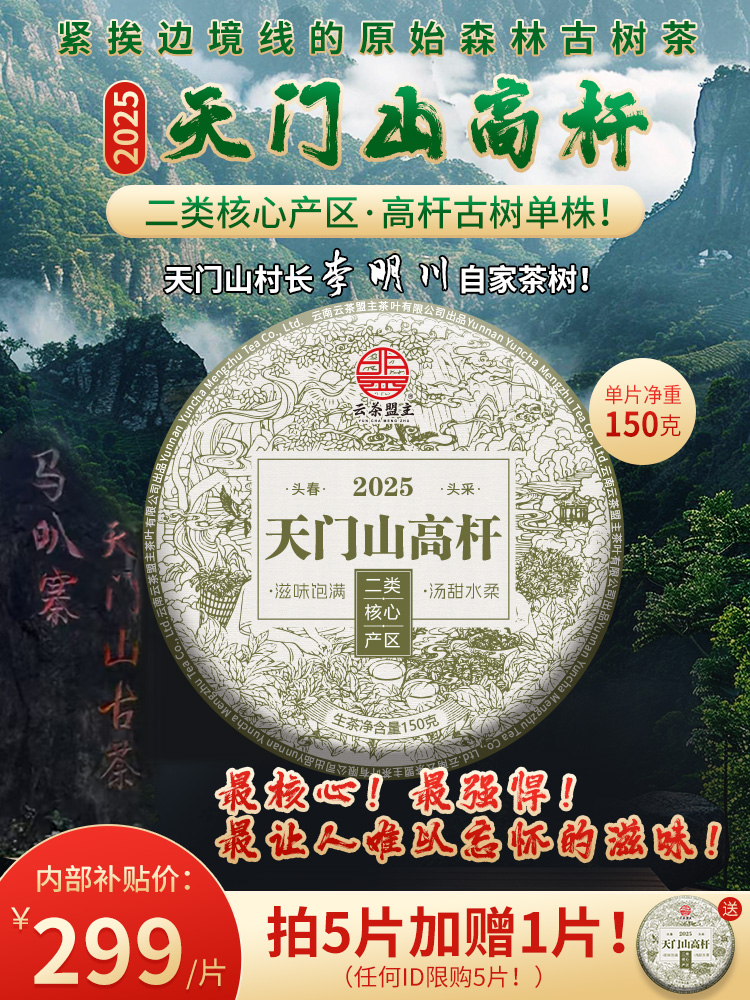 【微量分享】最核心!最强悍!最让人难以忘怀的滋味!天门山村长李明川自家茶树!二类核心产区高杆古树单株!紧挨边境线的原始森林古树茶。150克/盒!