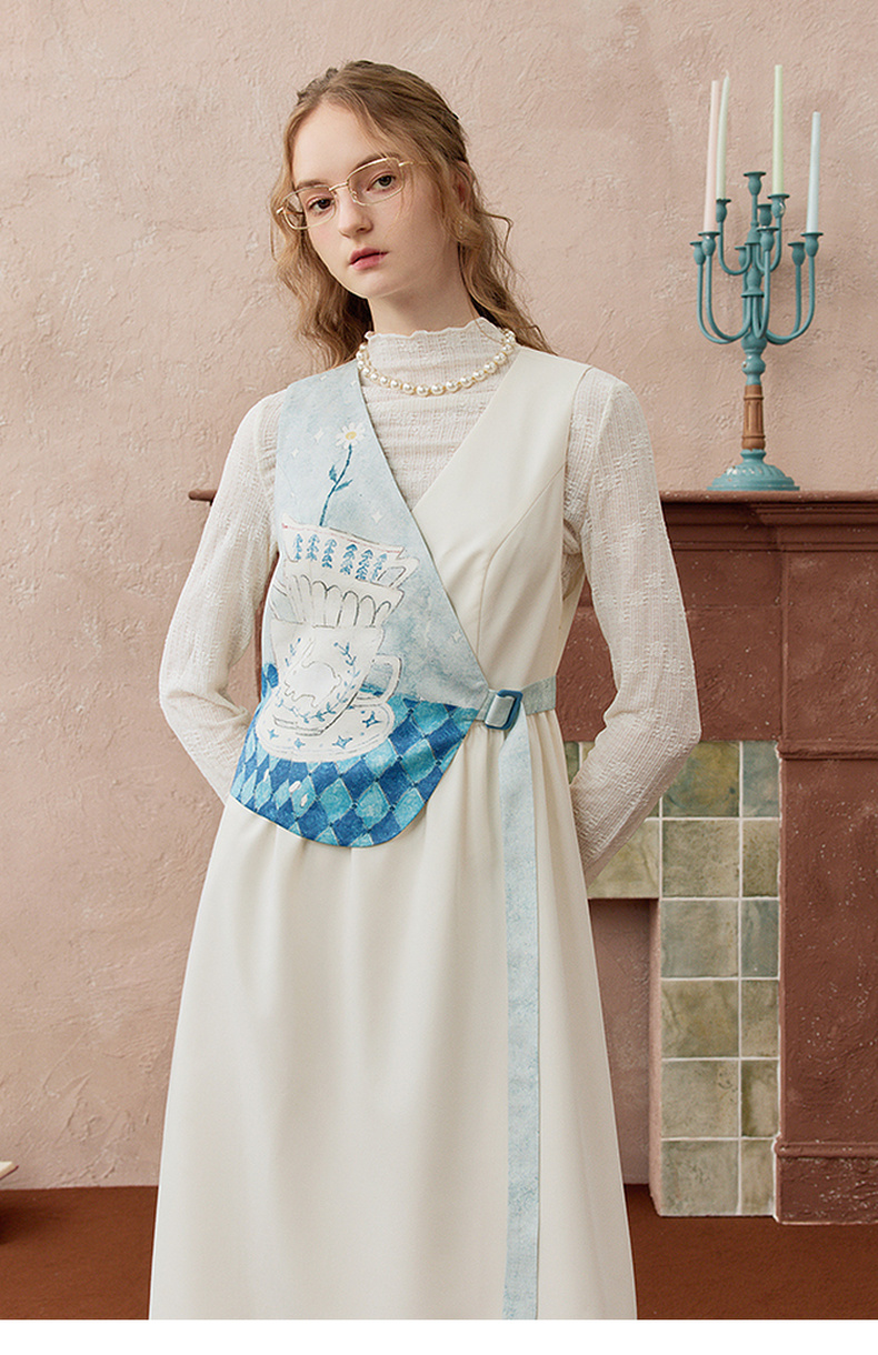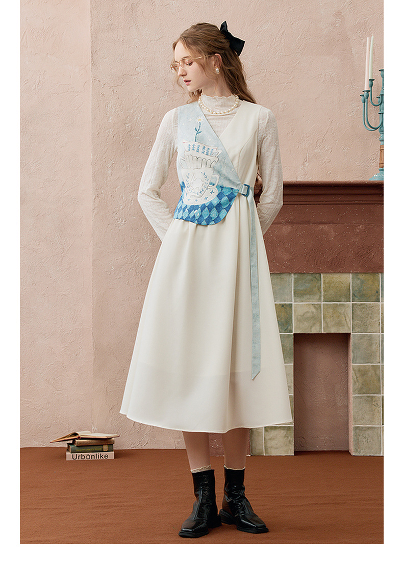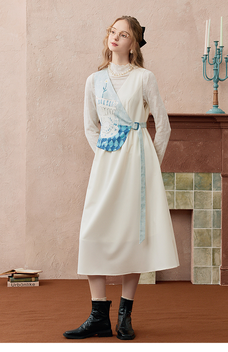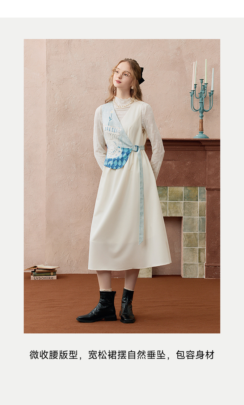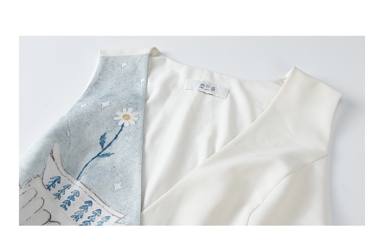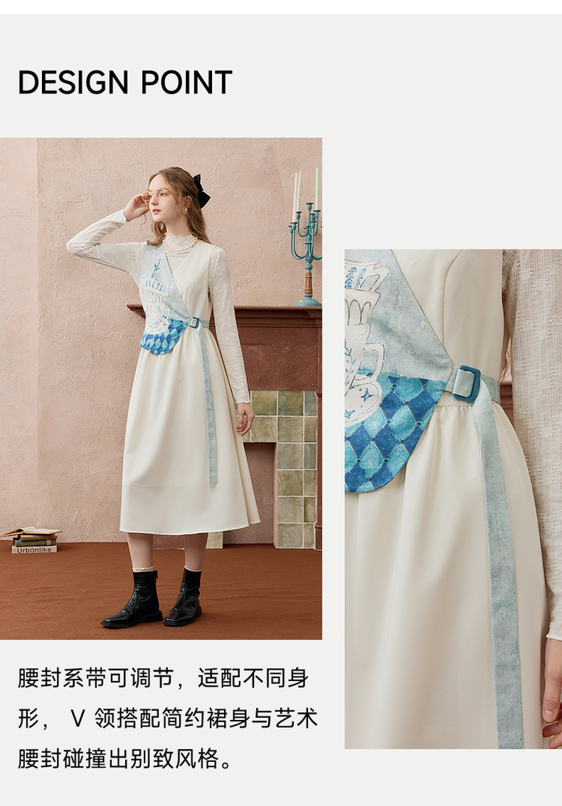 两三事茶兔女爵2025秋新款温柔风印花布拼接系带无袖背心裙连衣裙