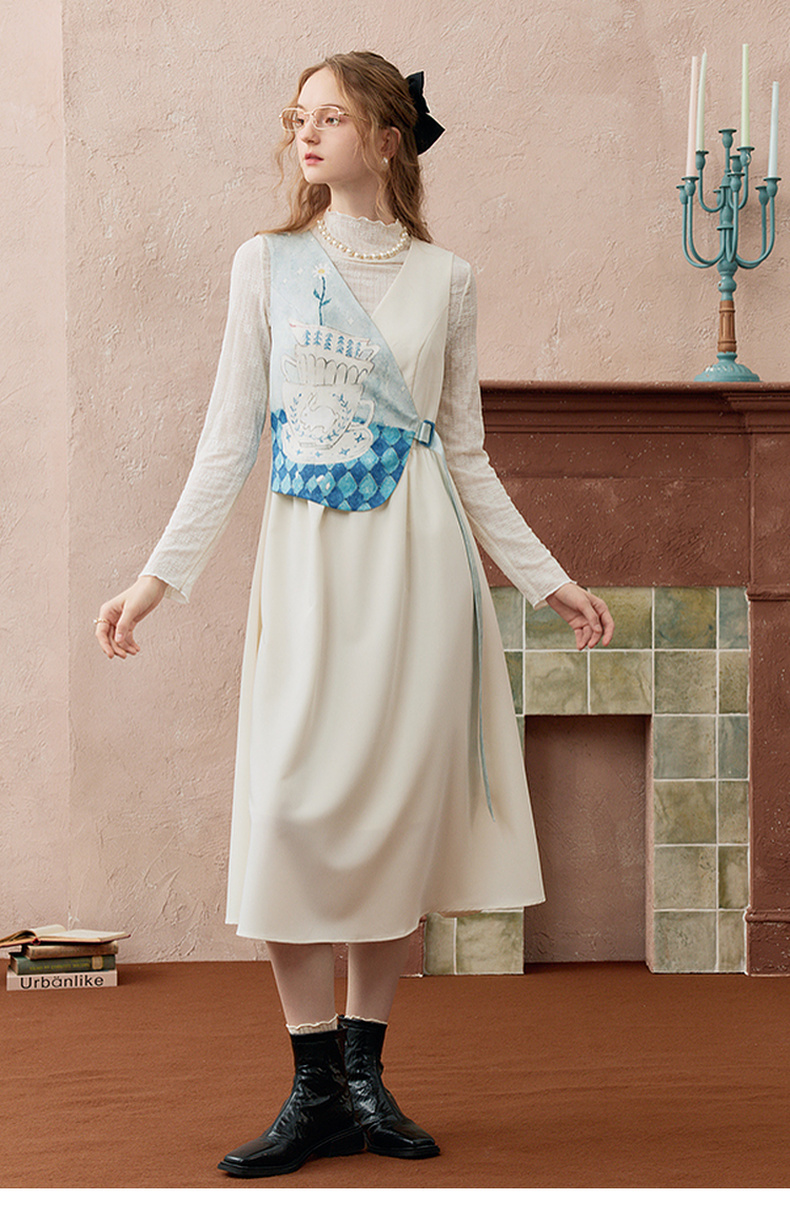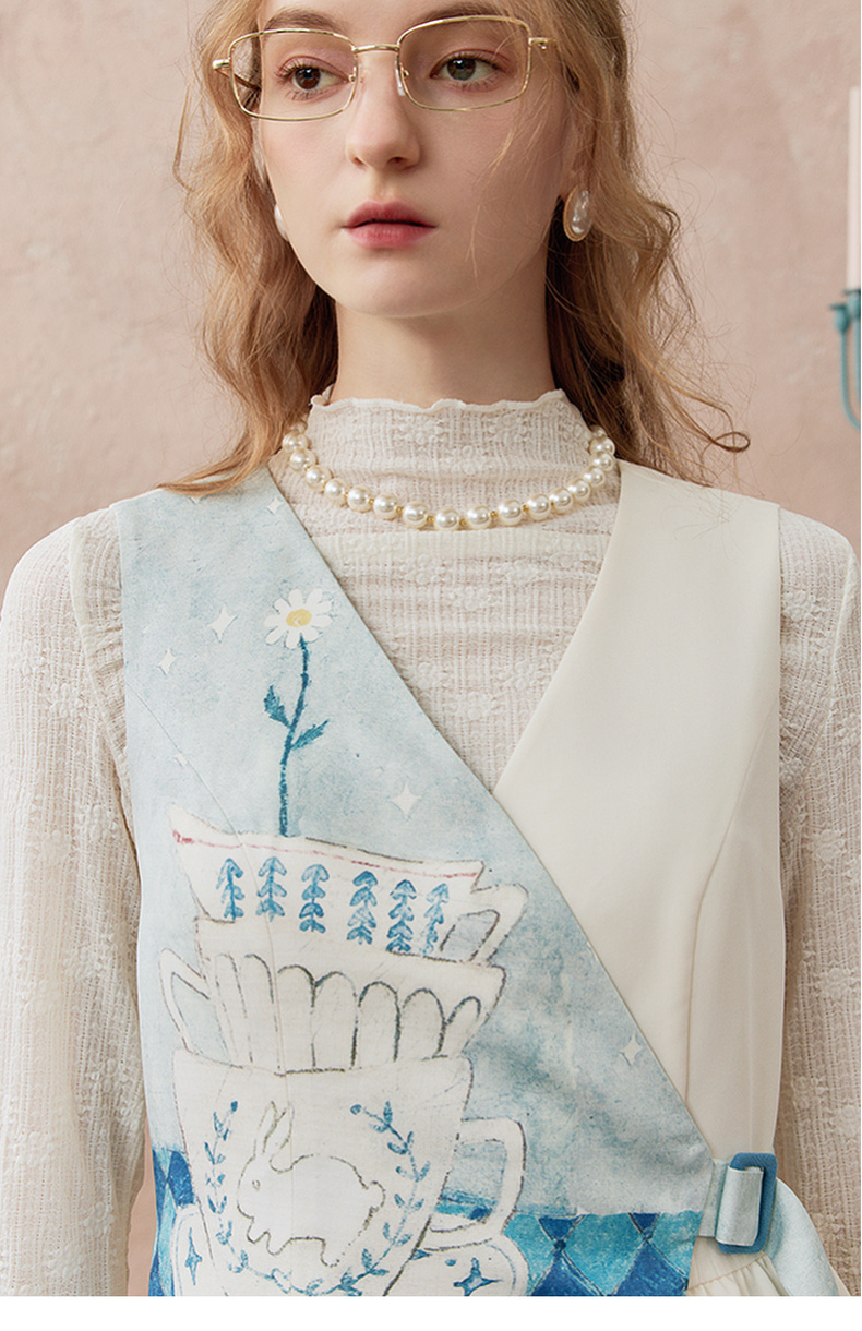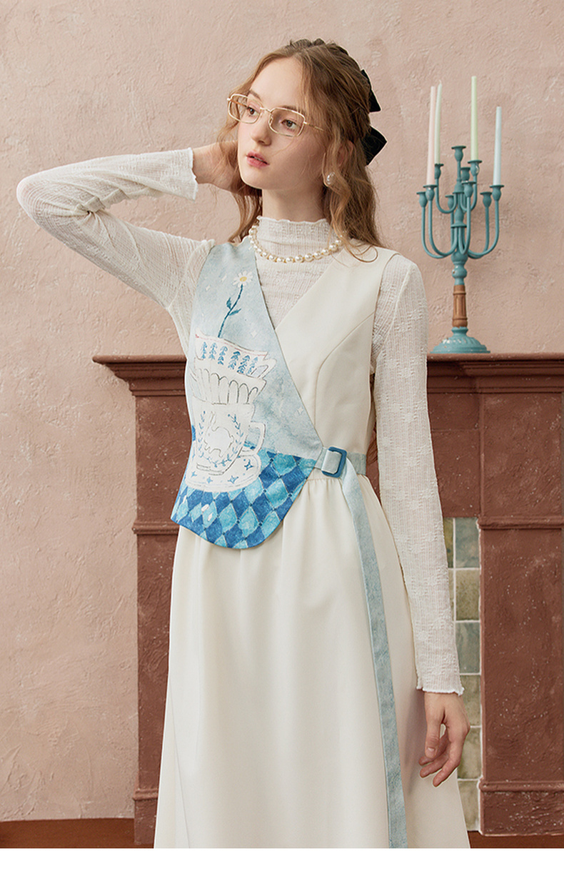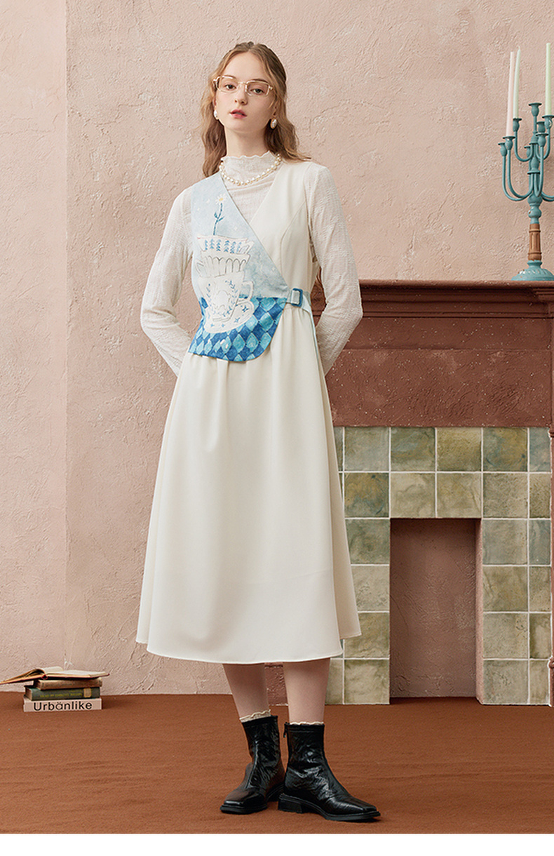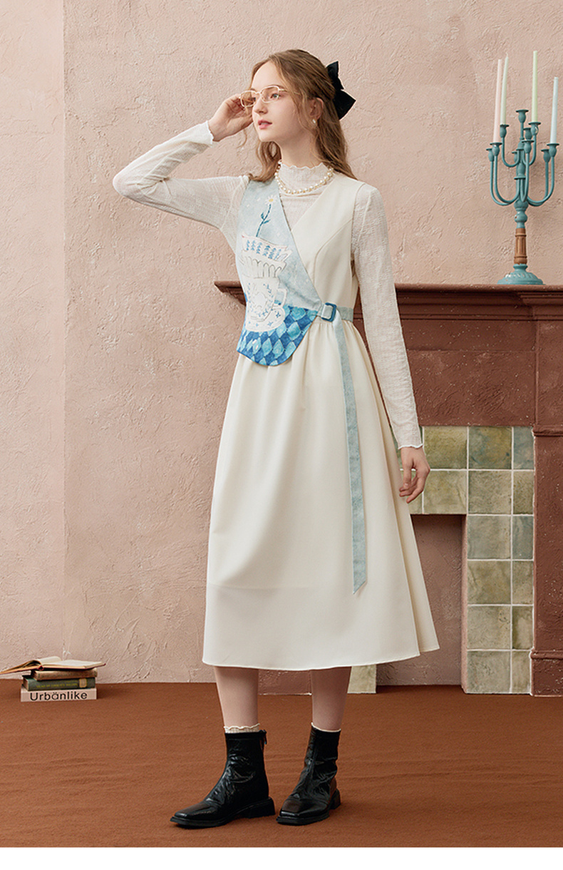 两三事茶兔女爵2025秋新款温柔风印花布拼接系带无袖背心裙连衣裙