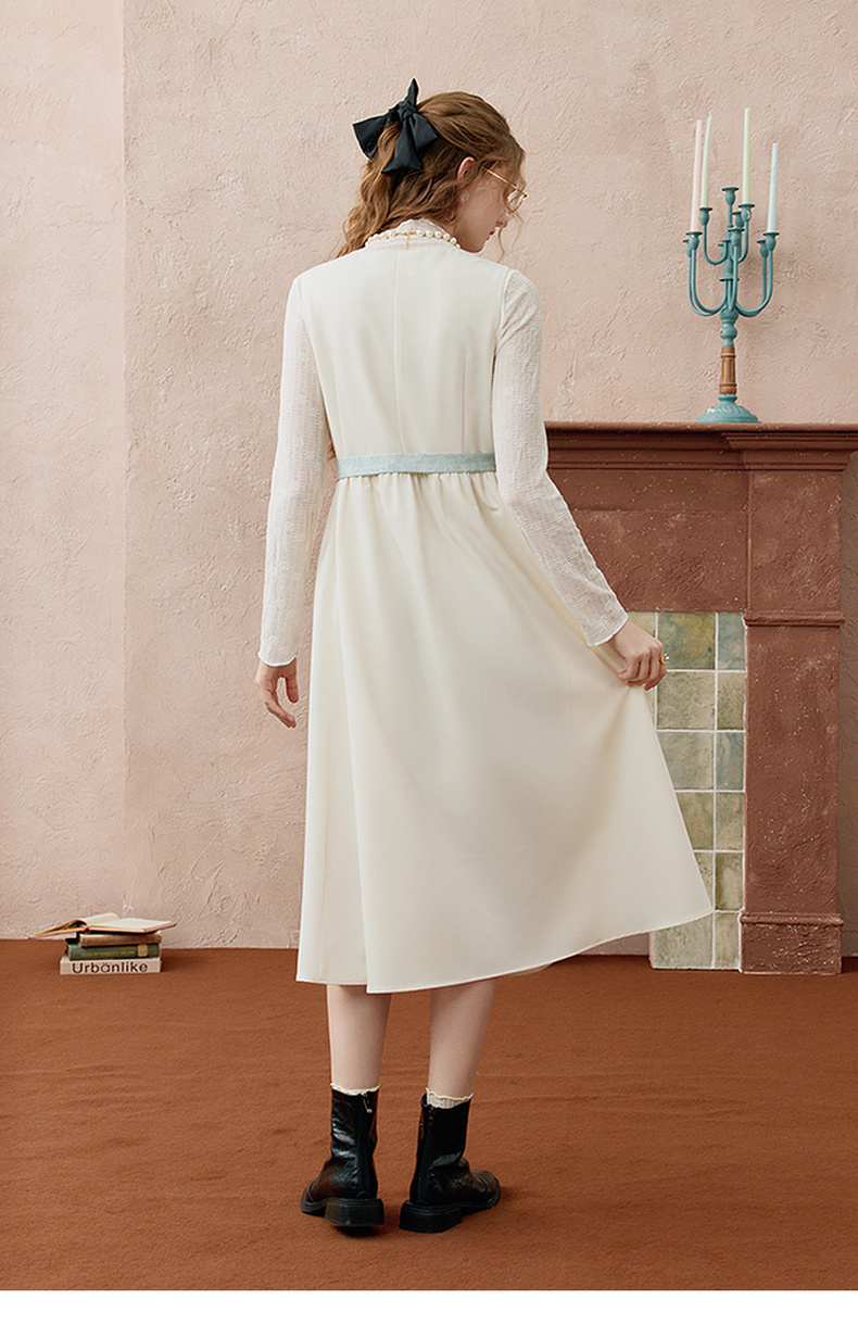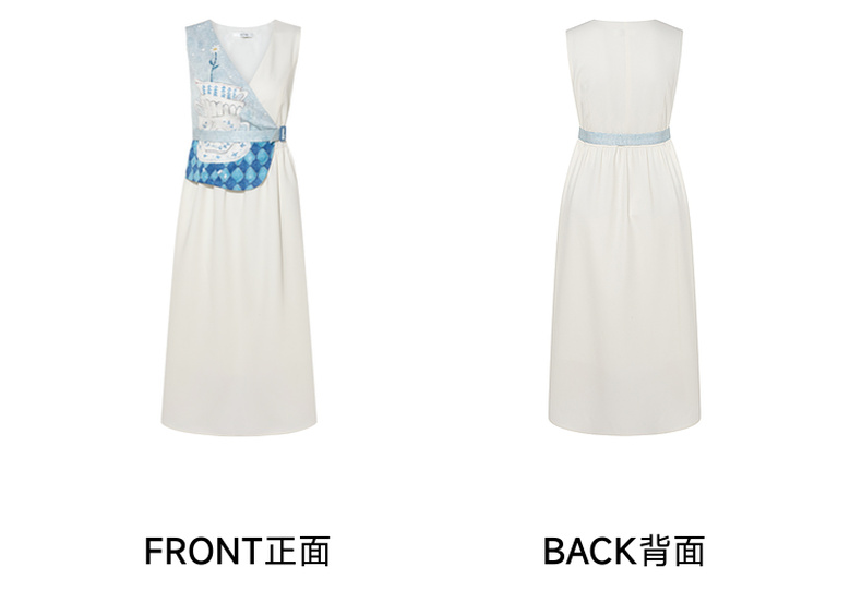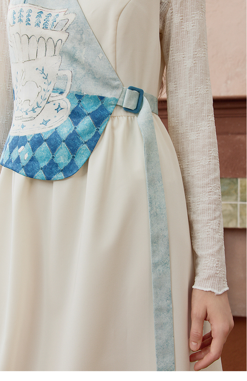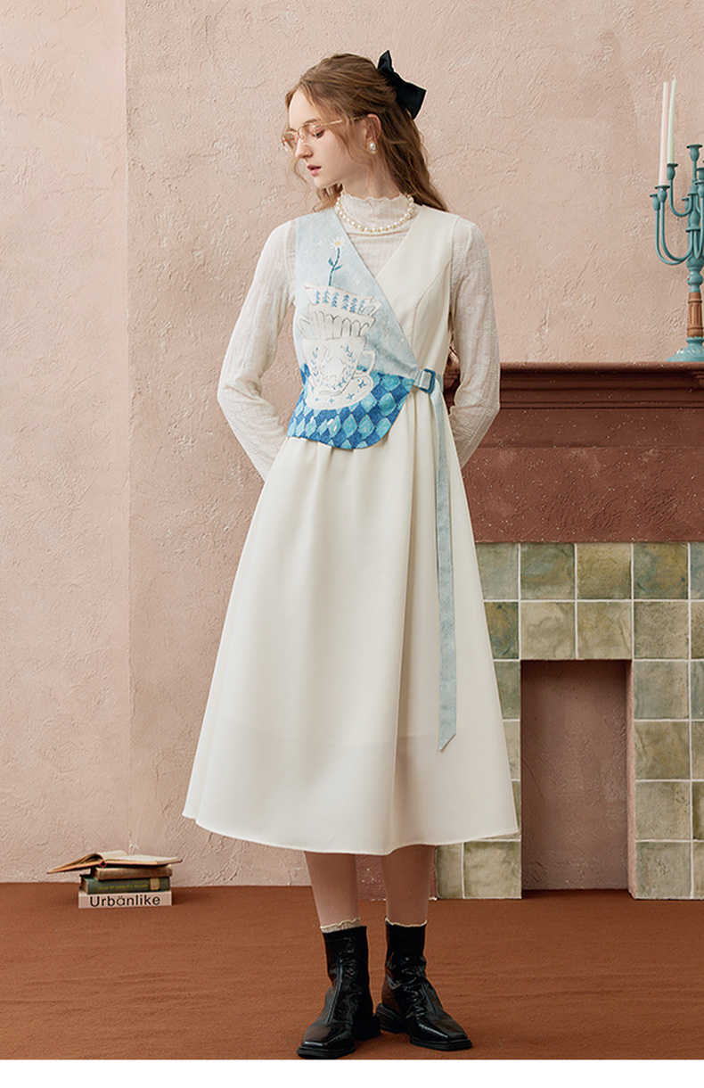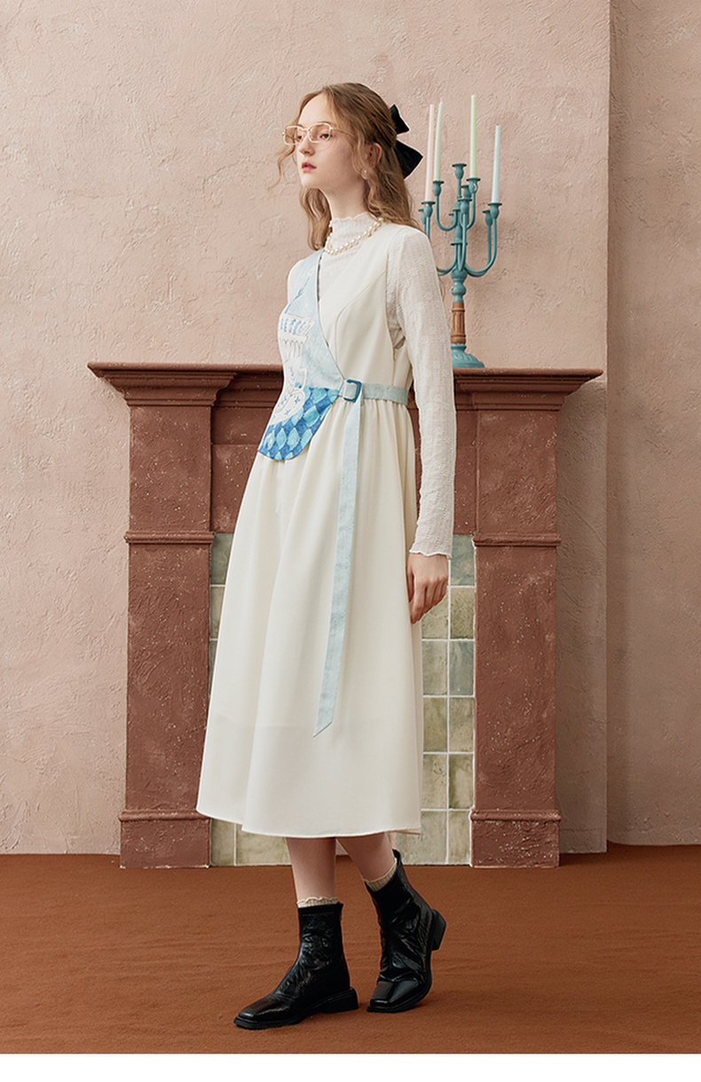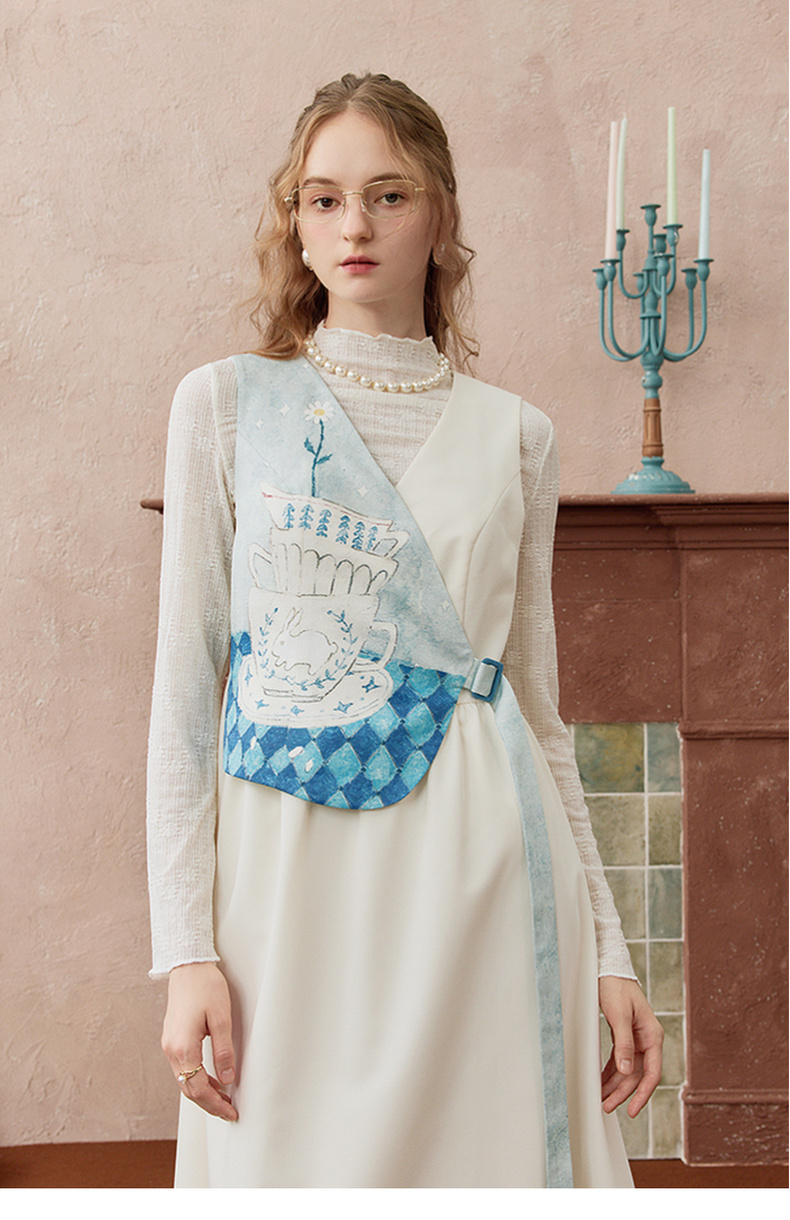 两三事茶兔女爵2025秋新款温柔风印花布拼接系带无袖背心裙连衣裙