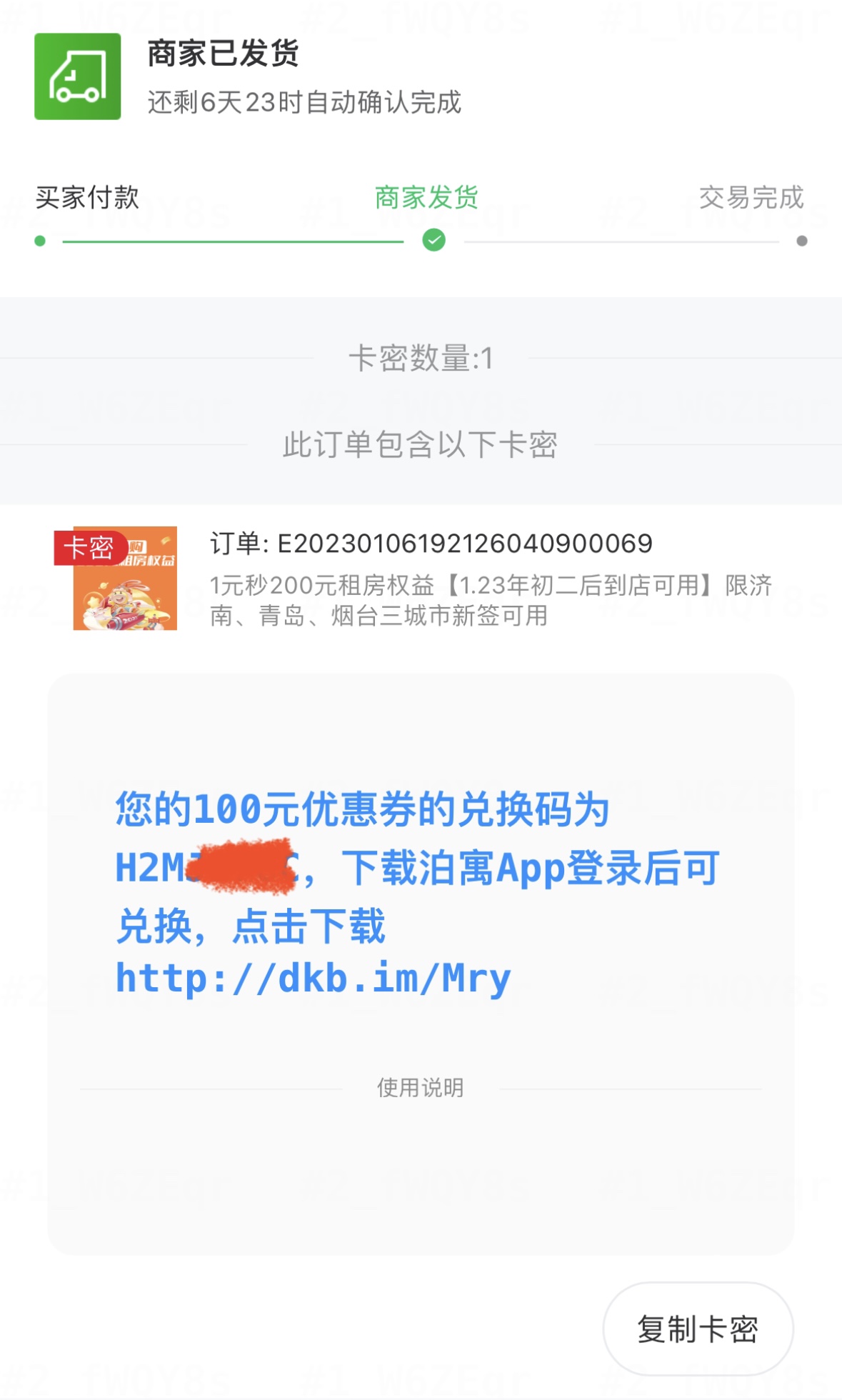 付款后不要退出,点击“查看订单”,可以看到如下界面,复制兑换码,前往泊寓APP/小程序兑换