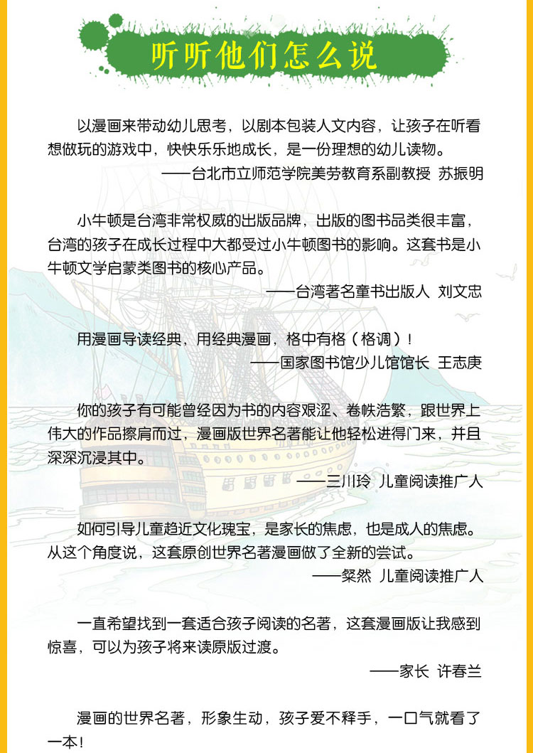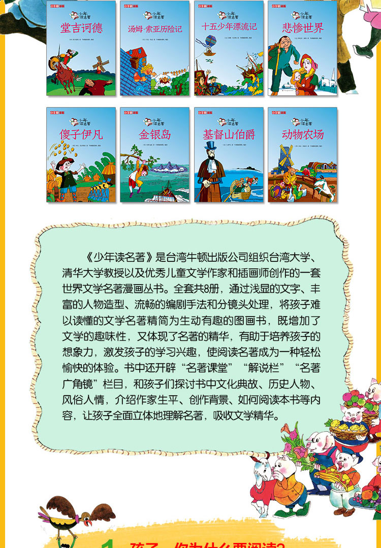 《少年读名著》是台湾牛顿出版公司组织台湾大学、清华大学教授以及优秀儿童文学作家和插画师创作的一套世界文学名著漫画丛书。全套共8册,分别是《堂吉诃德》《十五少年漂流记》《悲惨世界》《汤姆·索亚历险记》《动物农场》《金银岛》《傻子伊凡》《基督山伯爵》。 本书通过浅显的文字、丰富的人物造型、流畅的编剧手法和分镜头处理,将原本难以读懂的文学名著精简为生动有趣的图画书,既降低了阅读难度,增加了文学的趣味性,又体现了名著的精华。富有张力的插画有助于培养孩子的想象力,激发孩子的学习兴趣,使阅读名著成为一种轻松愉快的体验。书中还开辟了“名著课堂”“解说栏”“名著广角镜”栏目,和孩子们探讨书中文化典故、历史人物、风俗人情,介绍作家生平、创作背景、如何阅读本书等内容,及名著相关趣味链接等延伸阅读,让孩子全面立体地理解名著,吸收文学精华。