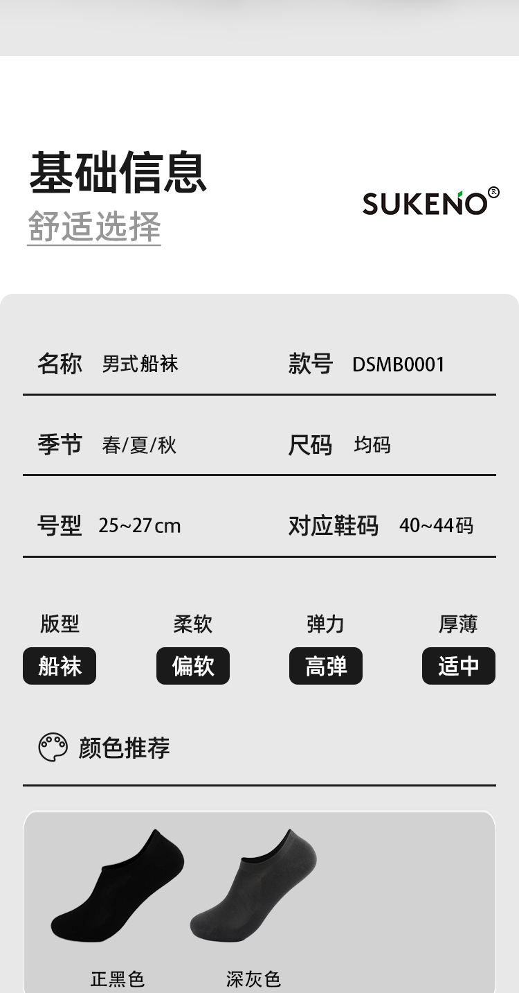 SUKENO夏季柔软船袜男款透气舒适高弹短袜