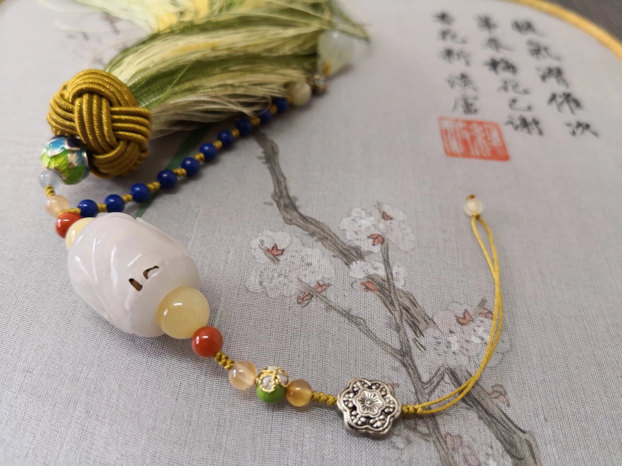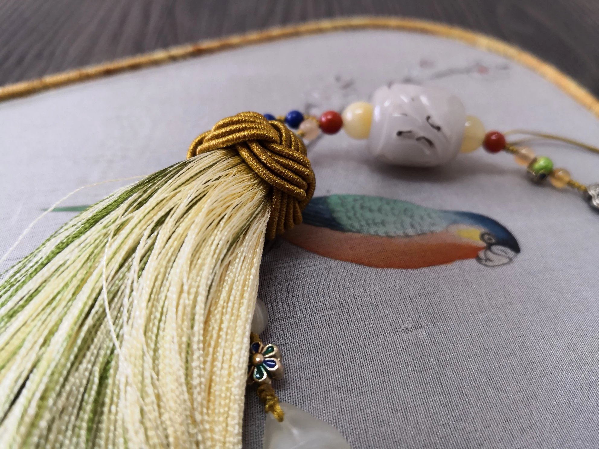 还有流苏。流苏亦是用丝线手工一丝丝、慢条斯理打成形的。