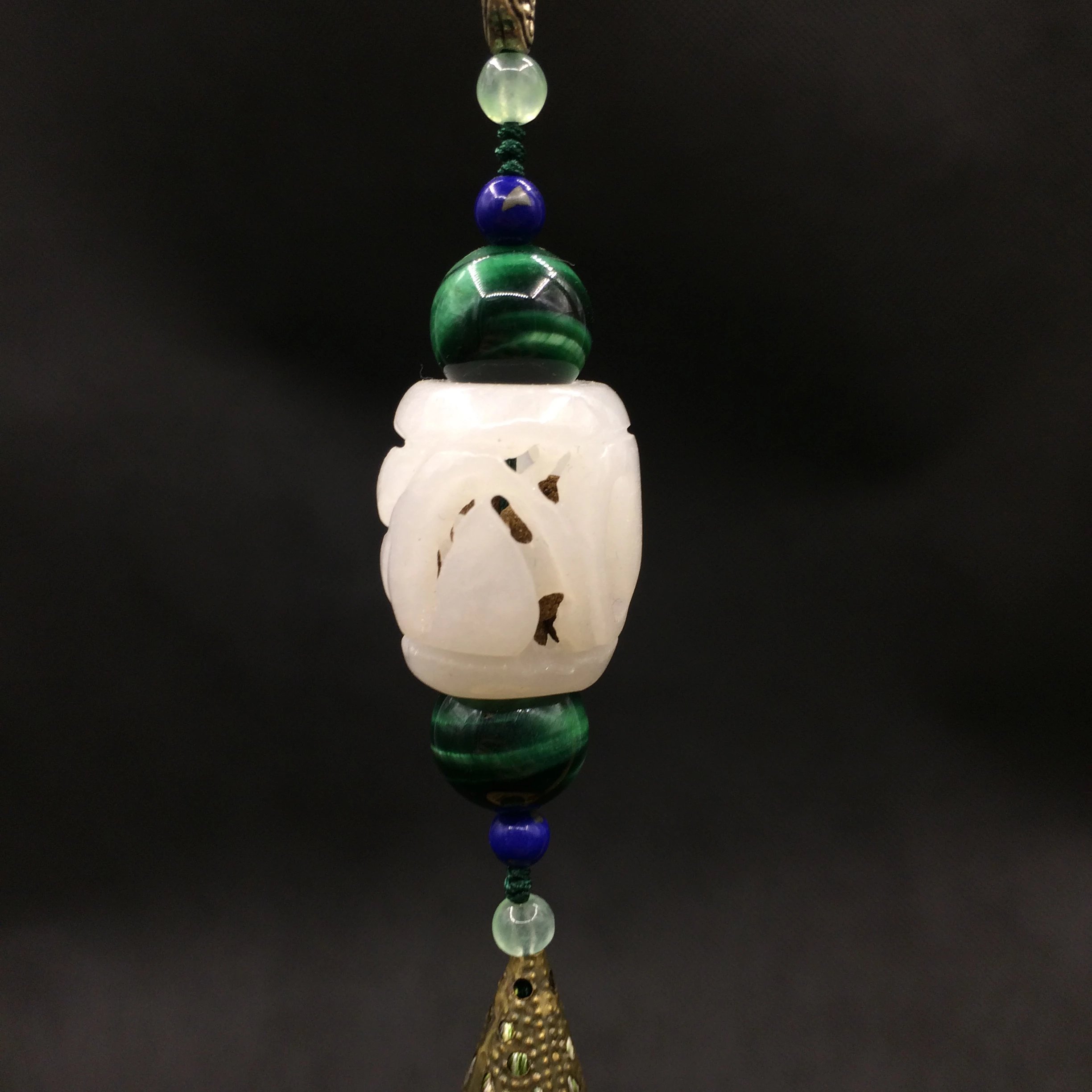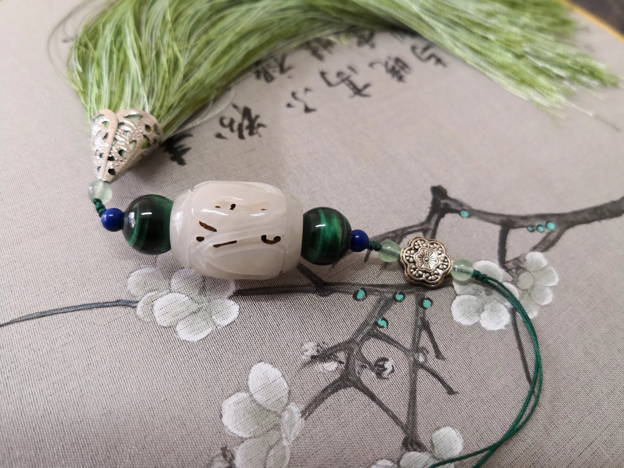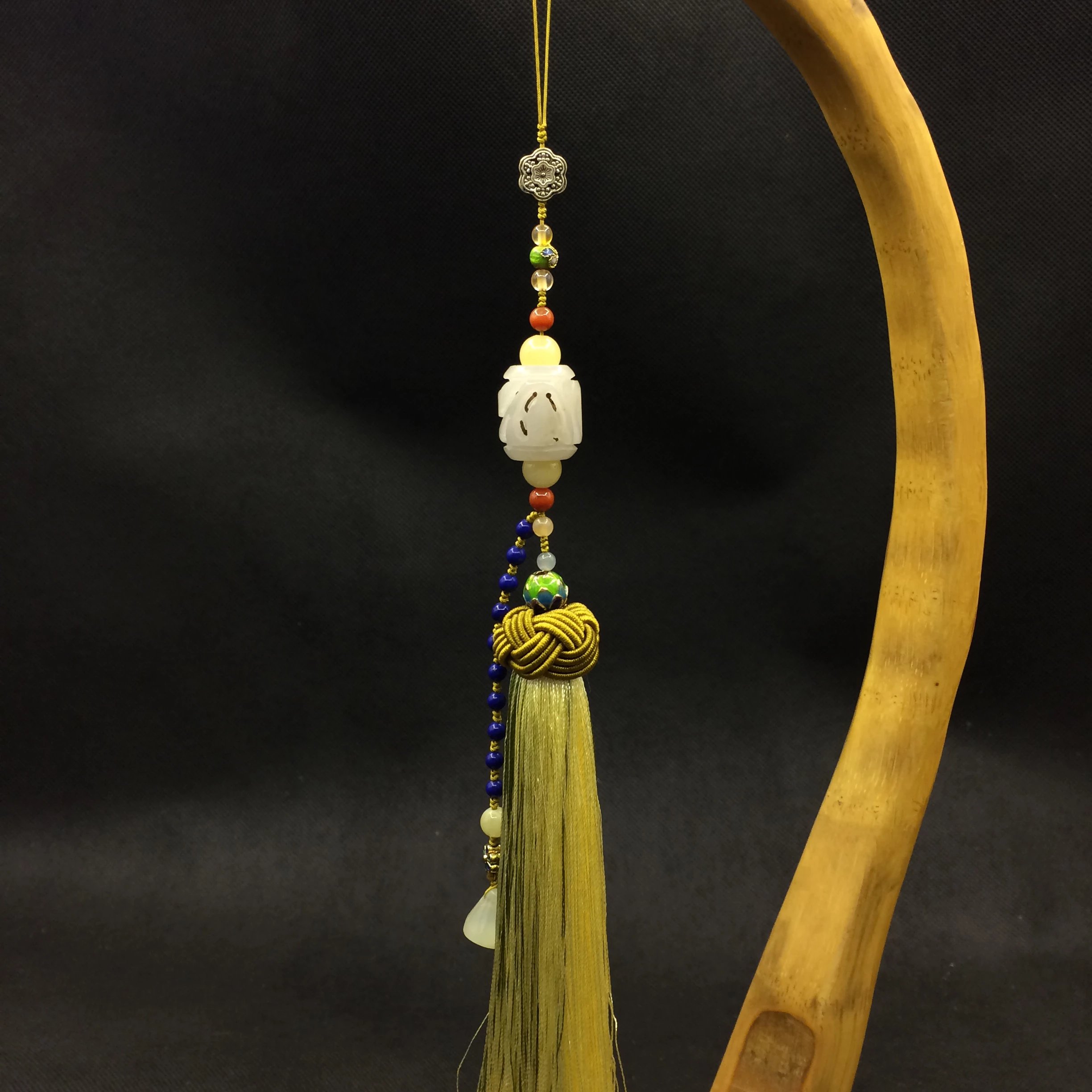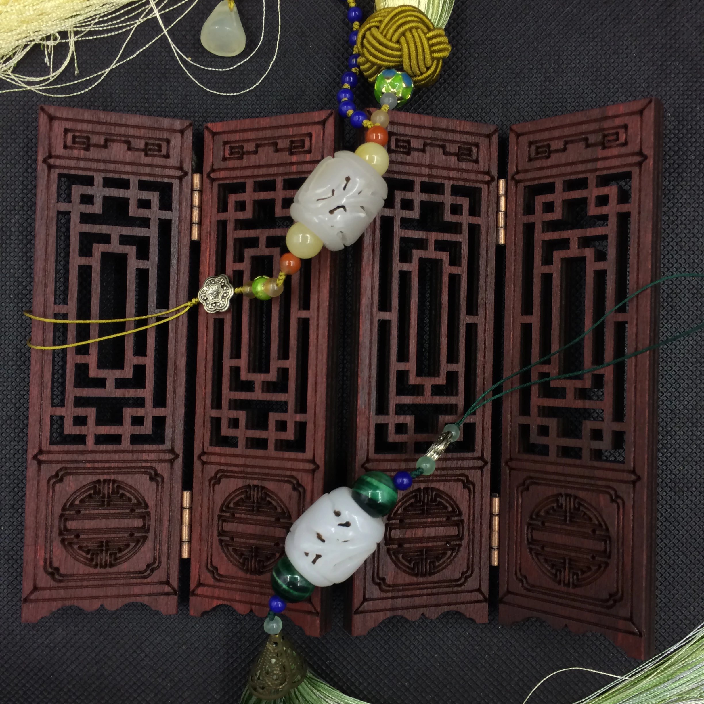 手工配制。一般下单后七天内寄出成品。 规格:桶形玉香囊2.5*1.5厘米,灯笼形玉香囊2.0*1.3厘米。连流苏长约30厘米。重量约17克。 材质:青海料和田玉。 配置:香囊内含安魂香。 个人定制:可定制流苏颜色、配饰设计(须另加100)