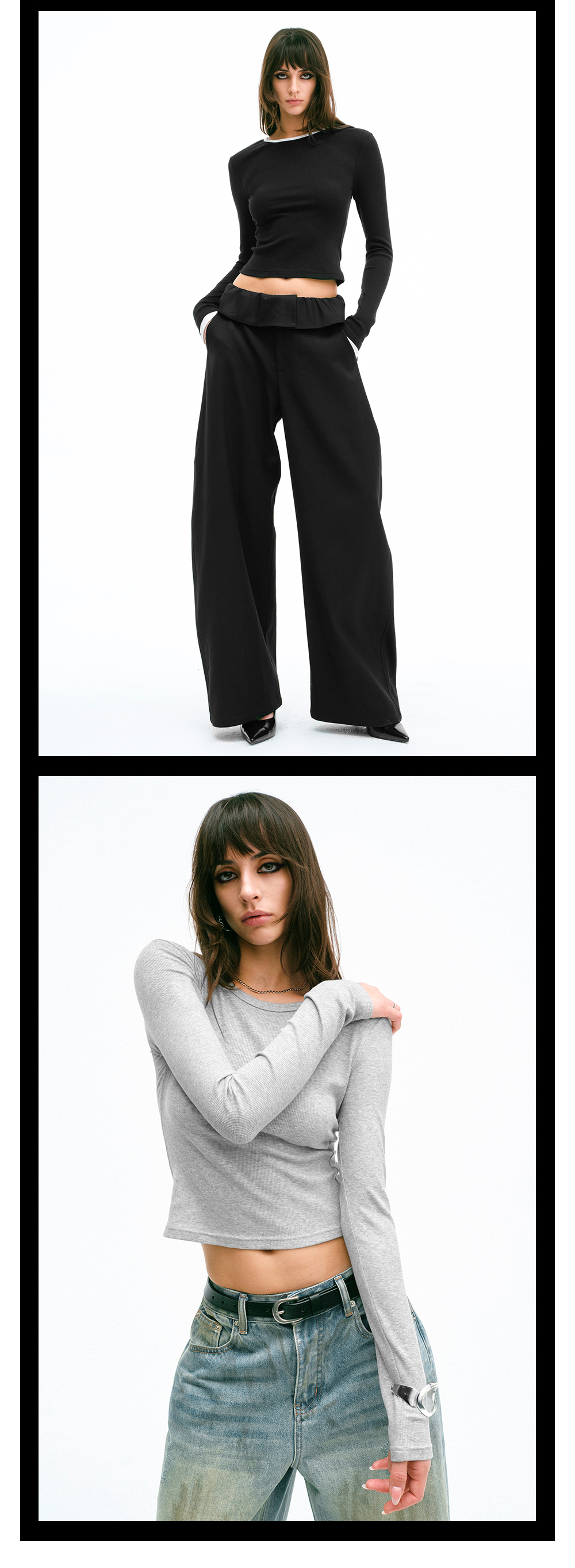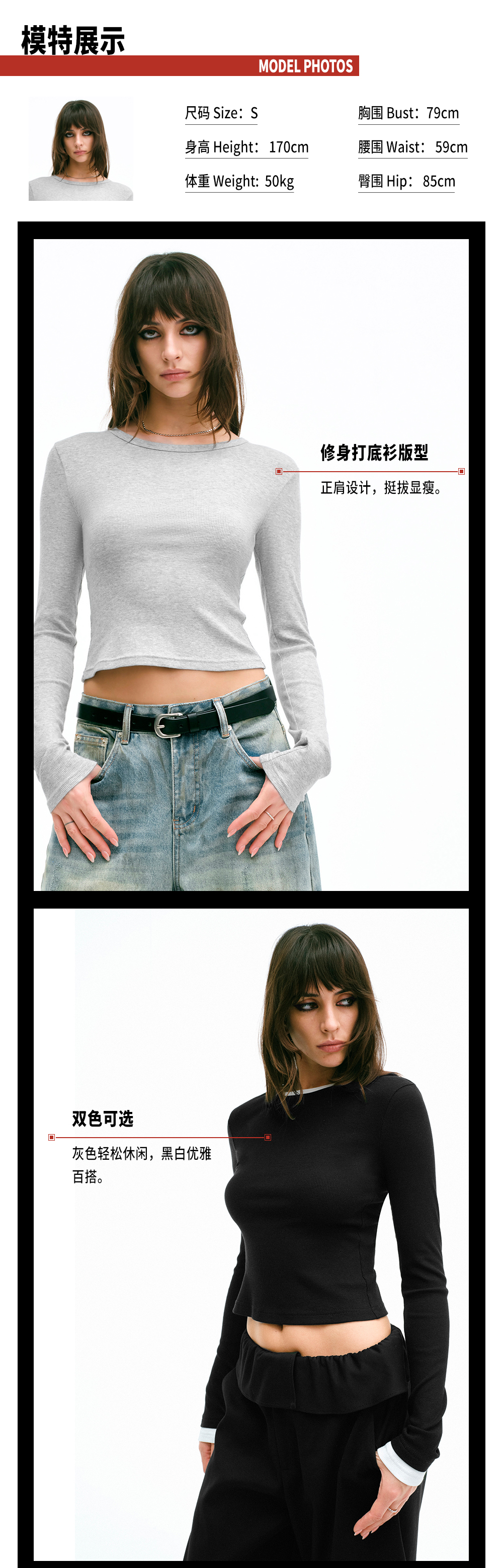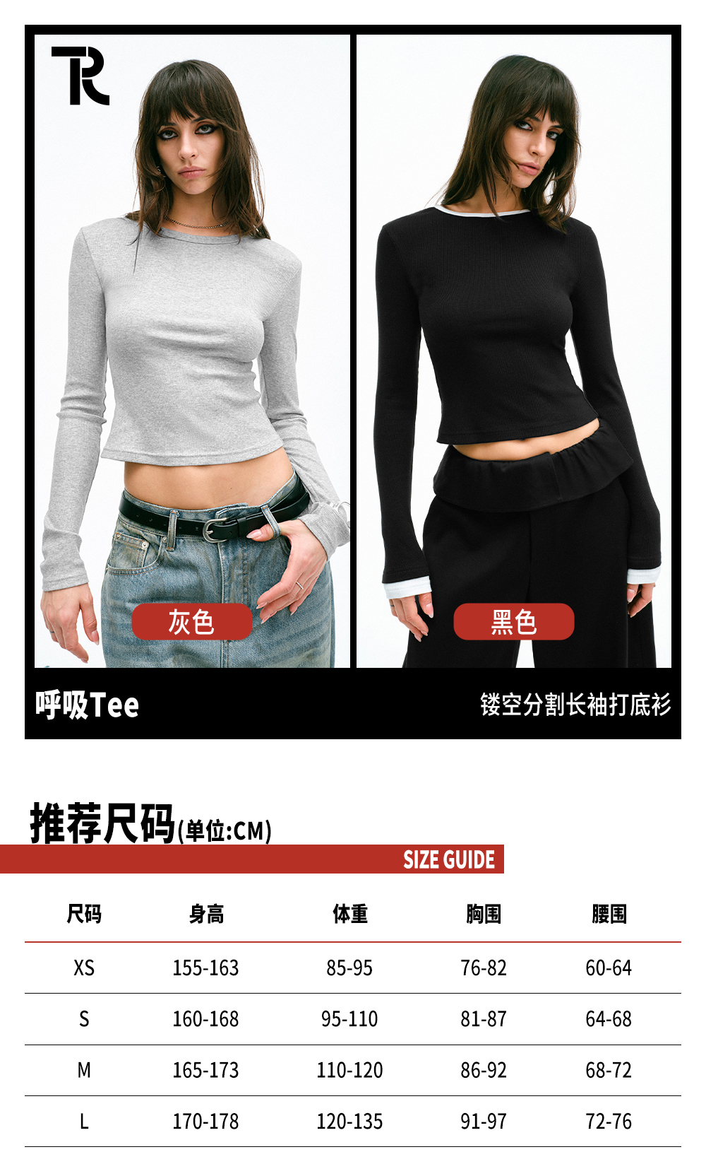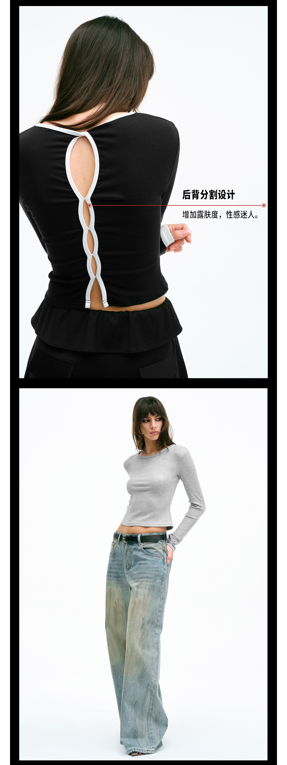 TR她热 呼吸Tee 灰色黑白镂空百搭基础款露背正肩长袖T恤打底衫