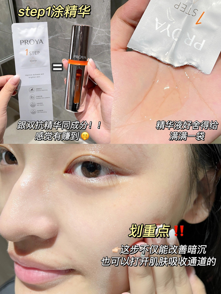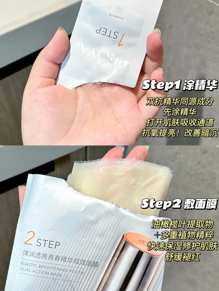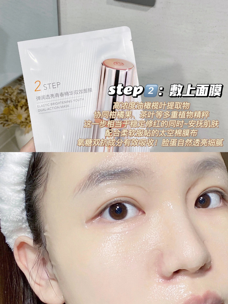 算下来一贴面膜的分量不比一瓶精华差 step️1️⃣:涂抹精华液 继承了双抗精华的经典配方 又协同高浓度甘油葡糖苷 抗氧抗糖改善暗沉粗糙的同时 活性成分也能吸收的更快 又能提高皮肤保湿力 也能加乘后续面膜的吸收