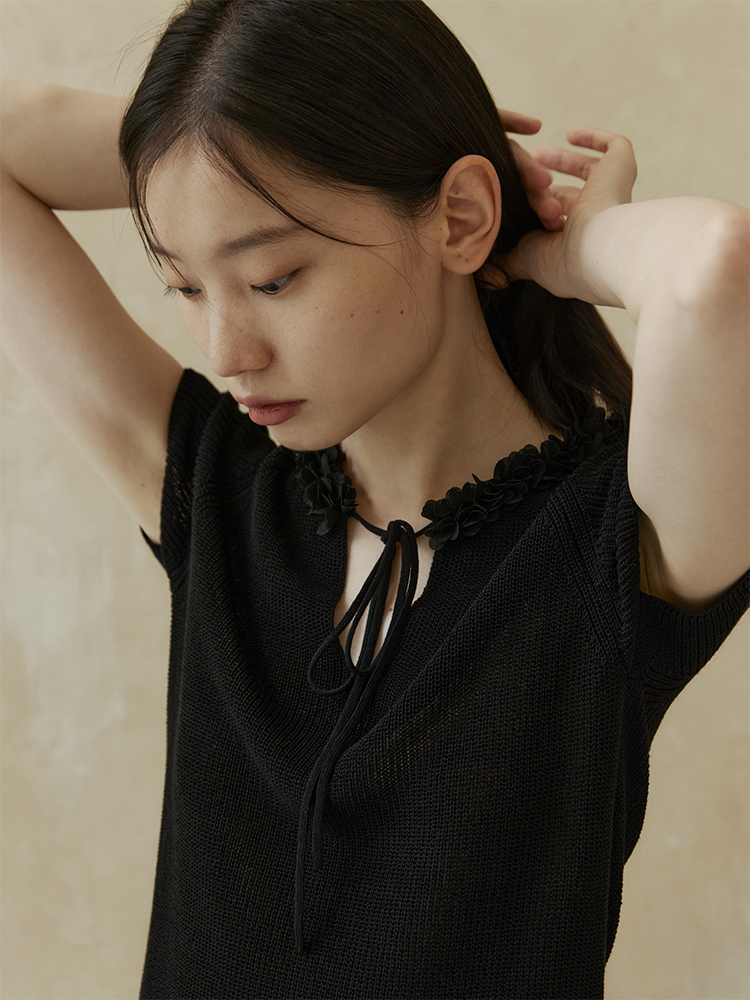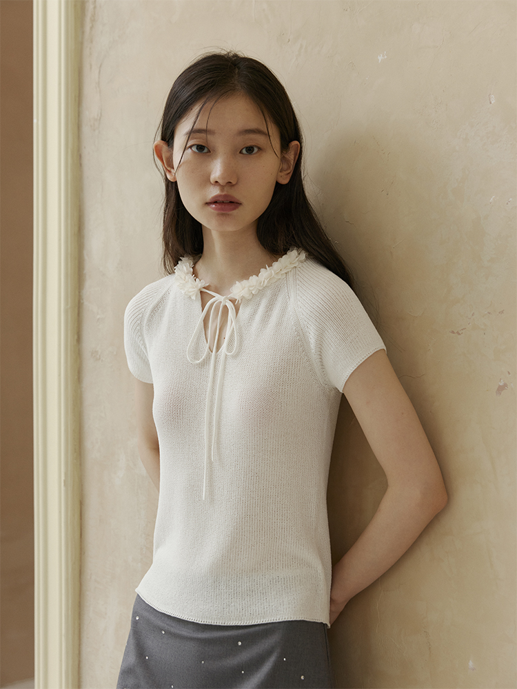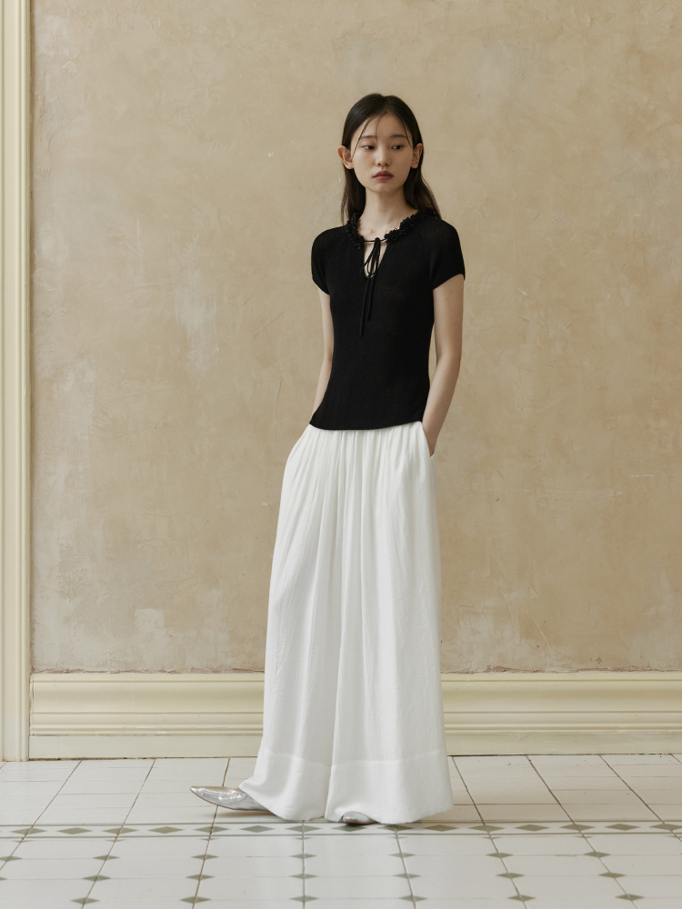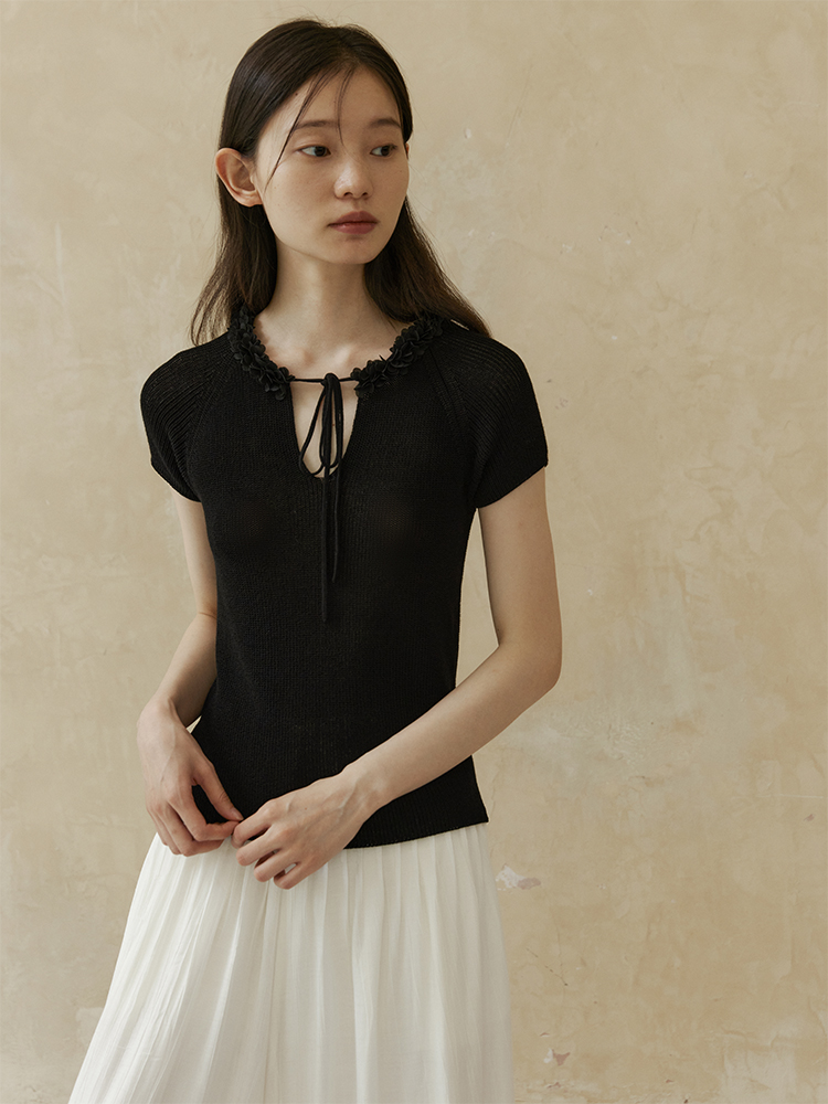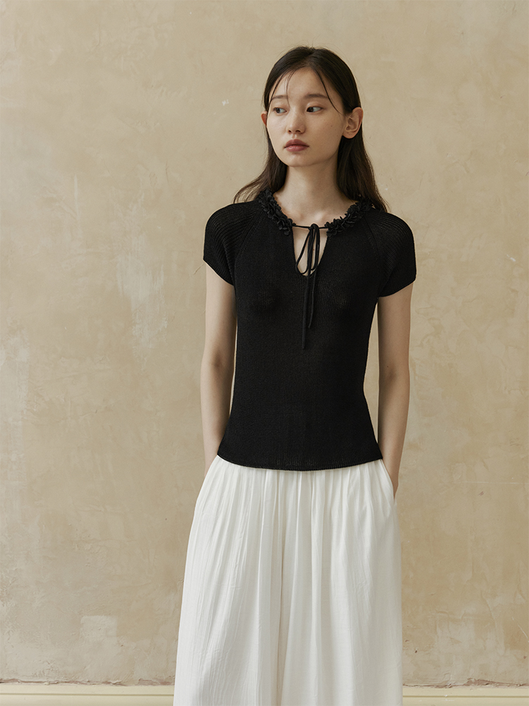 ForPoem 现货 24/SS原创设计夏季立体花边系带修身针织短袖上衣