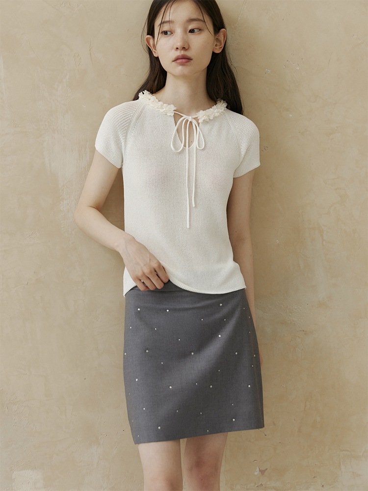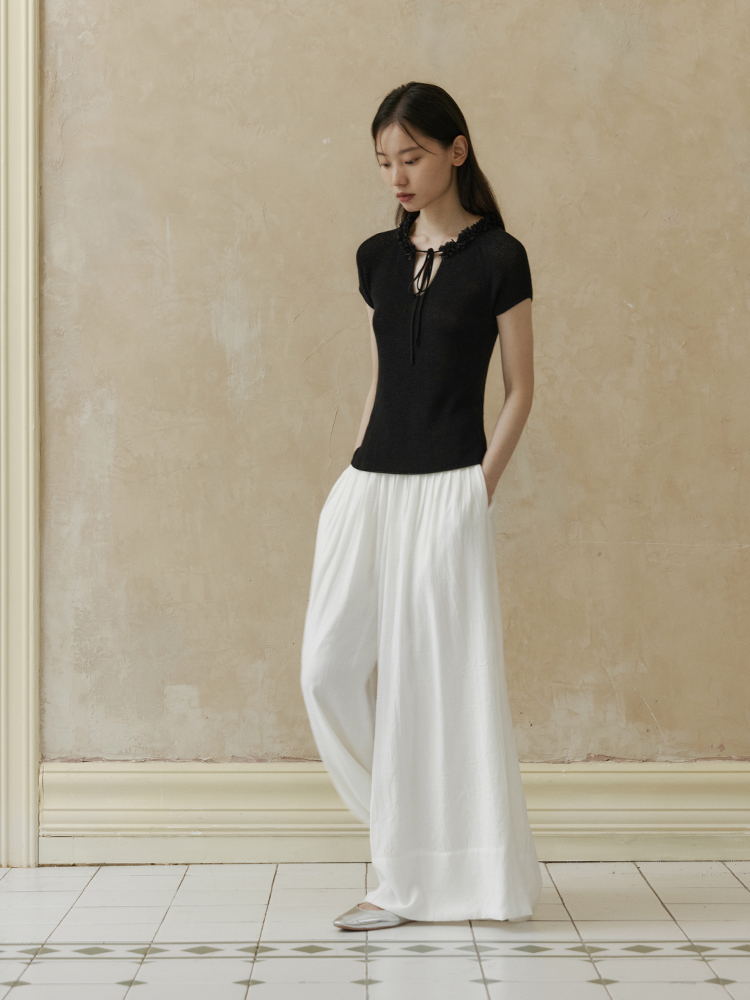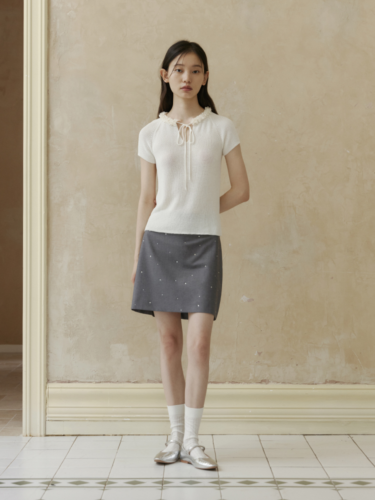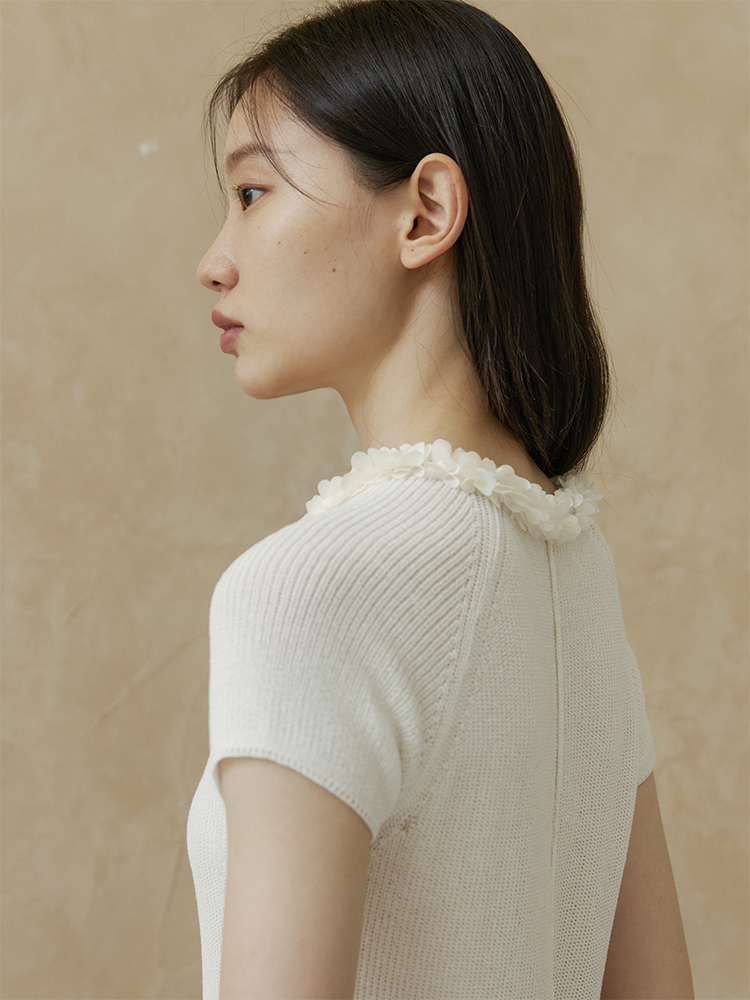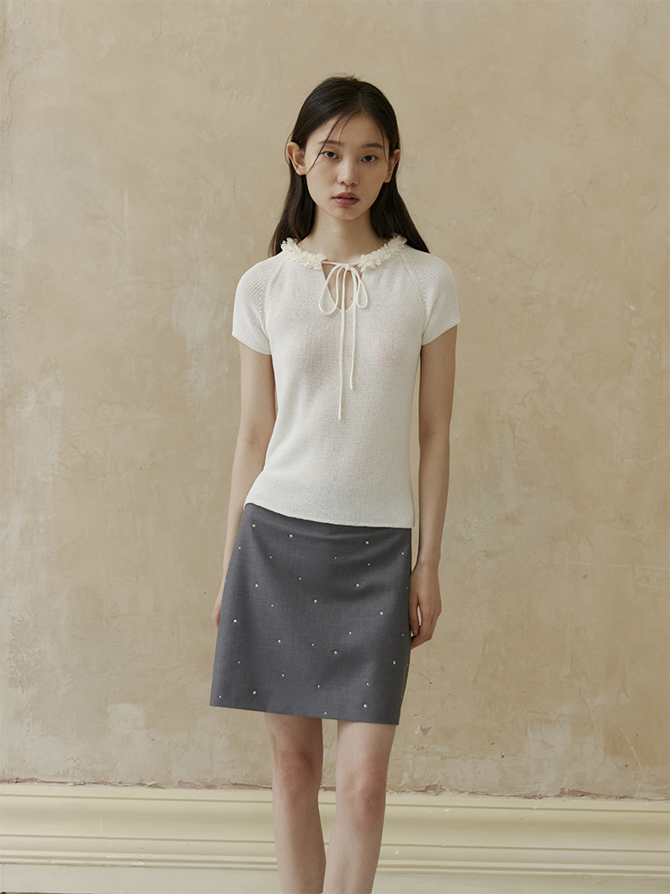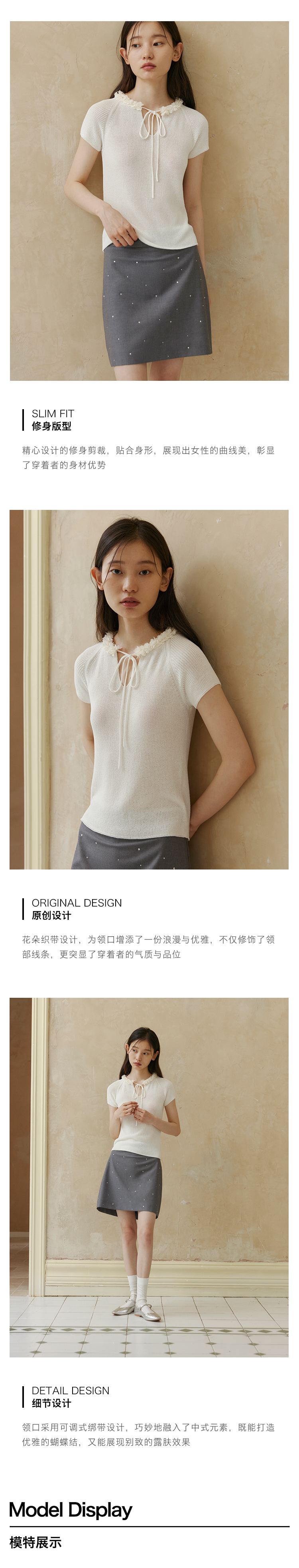 ForPoem 现货 24/SS原创设计夏季立体花边系带修身针织短袖上衣