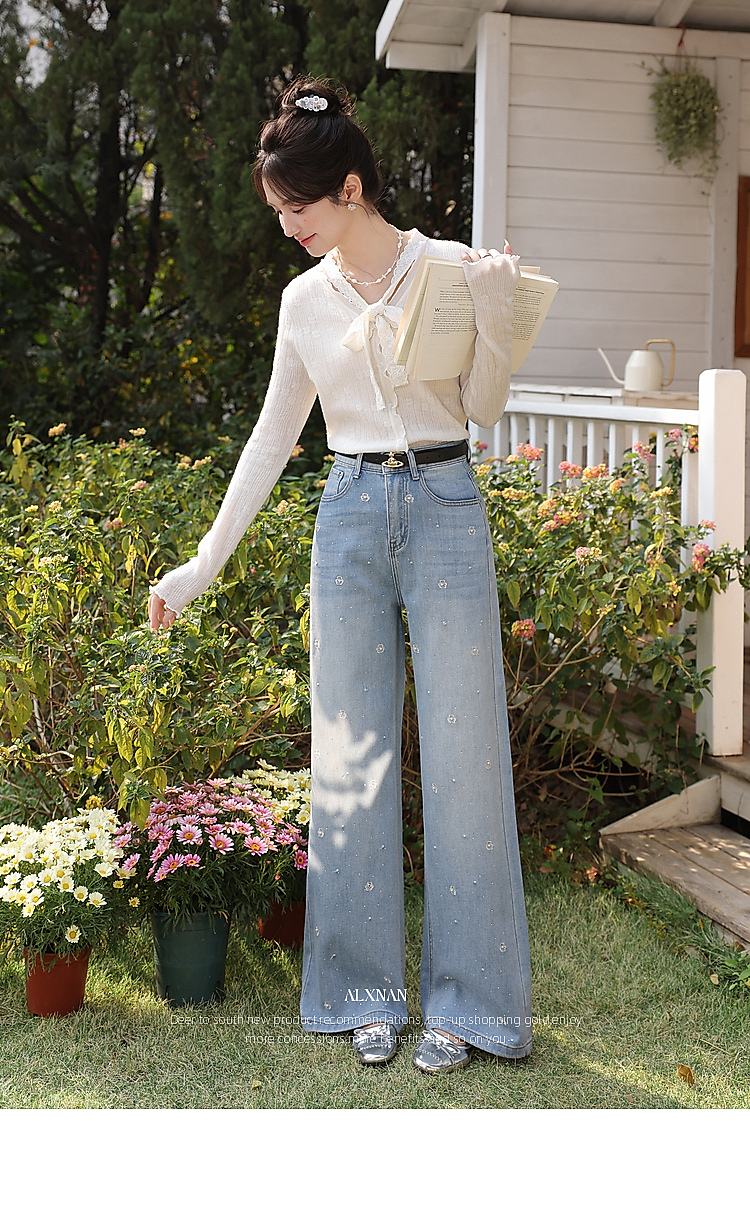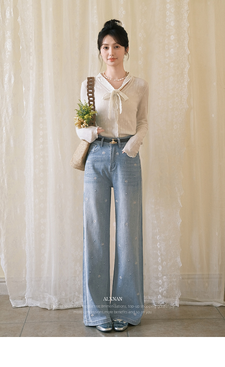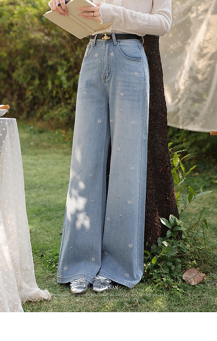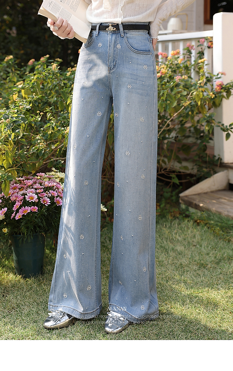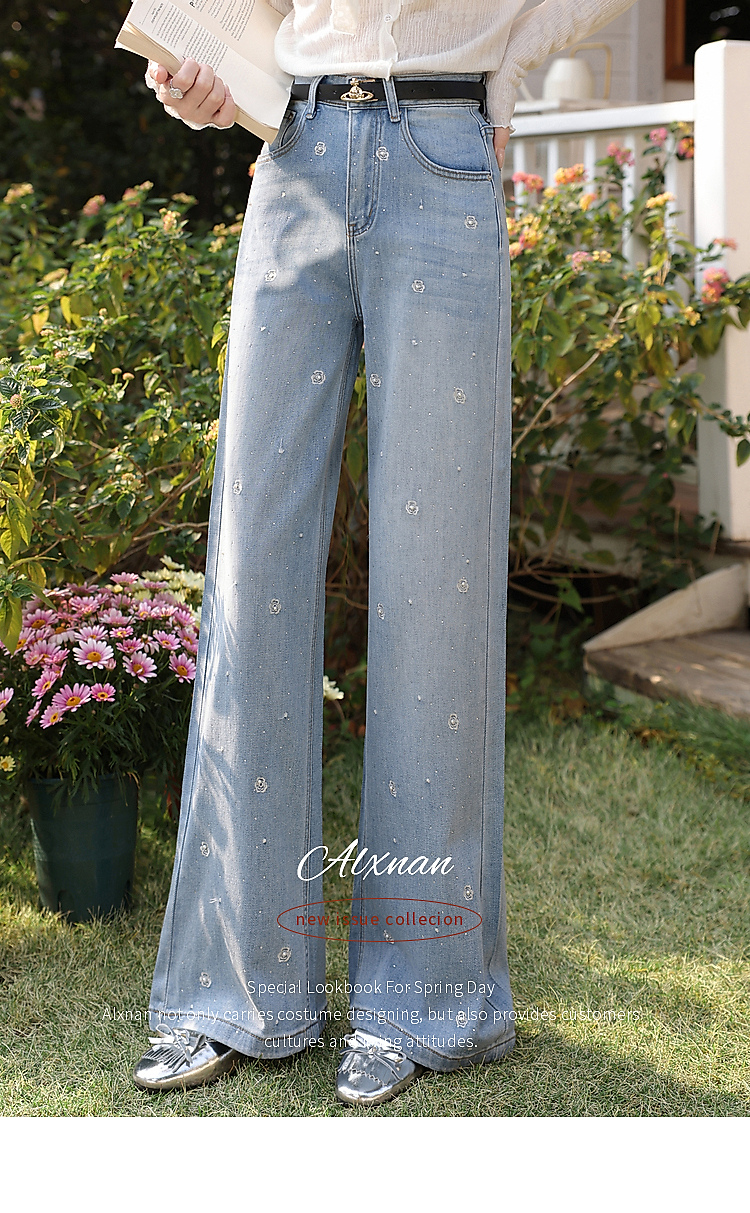 鹿向南「罗曼烟迹」蓝色宽松亮片烫钻阔腿牛仔裤女春显瘦直筒长裤