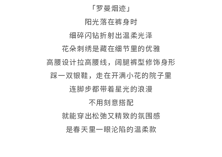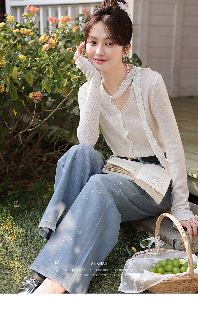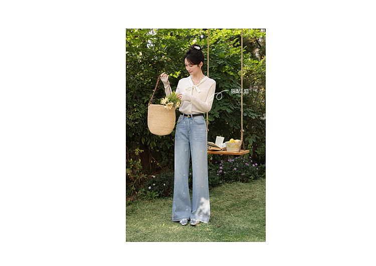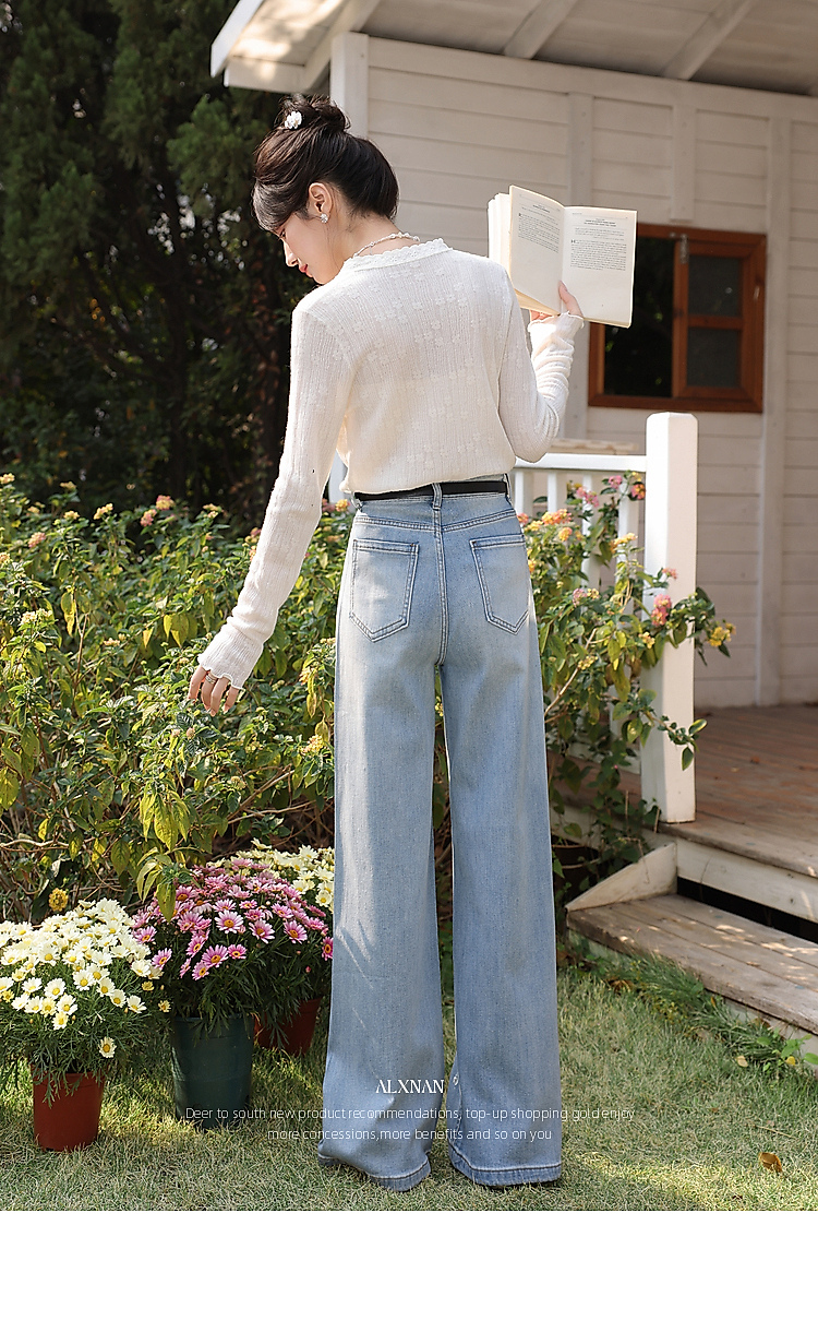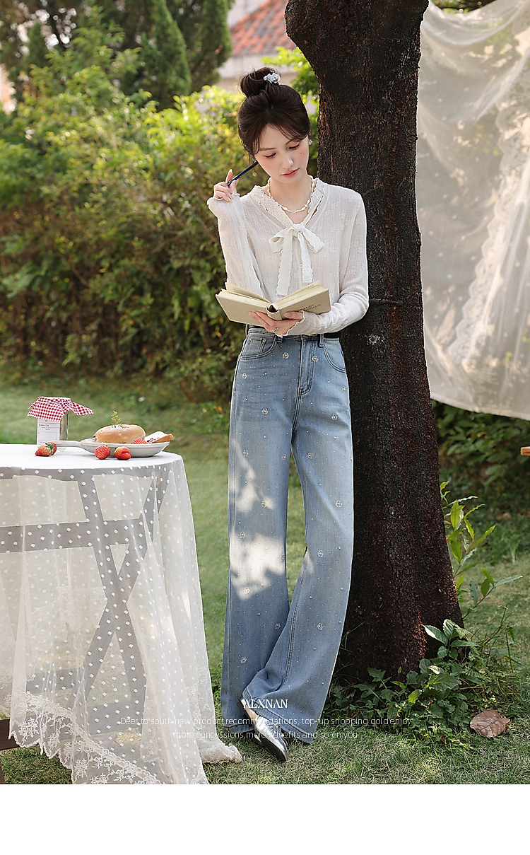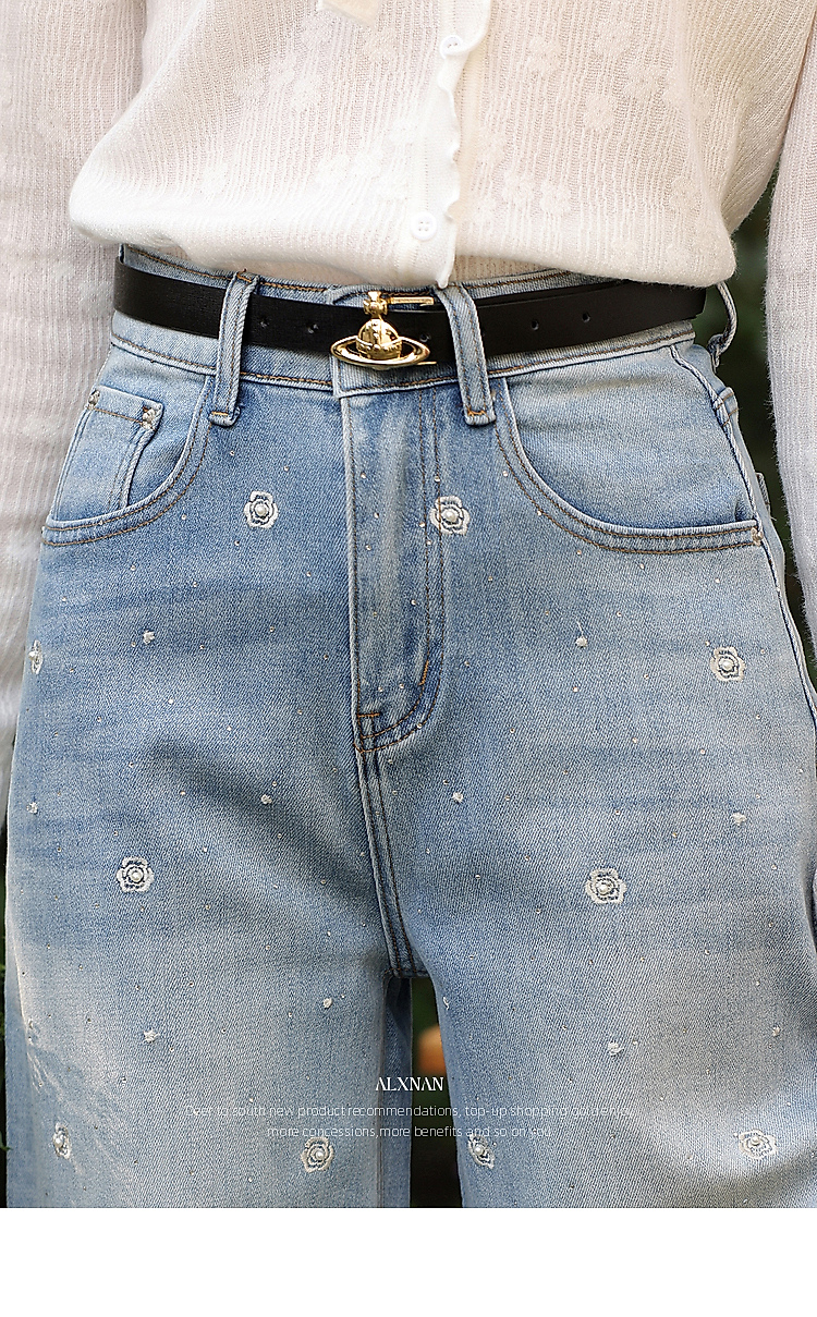 鹿向南「罗曼烟迹」蓝色宽松亮片烫钻阔腿牛仔裤女春显瘦直筒长裤