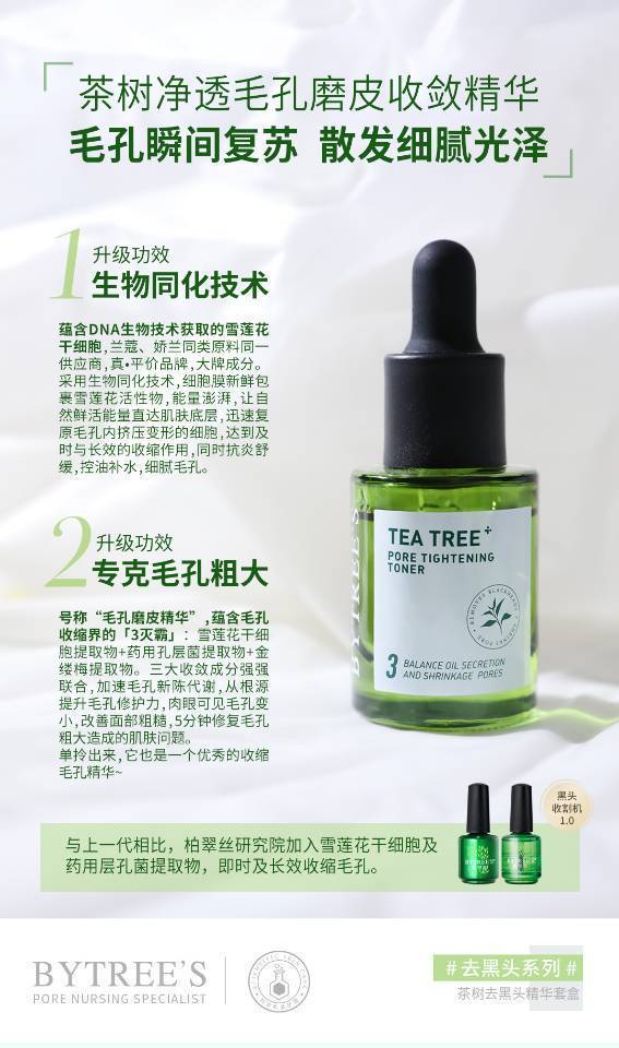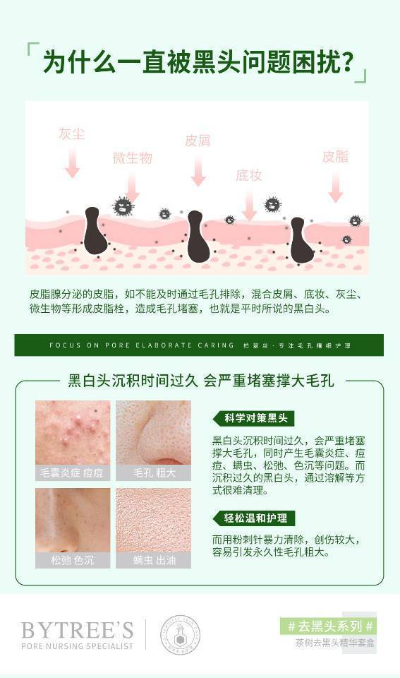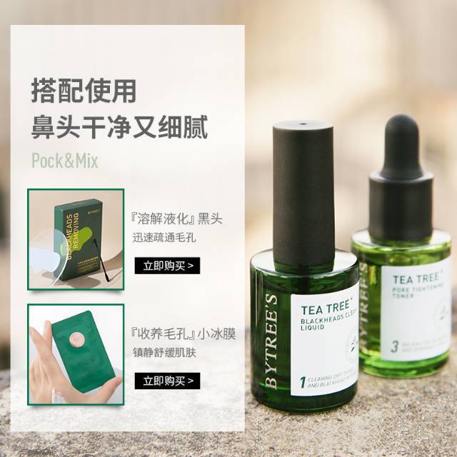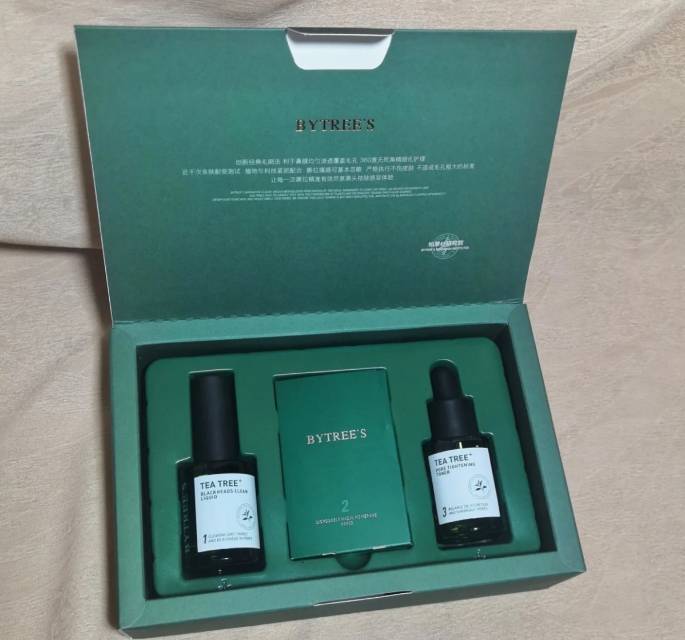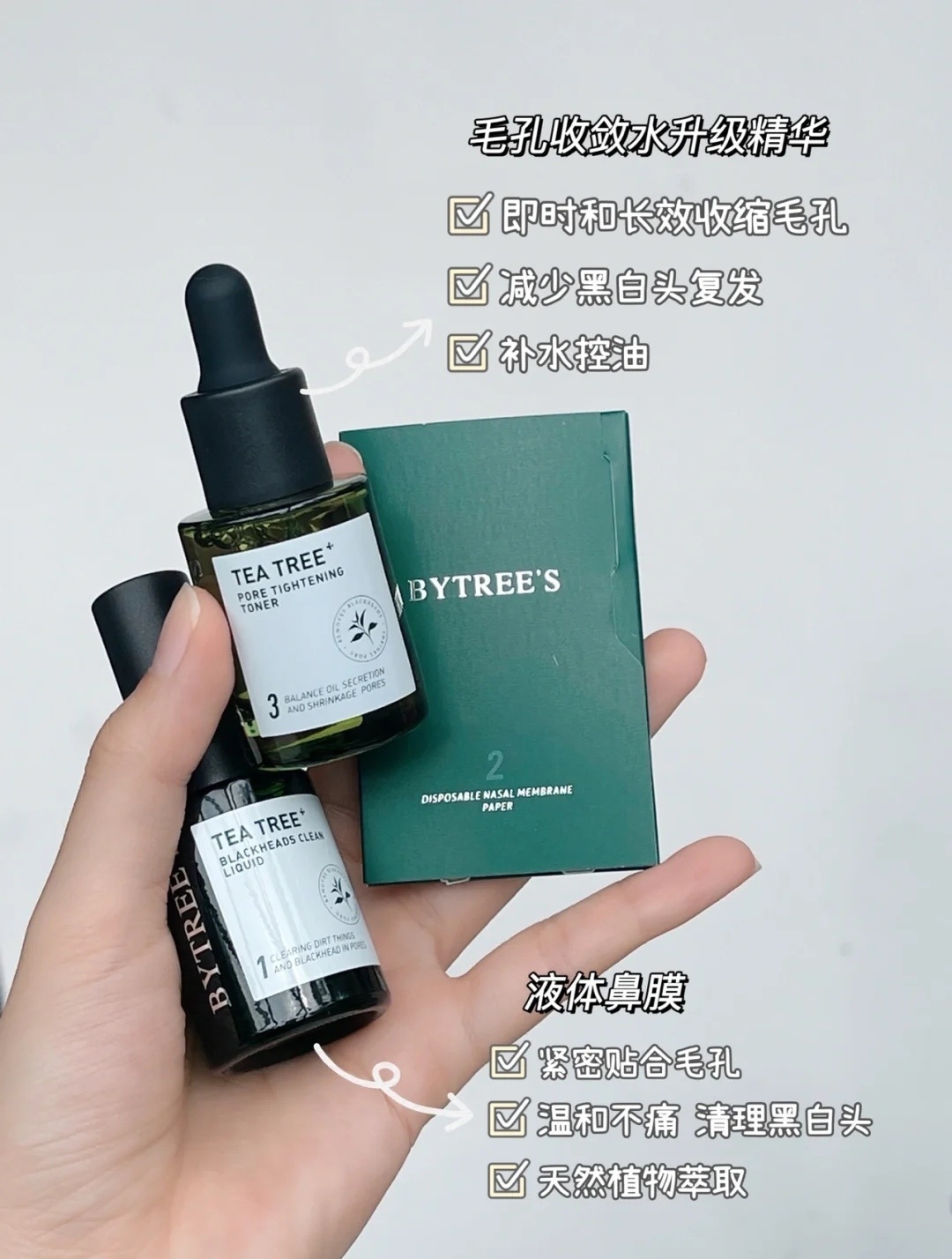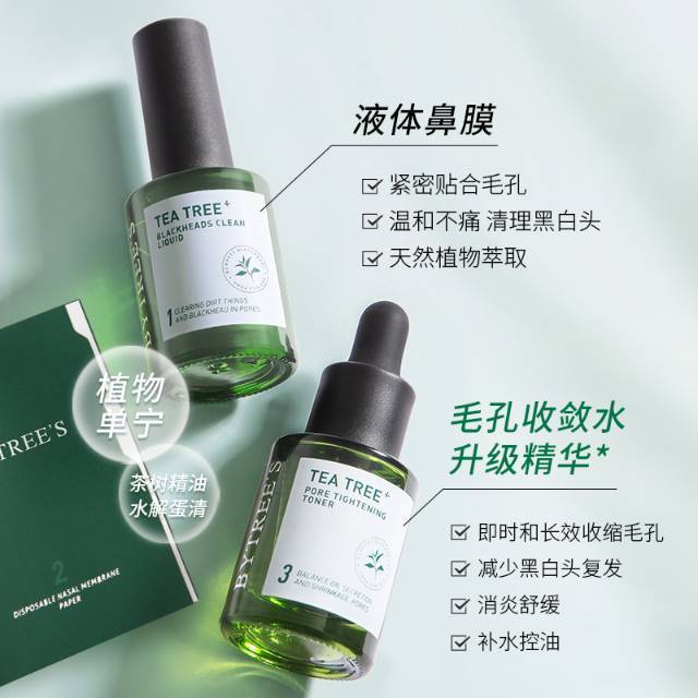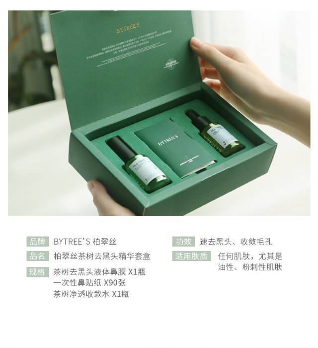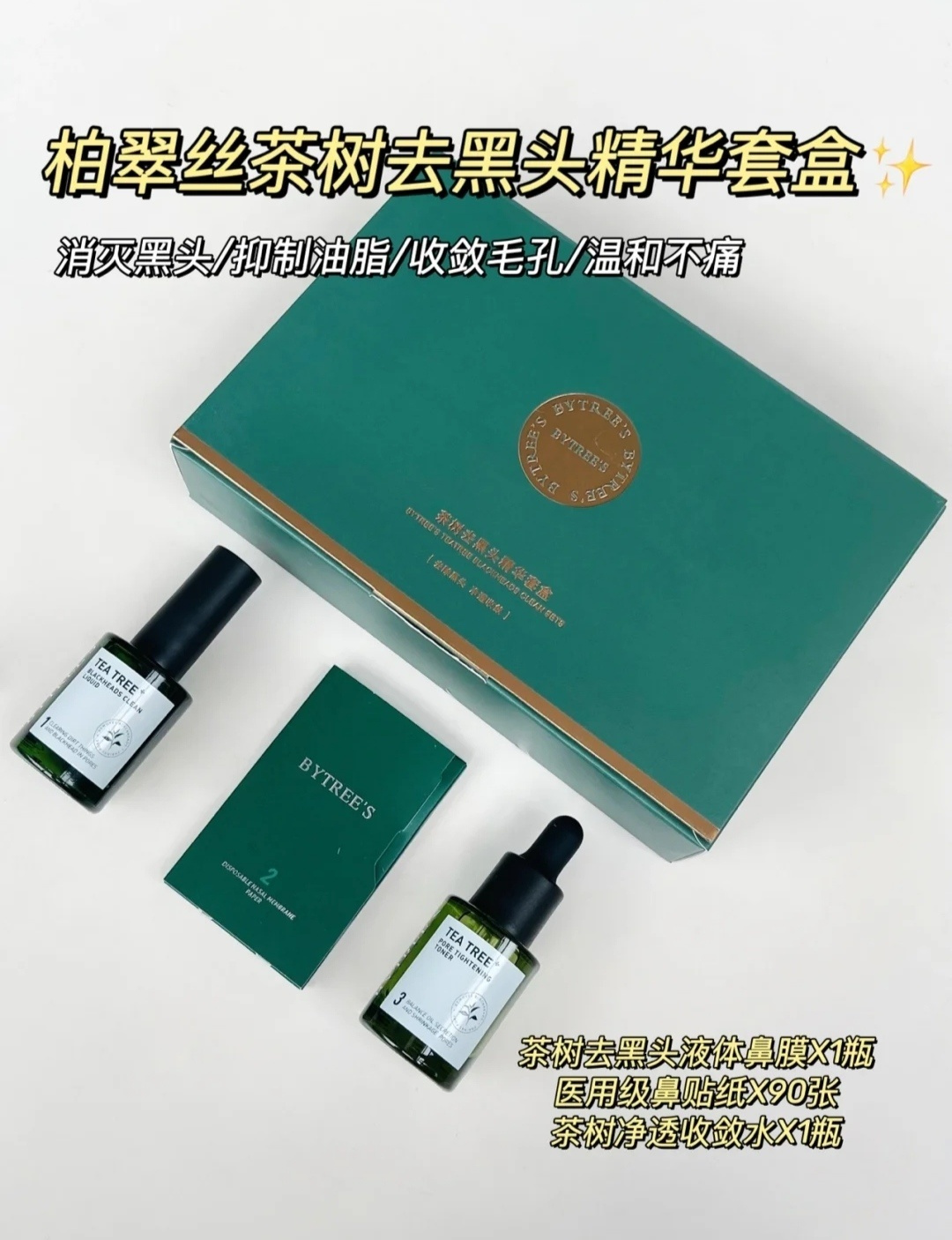 【名称】BYTREE'S柏翠丝茶树去黑头精华套盒 【品牌】BYTREE'S柏翠丝 【规格】鼻膜液13ml+收敛液15ml+鼻膜纸90片 【发货地】江苏泰州 【快递公司】申通 邮政随机 【发货时效】48-72小时 【不发货区域】:新疆、西藏以及疫情地区不发货,青海+1元/件 【售后政策】: 1,美妆护肤类产品不接受无理由退换货 2,如出现异常情况,请带面单+产品拍照并与我们联系,我们会第一时间处理,如产品有质量问题可在收货24小时之内,联系客服进行赔付换货或者补发 【关于过敏】 任何护肤产品都有可能会产生过敏,使用前请先进行局部测试观察24小时左右,遇到过敏情况请马上或者就医,过敏与个人体质,环境等因素有很大的关系,且每个人的过敏原不同,本店无法对过敏结果负责,请各位一定做好使用前的测试!