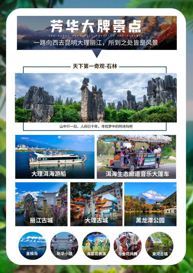 第十天:昆明 - 各地(芳华永驻):早上集合参观集散中心,之后专车送往机场,乘坐飞机返回各地,结束愉快的云南之旅。(餐饮:早;住宿:无 )