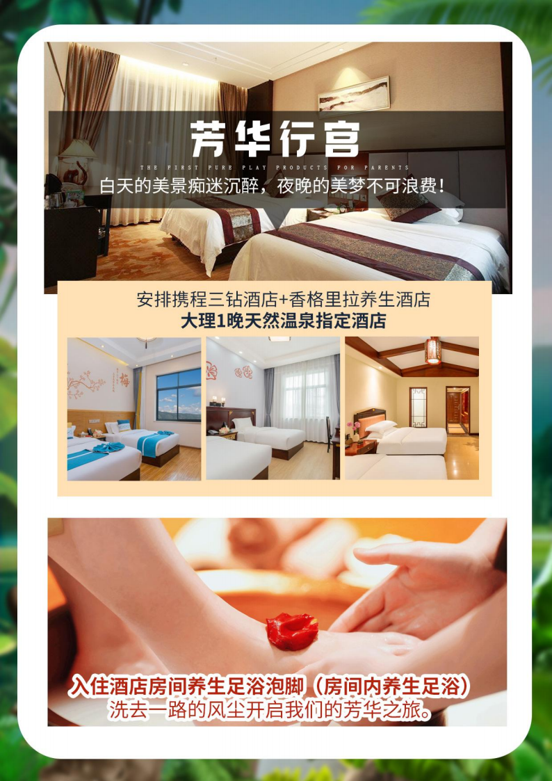 优质住宿安排:安排携程三钻酒店及香格里拉养生酒店,其中大理入住 1 晚天然温泉指定酒店,且入住酒店房间提供养生足浴泡脚服务,帮助爸妈缓解旅途疲劳。