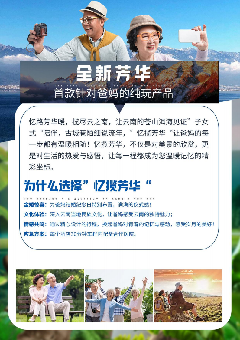 全方位贴心服务:全程提供行李无忧搬运服务;导游均有 10 年以上云南线带团经验,并经过老年心理关怀培训和急救知识培训,如同 “临时儿女” 陪伴左右;提供夜夜查房、餐餐巡桌、时时陪聊的暖心服务,让爸妈时刻感受到关怀。