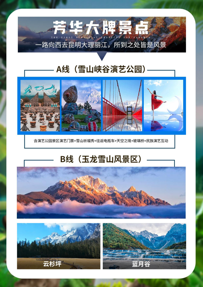 第四天:大理 - 丽江 - 玉龙雪山 / 雪山峡谷演艺公园 - 丽江古城(云端漫步):早餐后前往大理鹤庆新华小镇,体验传统银器手工技艺,可购买心仪银器。中餐后前往丽江,游客可根据自身情况在 A 线(雪山峡谷演艺公园)和 B 线(玉龙雪山风景区)中选择其一(因丽江实行一卡通提前制卡门票,报名时需确定,当地不可调换,65 岁以上建议选择 A 线 )。A 线可体验雪山峡谷演艺公园的多种特色项目,欣赏东巴秘境魅力;B 线乘坐云杉坪索道饱览玉龙雪山风光,前往蓝月谷(不含电瓶车 60 元 / 人自理)。晚上可自行前往丽江古城夜游,品尝纳西地道小吃,体验古城烟火气。(餐饮:早、中;住宿:丽江指定酒店 )