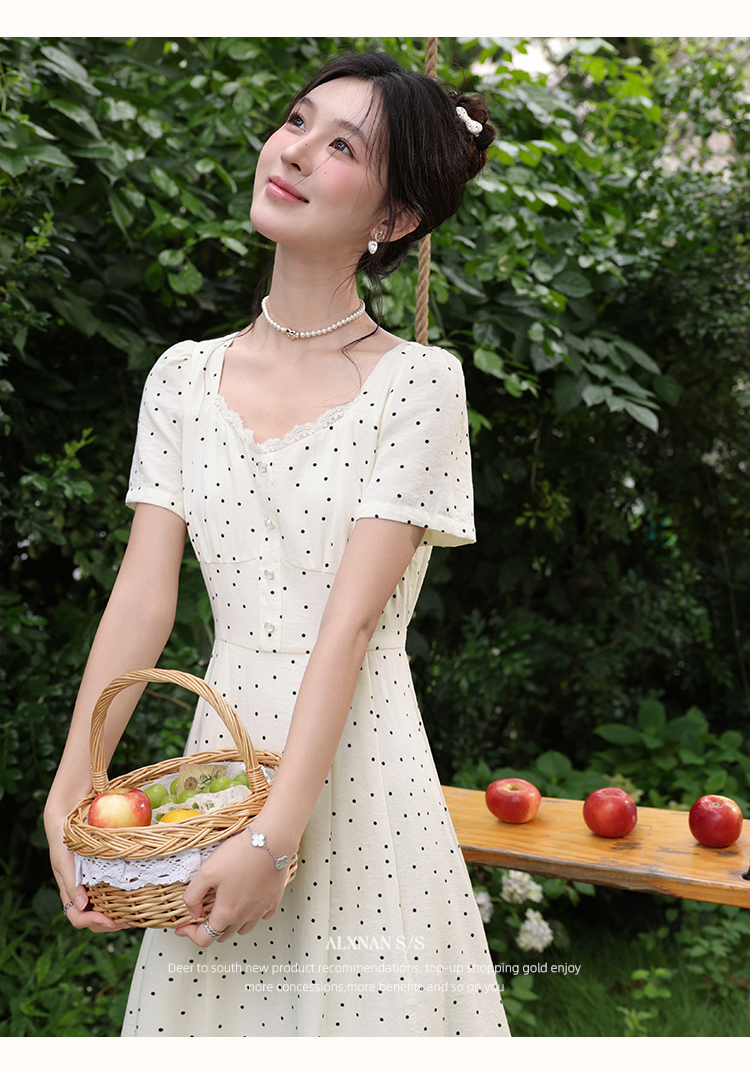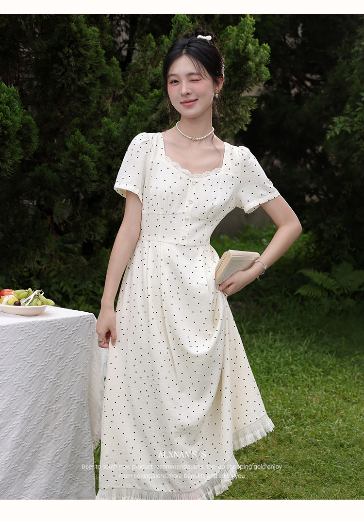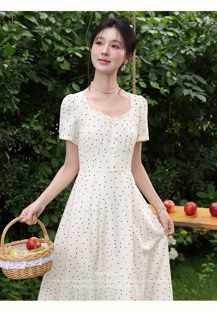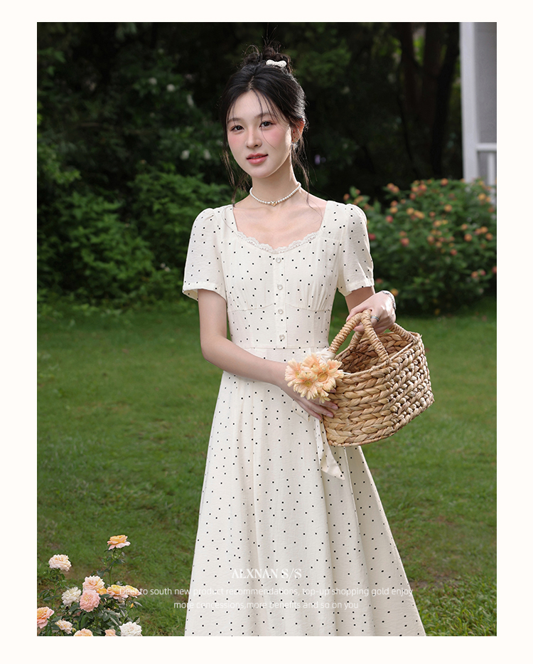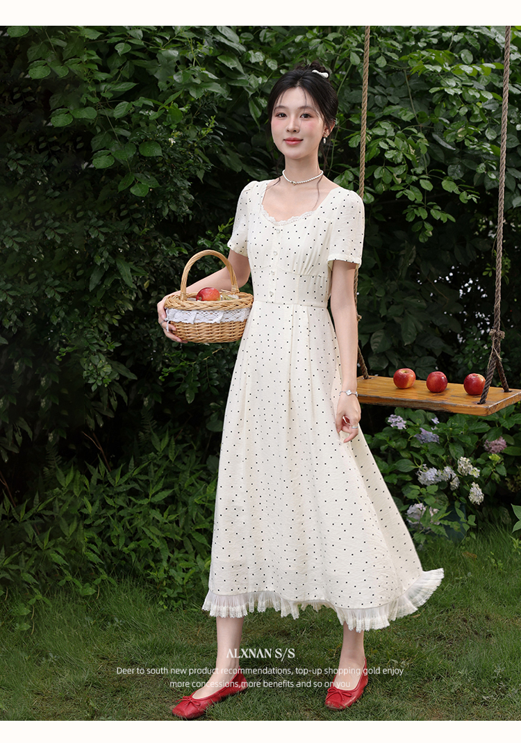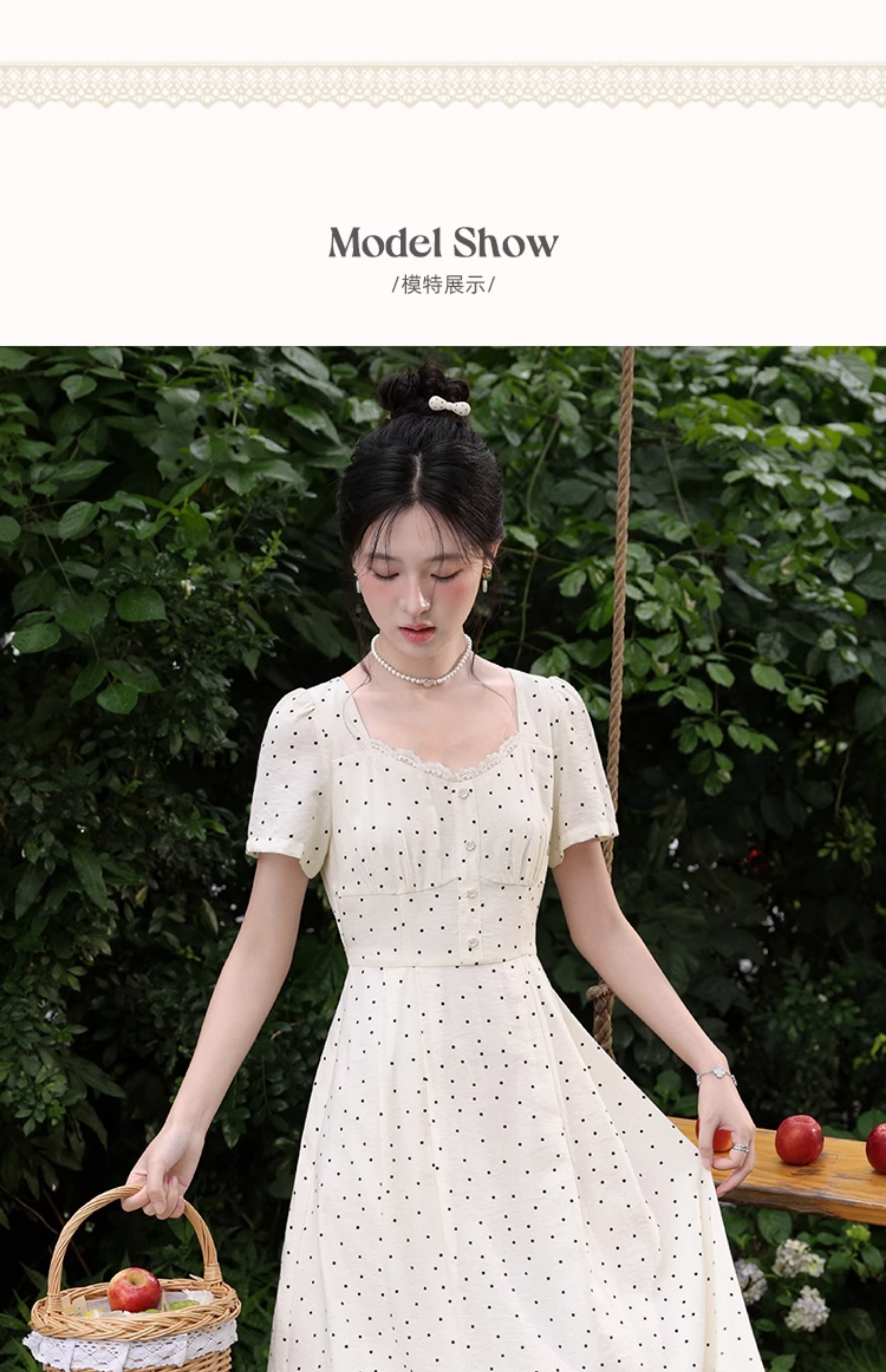 【65折秒杀】鹿向南「小步圆舞曲」法式波点短袖连衣裙女夏季新款气质白色长裙DYL661873