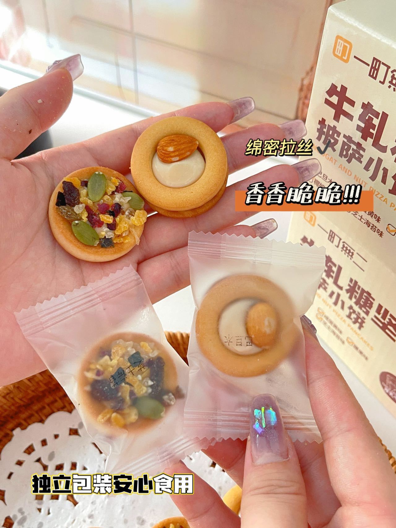 //【一町無二牛轧糖坚果披萨小饼】💥怎么这么好吃😋❗一款几种坚果跟果脯搭配的坚果小饼🙀🙀 ✅独立包装 方便携带 ✅营养丰富 口感酥脆 ✅绵密拉丝 奶香浓郁
