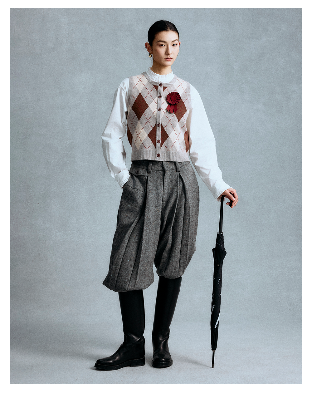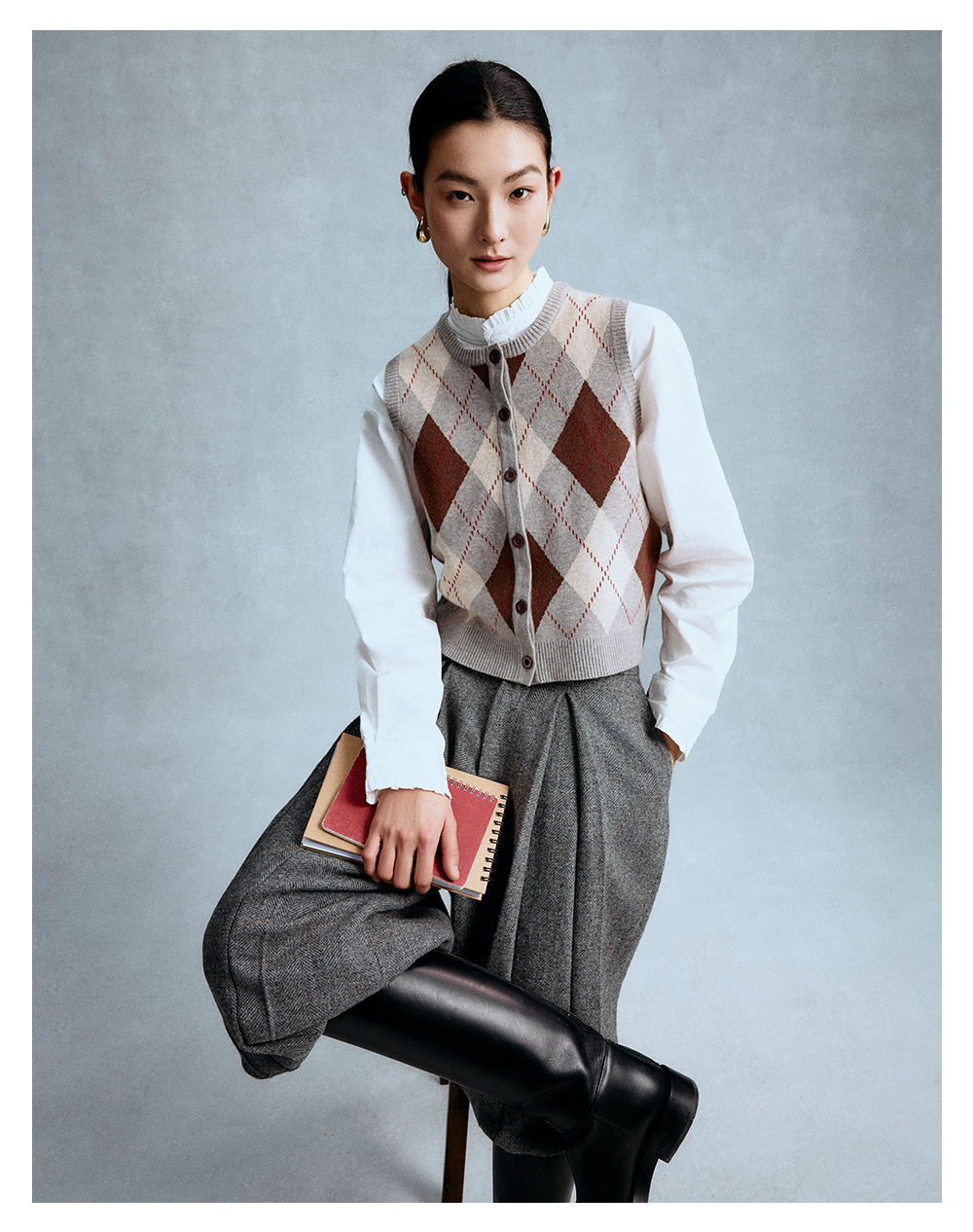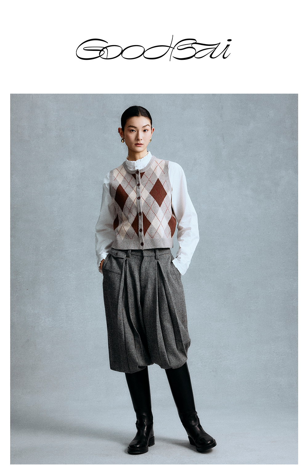 GOODBAI 菱格纹撞色提花圆领纽扣宽松针织背心