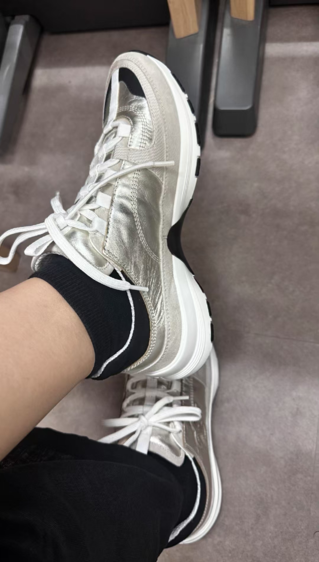 这双应该会成为近期最爱了,很独特的香槟金、淡金色很好搭配,而且超出预期的好穿,在鞋里没有束缚感,连鞋底都是那么好看,鞋尾的小香标很精致。