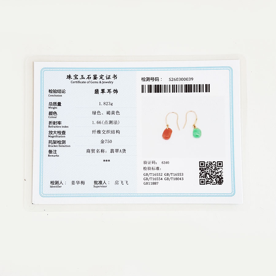 【天然正品】A货翡翠AU750玫瑰金镶天然细腻糯种方型红翡绿翠鸳鸯款翡翠耳坠280226NJS80