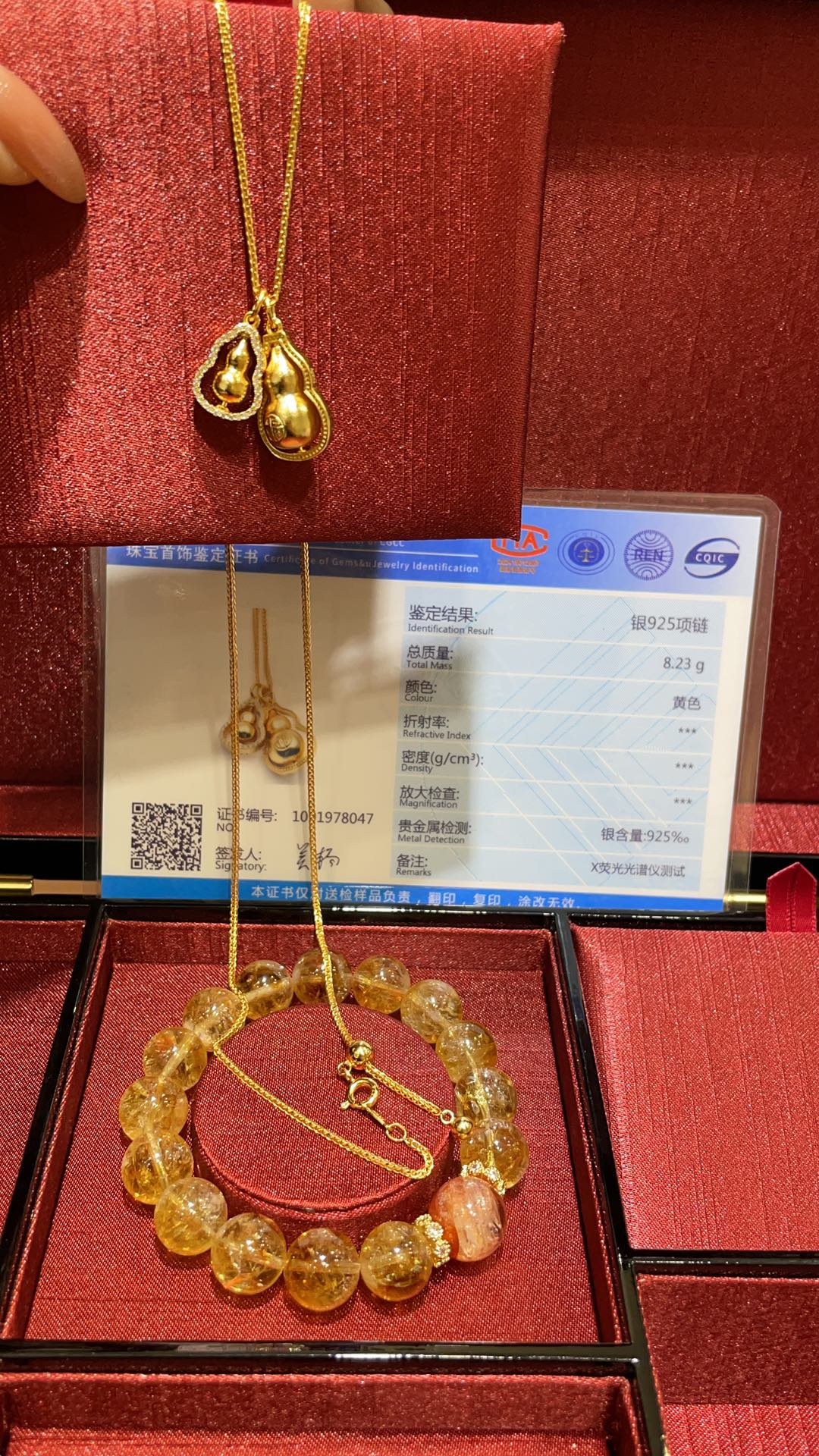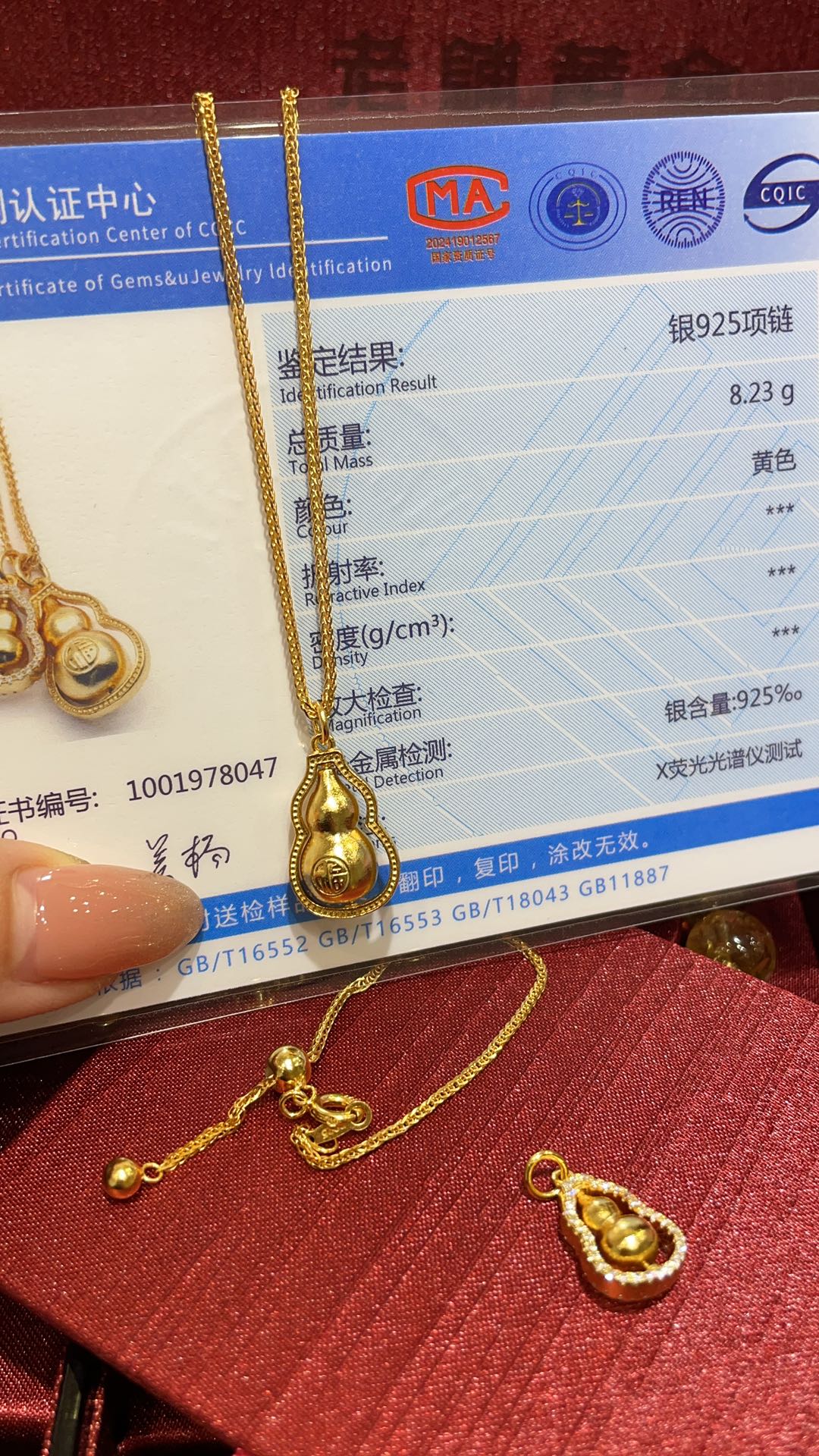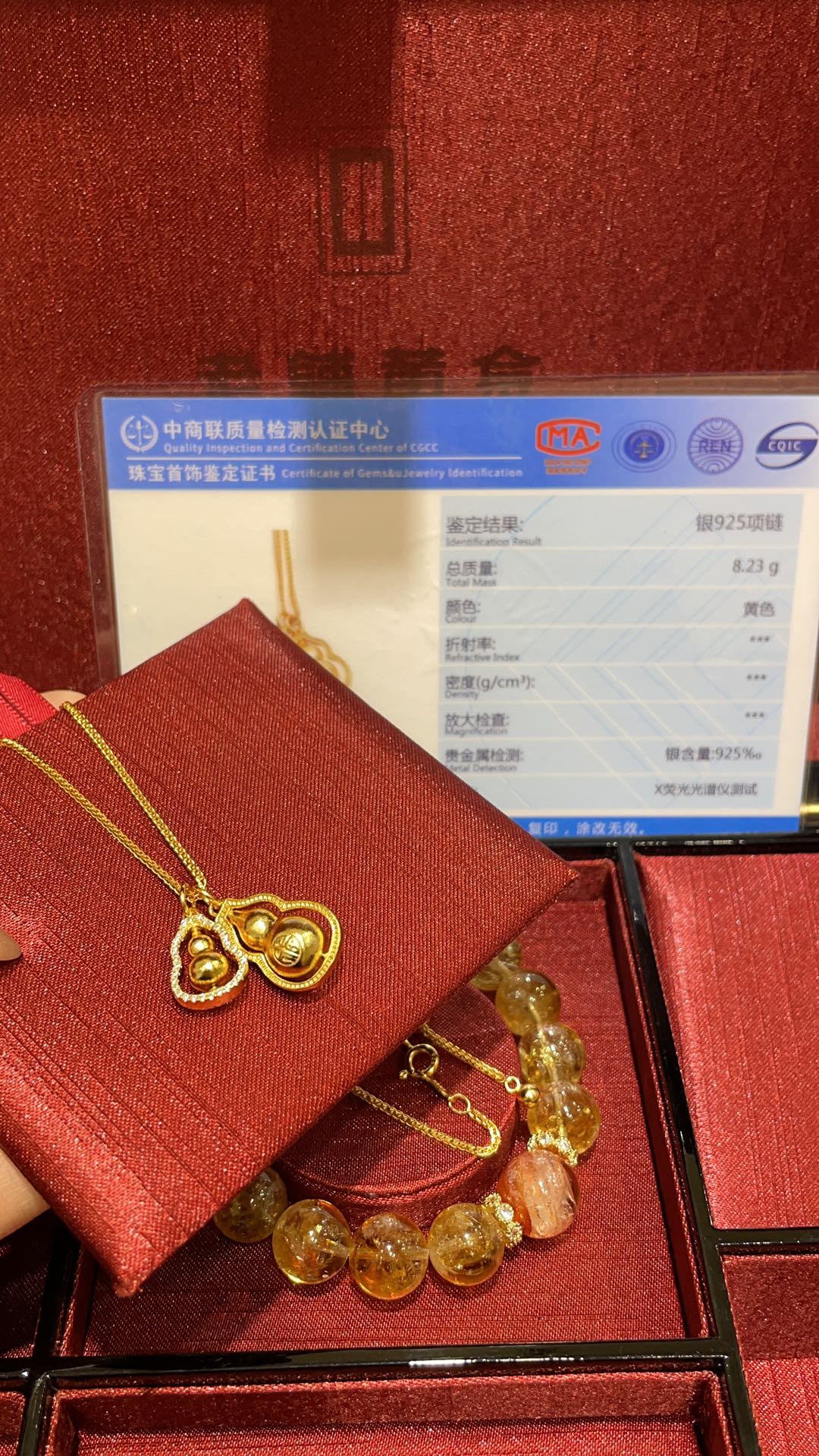 B家 时来运转金色镶钻福字立体双葫芦吊坠项链